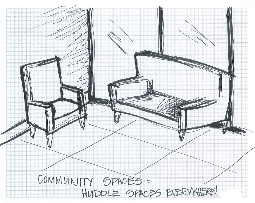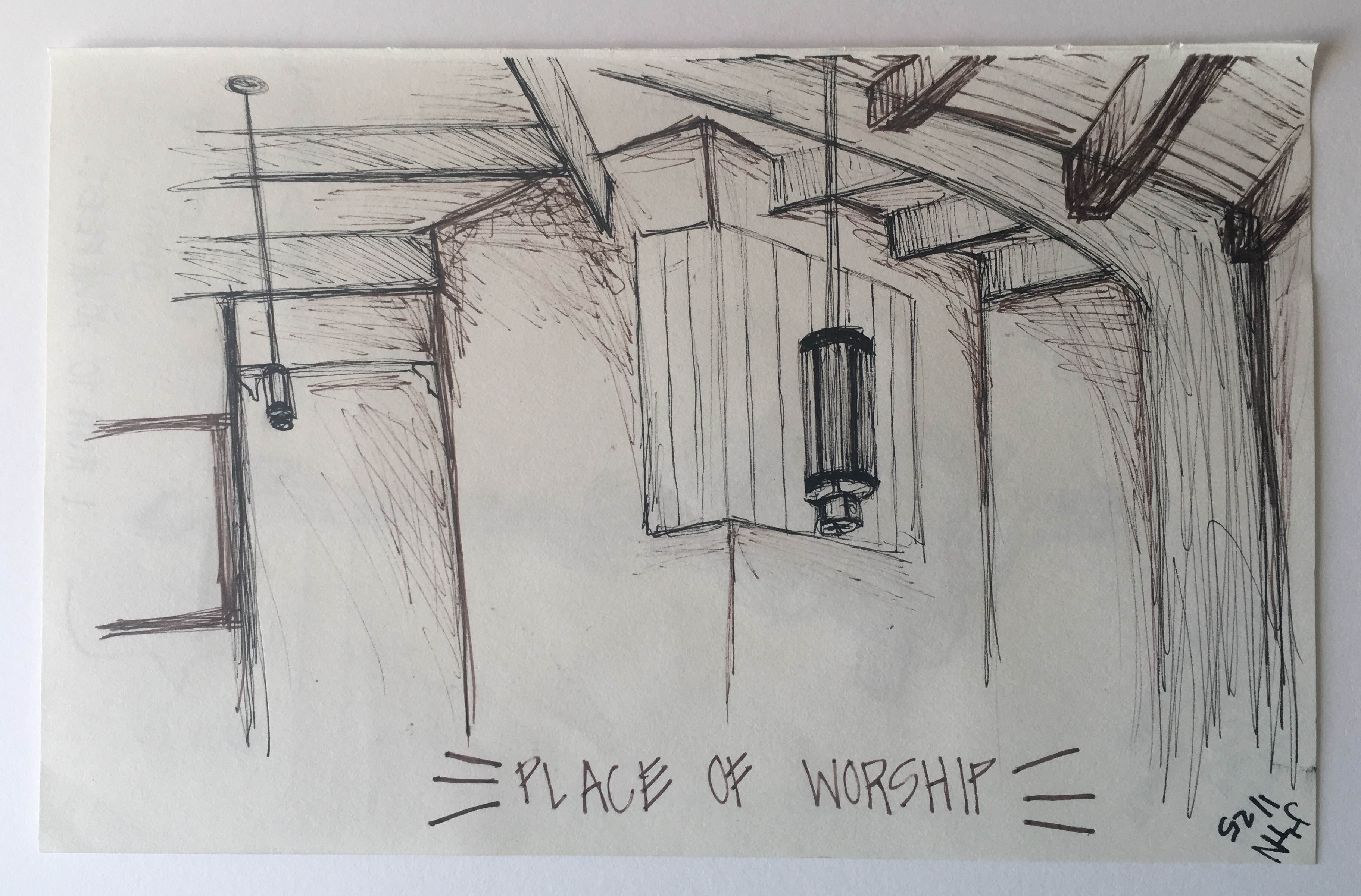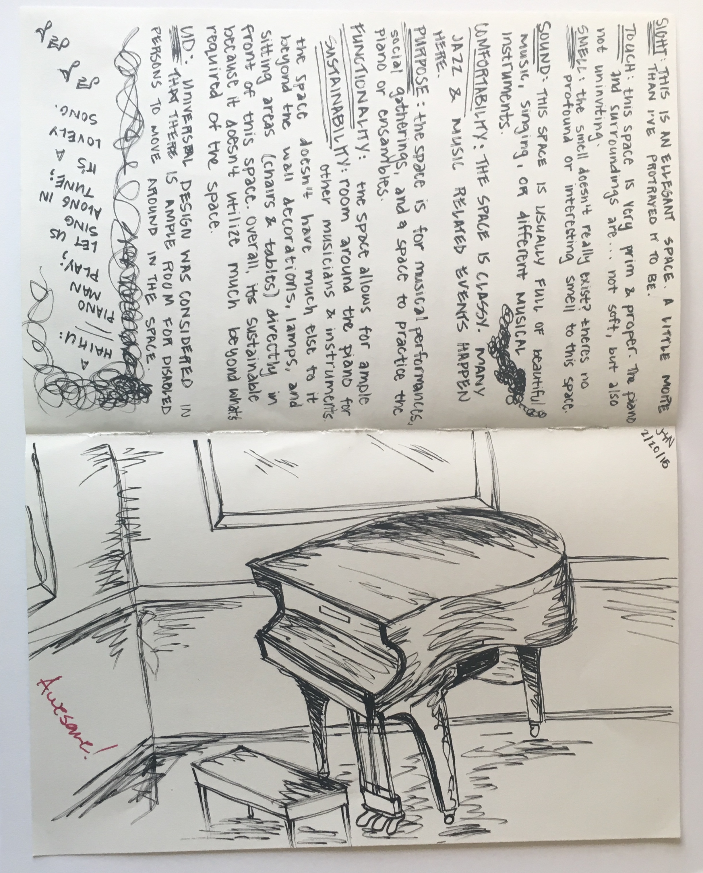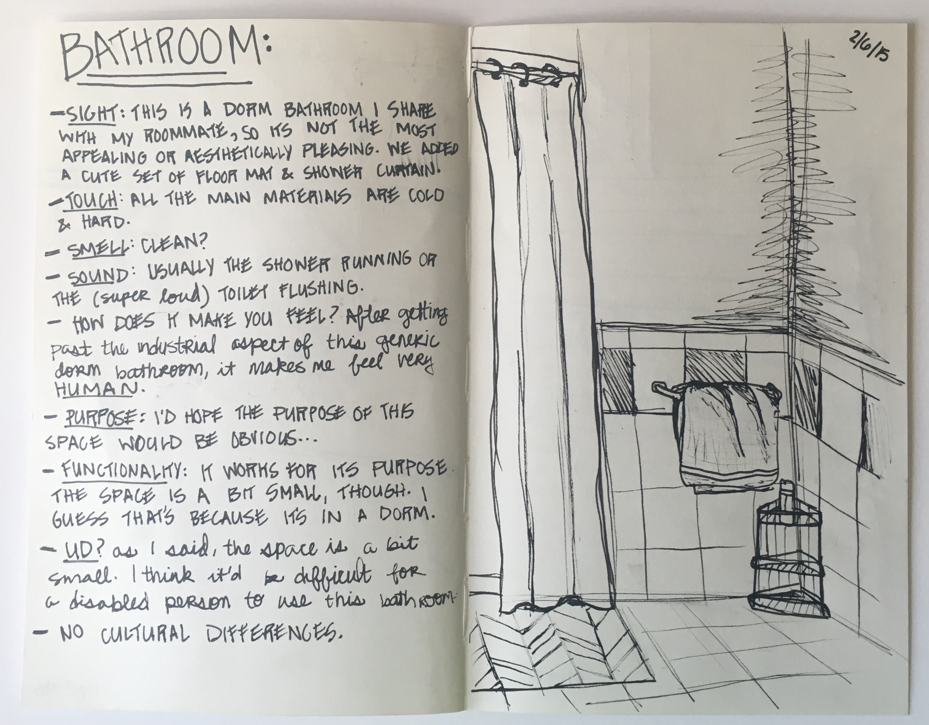 As part of the Interior Design program at UNT, we were required to sketch interior spaces from our lives. We had to journal about the spaces, discussing how they affected the senses, their purpose and functionality, and other factors that play into how a space is used.