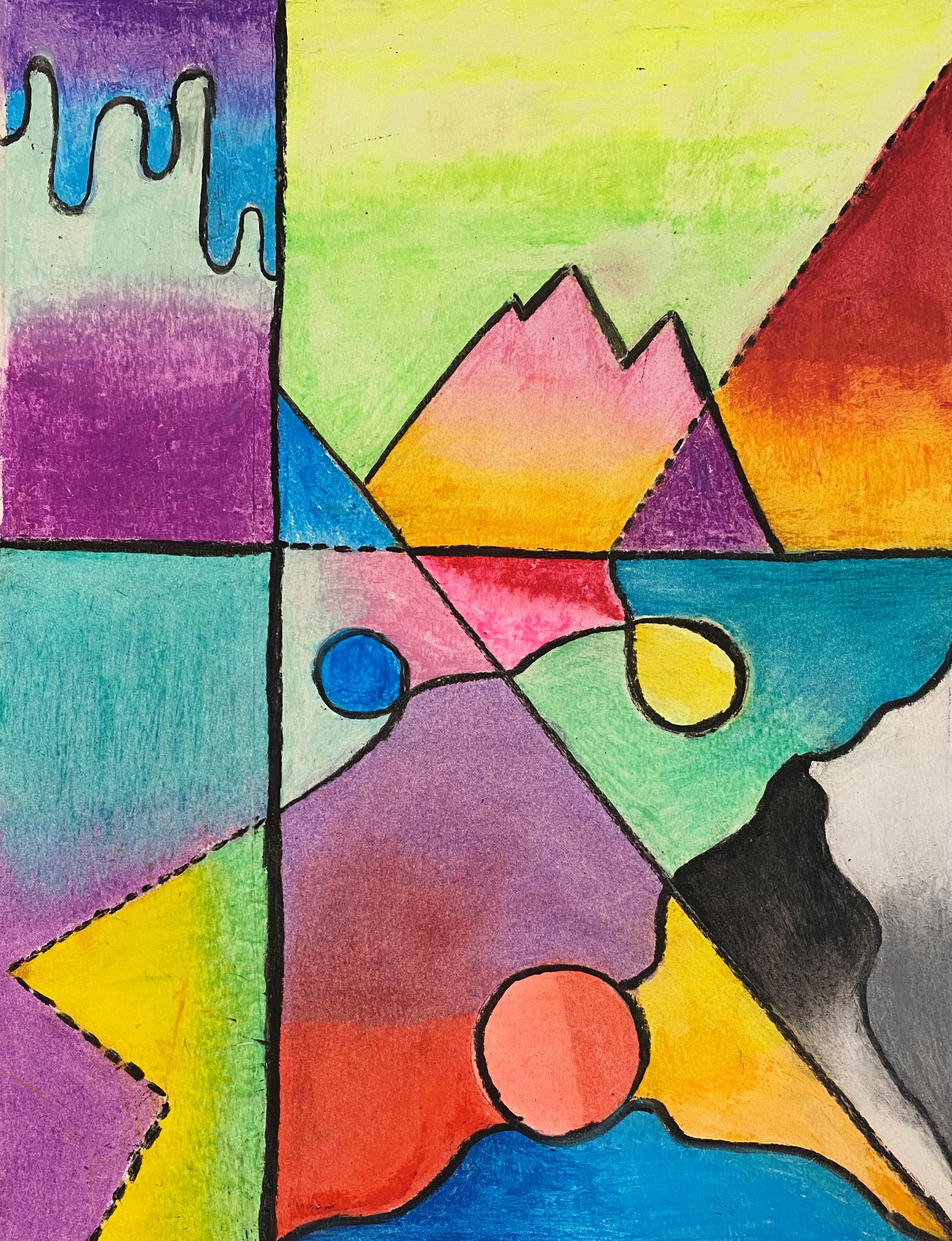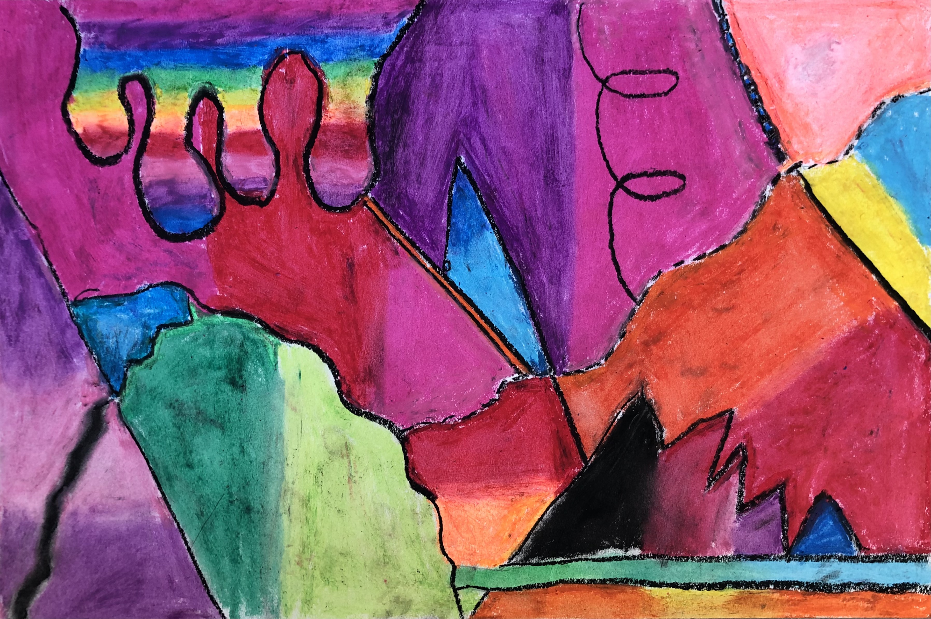 Students created a composition using lines. Students were required to use at least one of each of the following lines: straight, curvy, zig-zag, dashed, and a line with a loop. Students were allowed to add more lines, combine line types, and were encouraged to experiment with different line qualities.