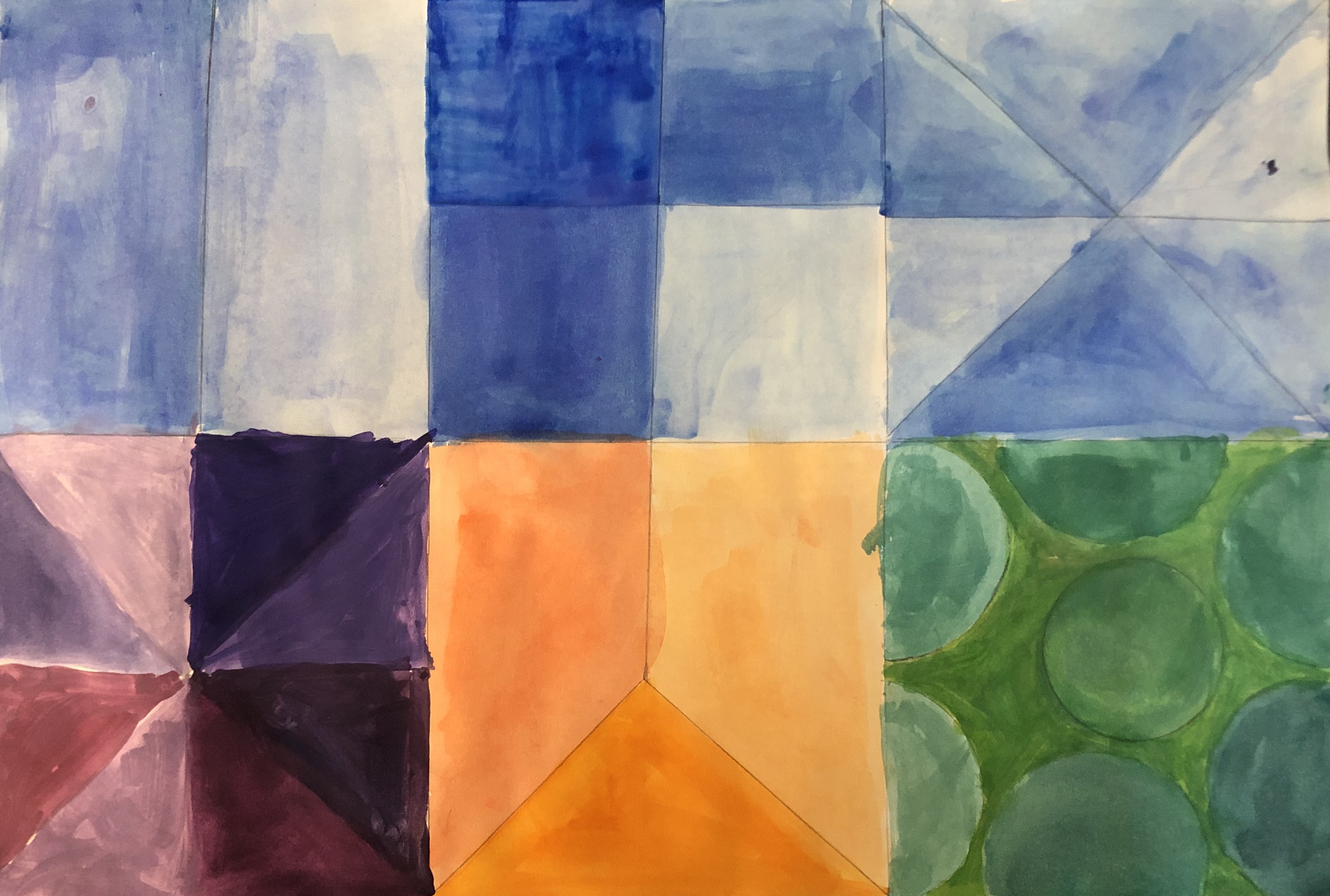To paint their papers, students chose a primary color for their top three sections. Students painted their next section with the complementary color of their top row. Finally, the last two boxes were painted with analogous colors to their top row.