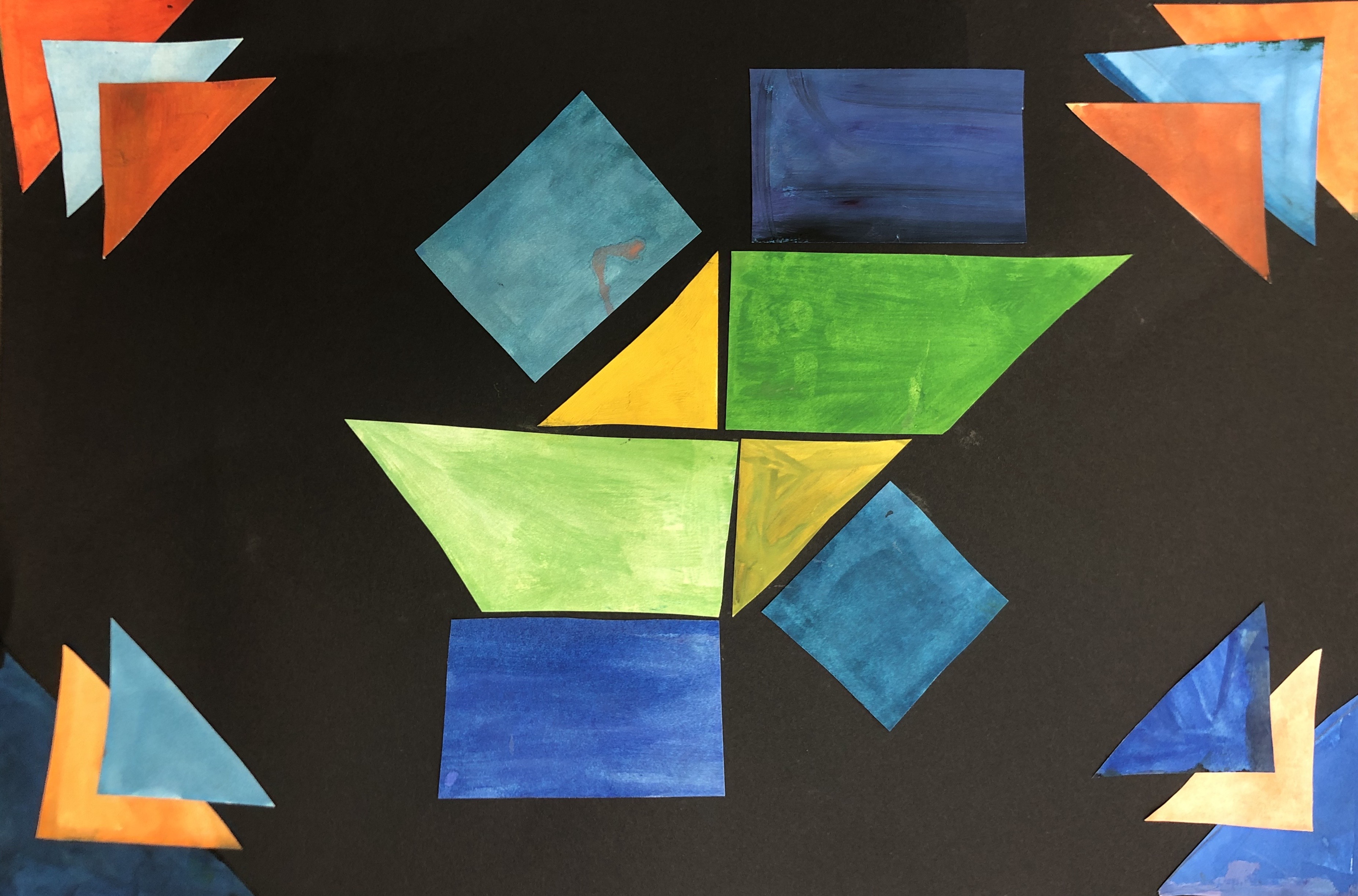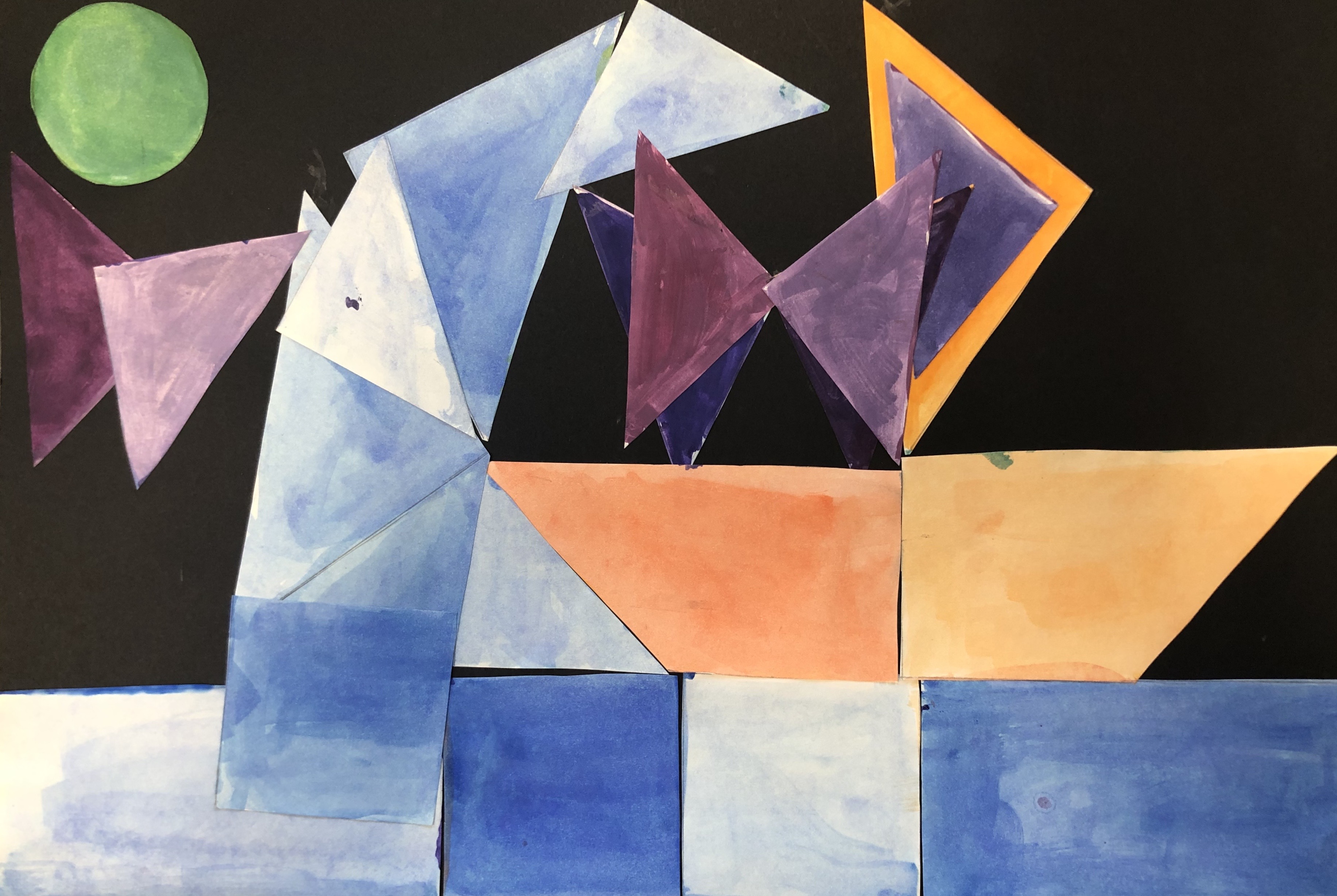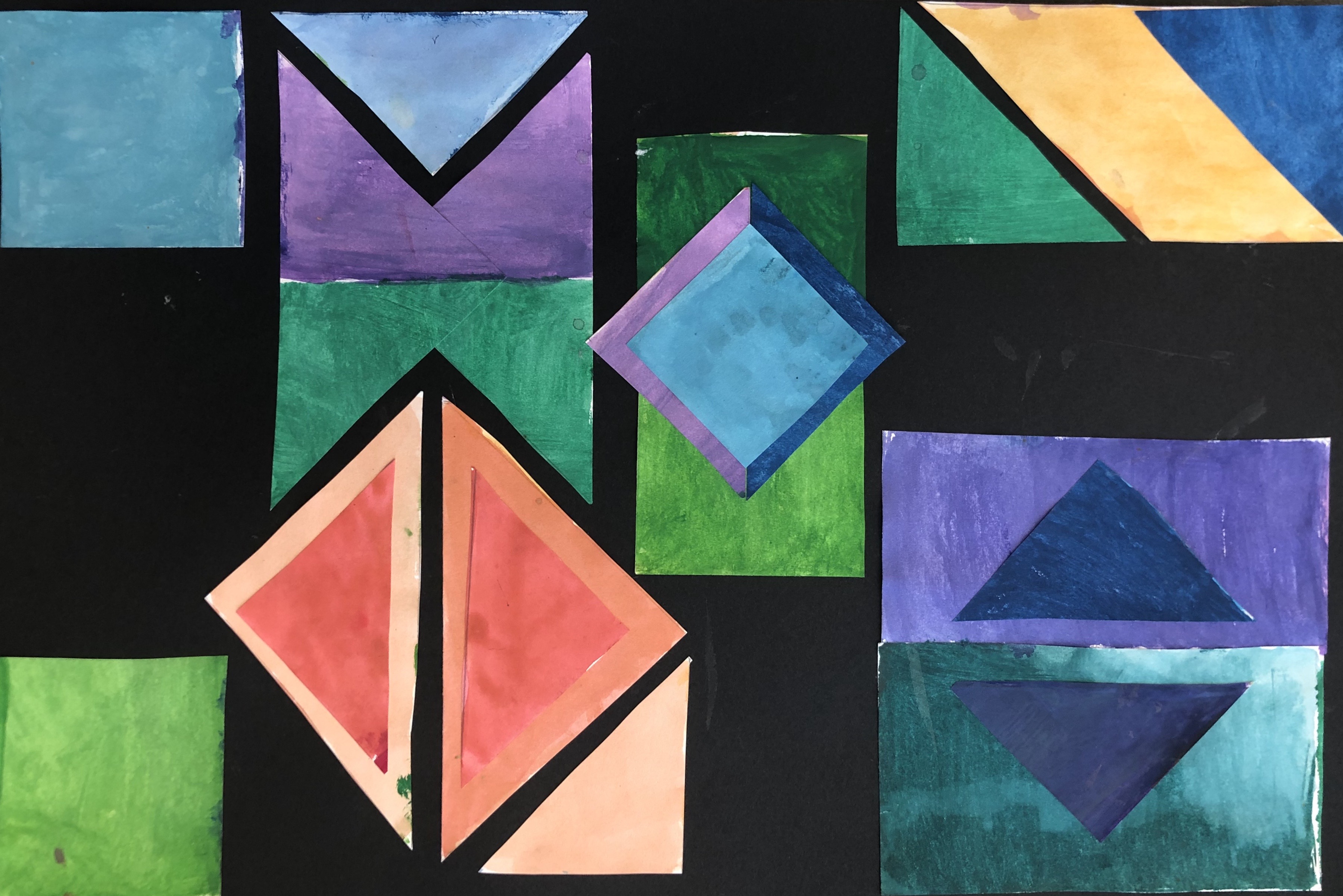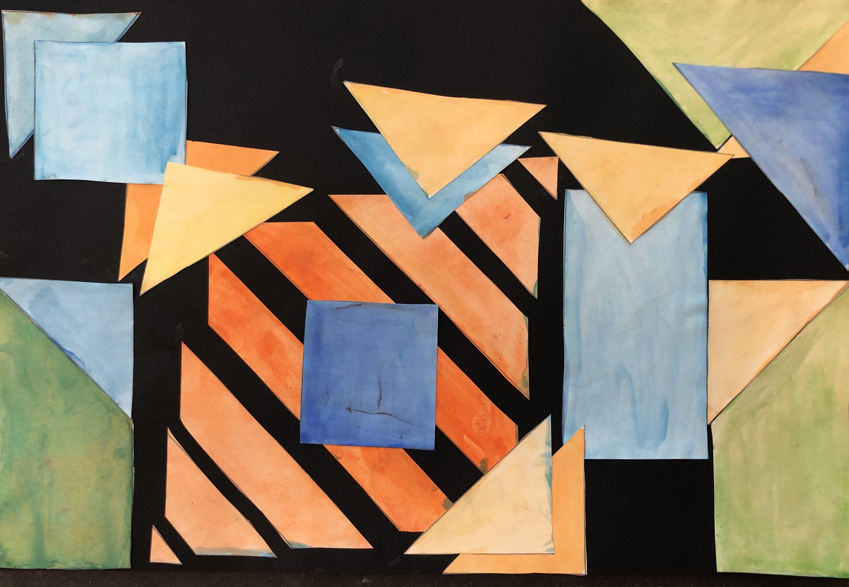 After their papers had dried, students cut up their paper along the lines we originally drew. This gave them many different shapes and sizes of shapes to use to create their collage. Students were instructed to test out various compositions before gluing down any of their peices.