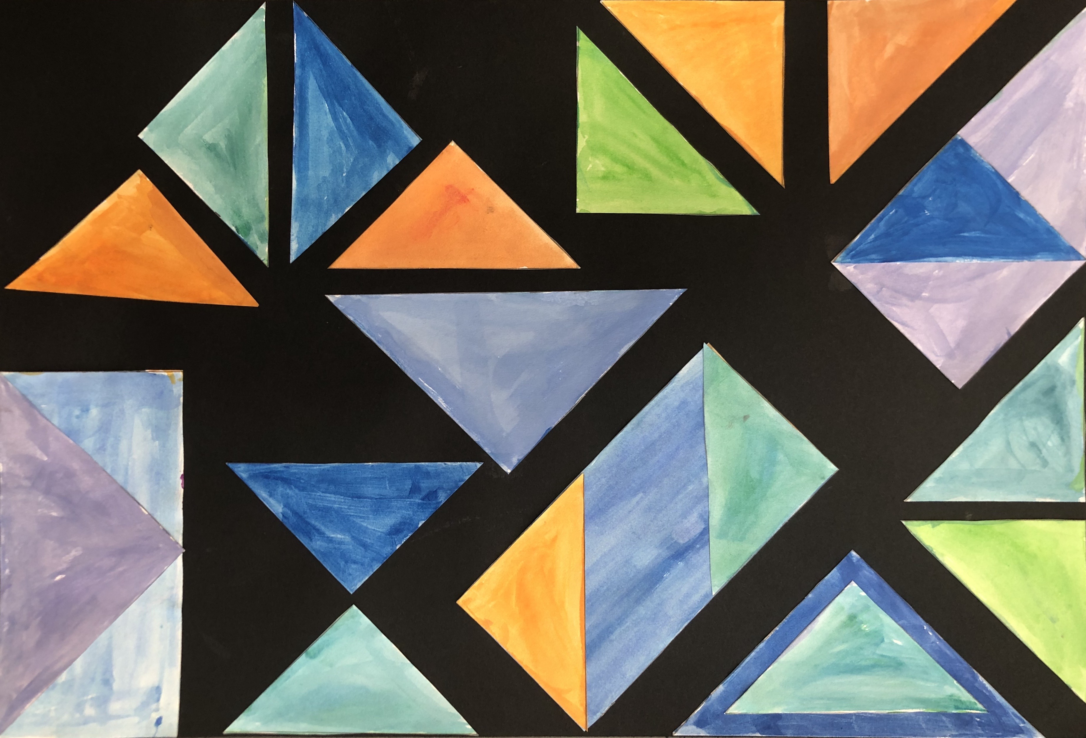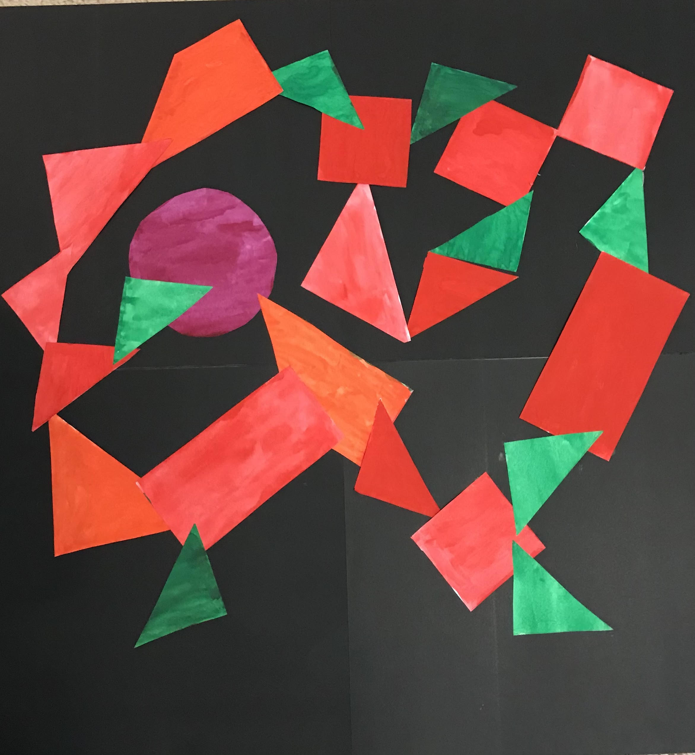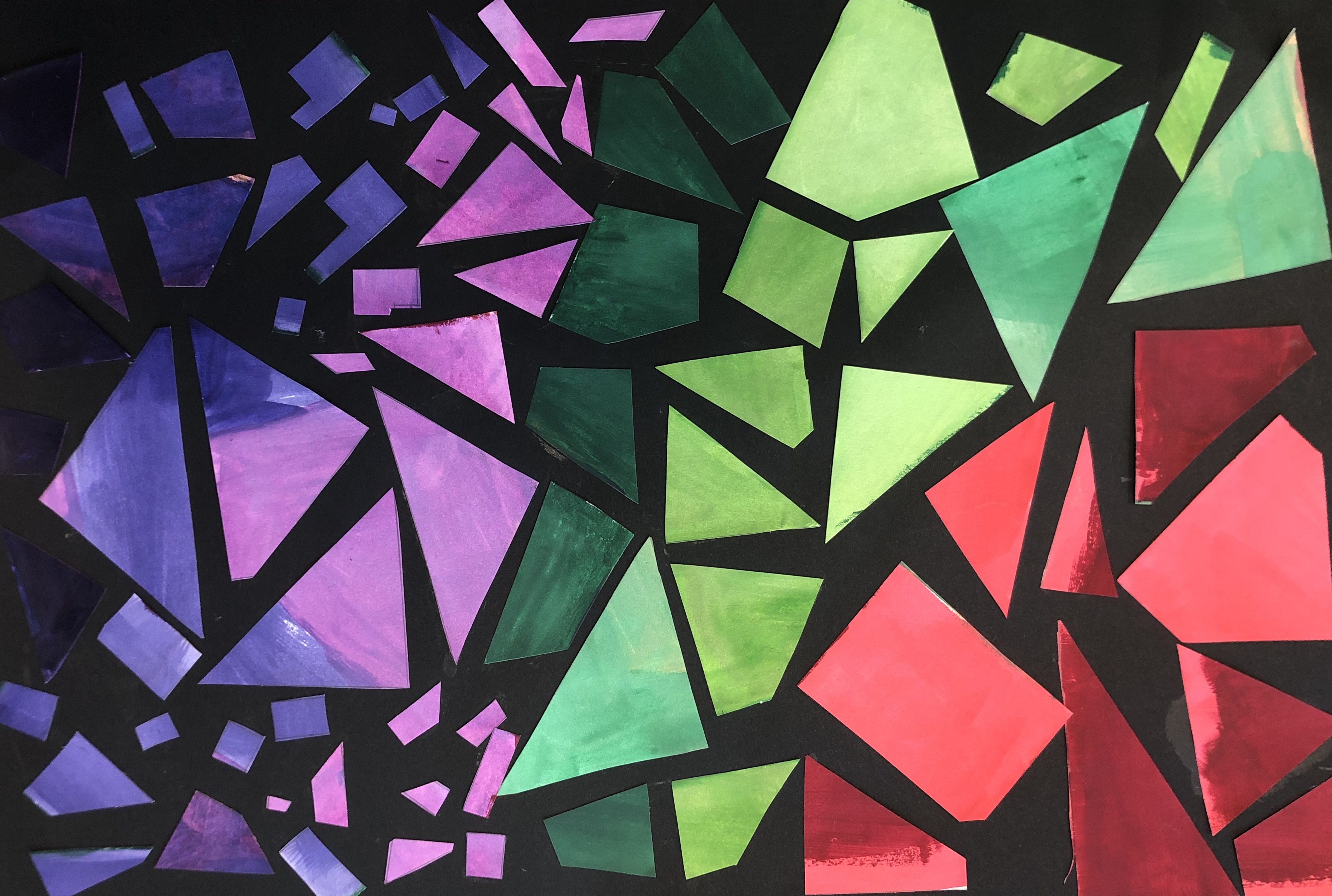 After their papers had dried, students cut up their paper along the lines we originally drew. This gave them many different shapes and sizes of shapes to use to create their collage. Students were instructed to test out various compositions before gluing down any of their peices.