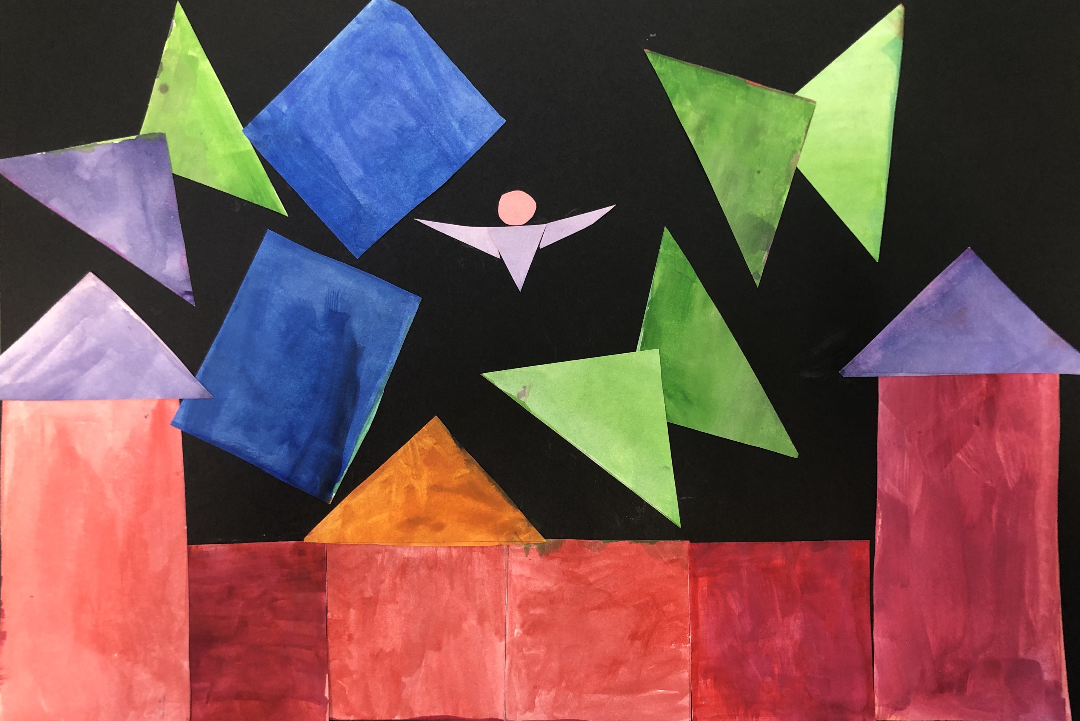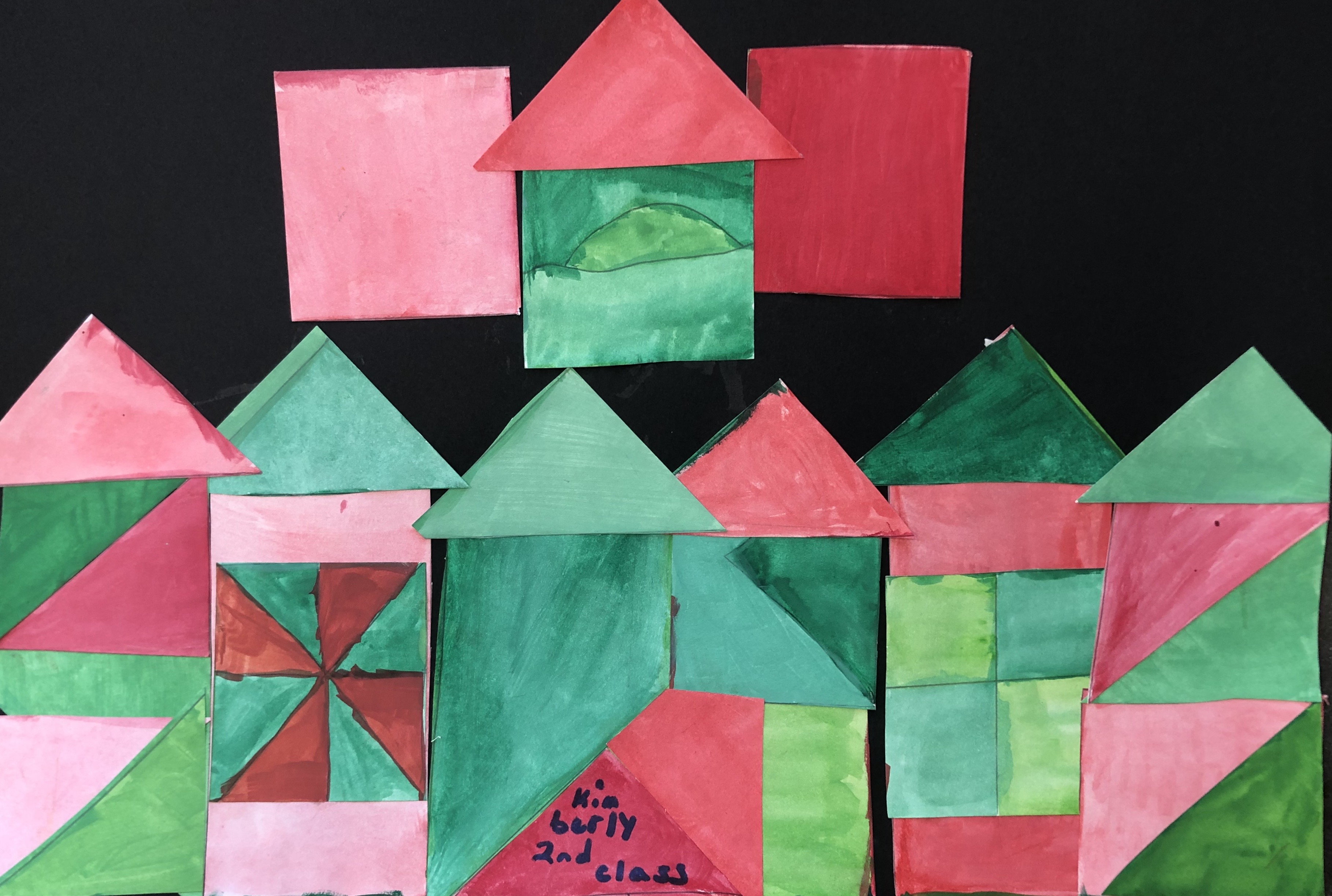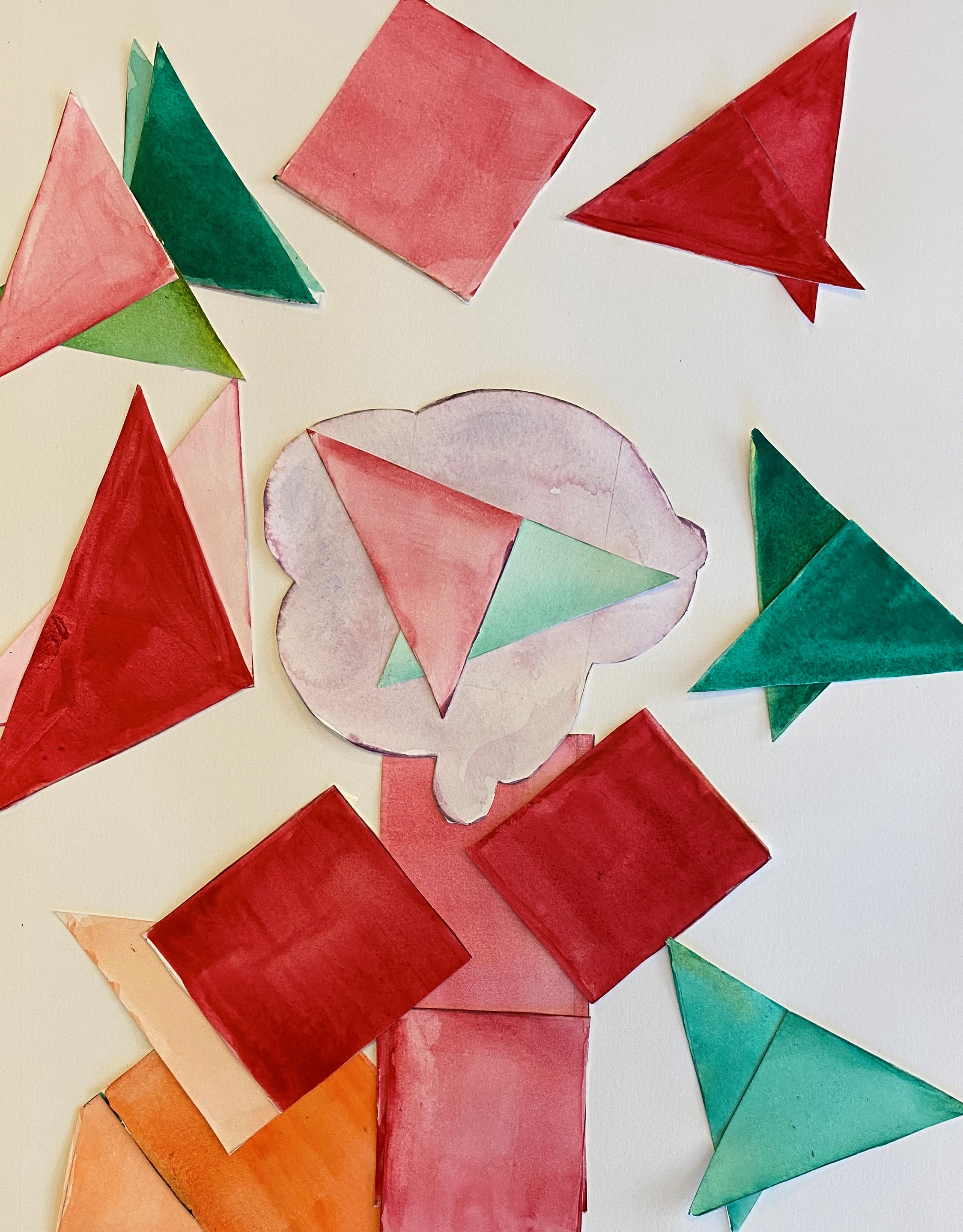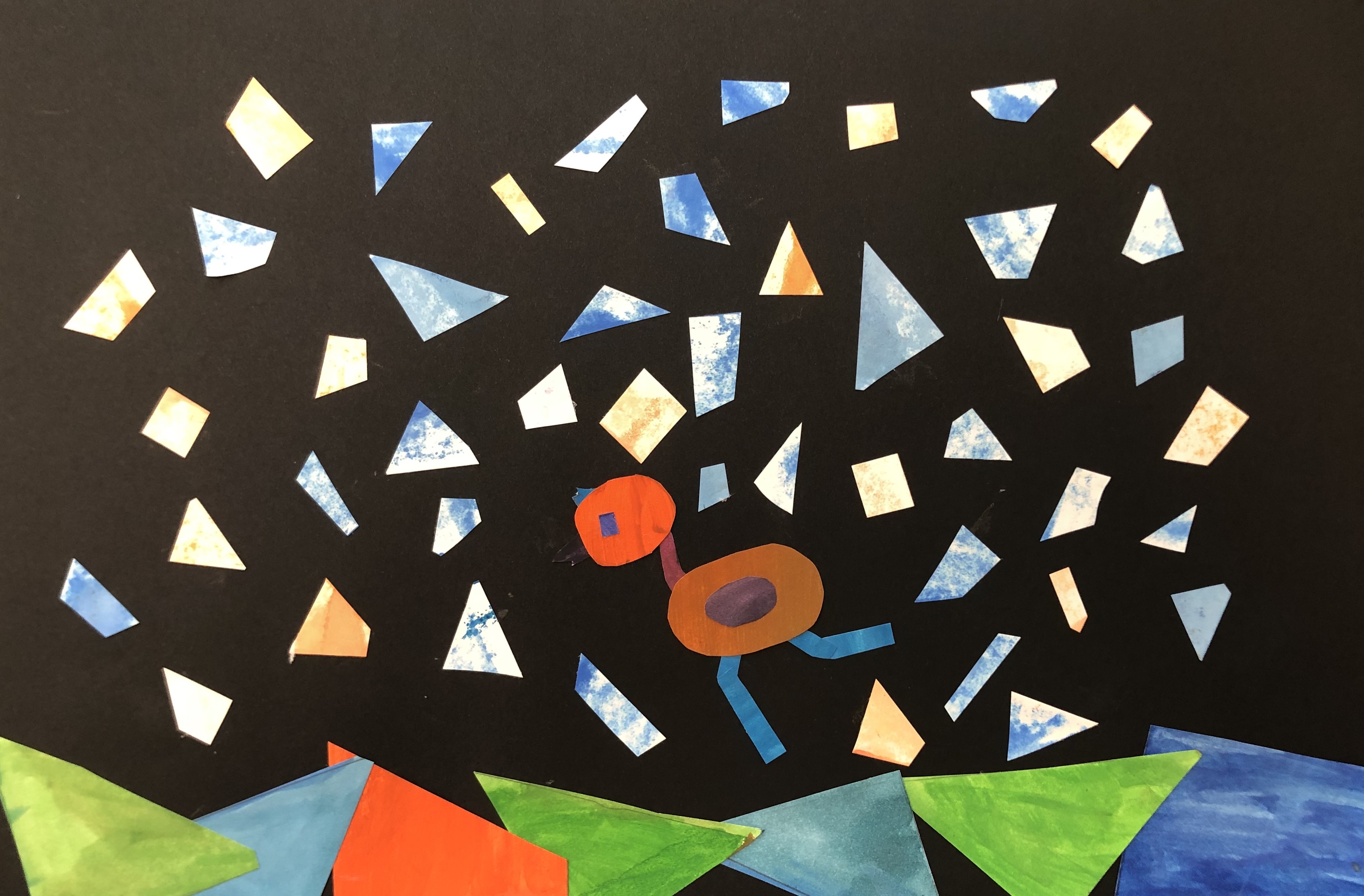 After their papers had dried, students cut up their paper along the lines we originally drew. This gave them many different shapes and sizes of shapes to use to create their collage. Students were instructed to test out various compositions before gluing down any of their peices.
