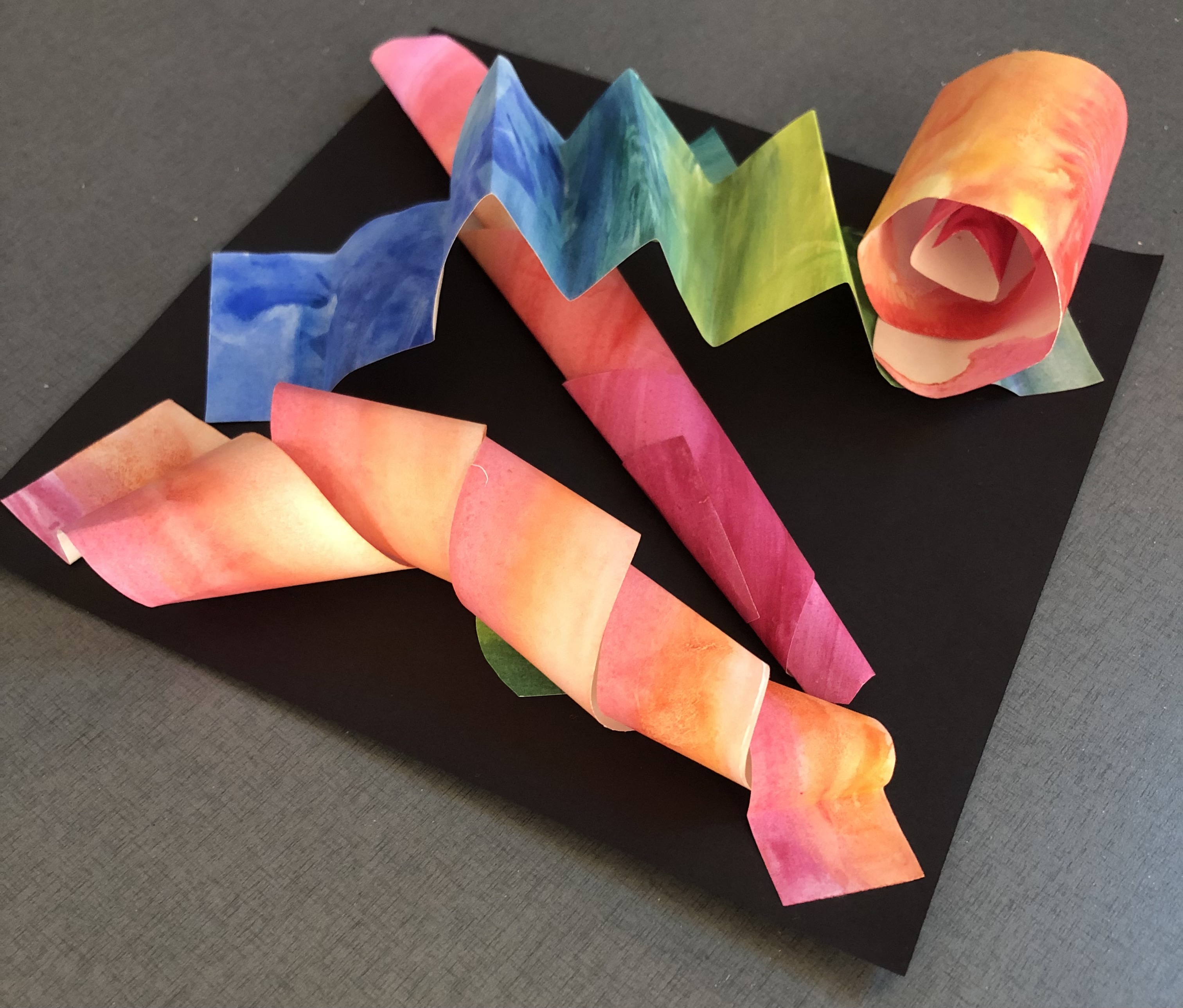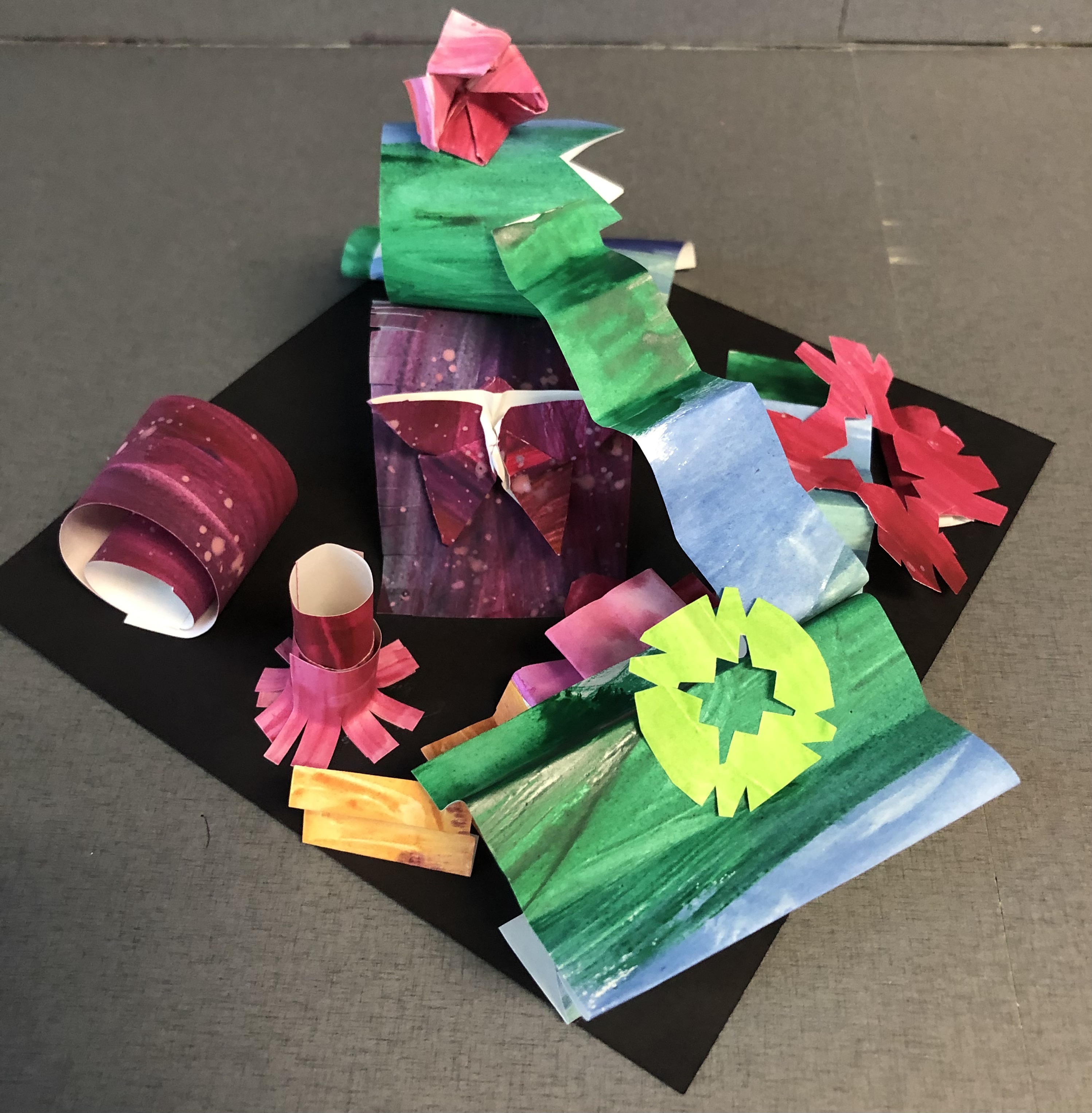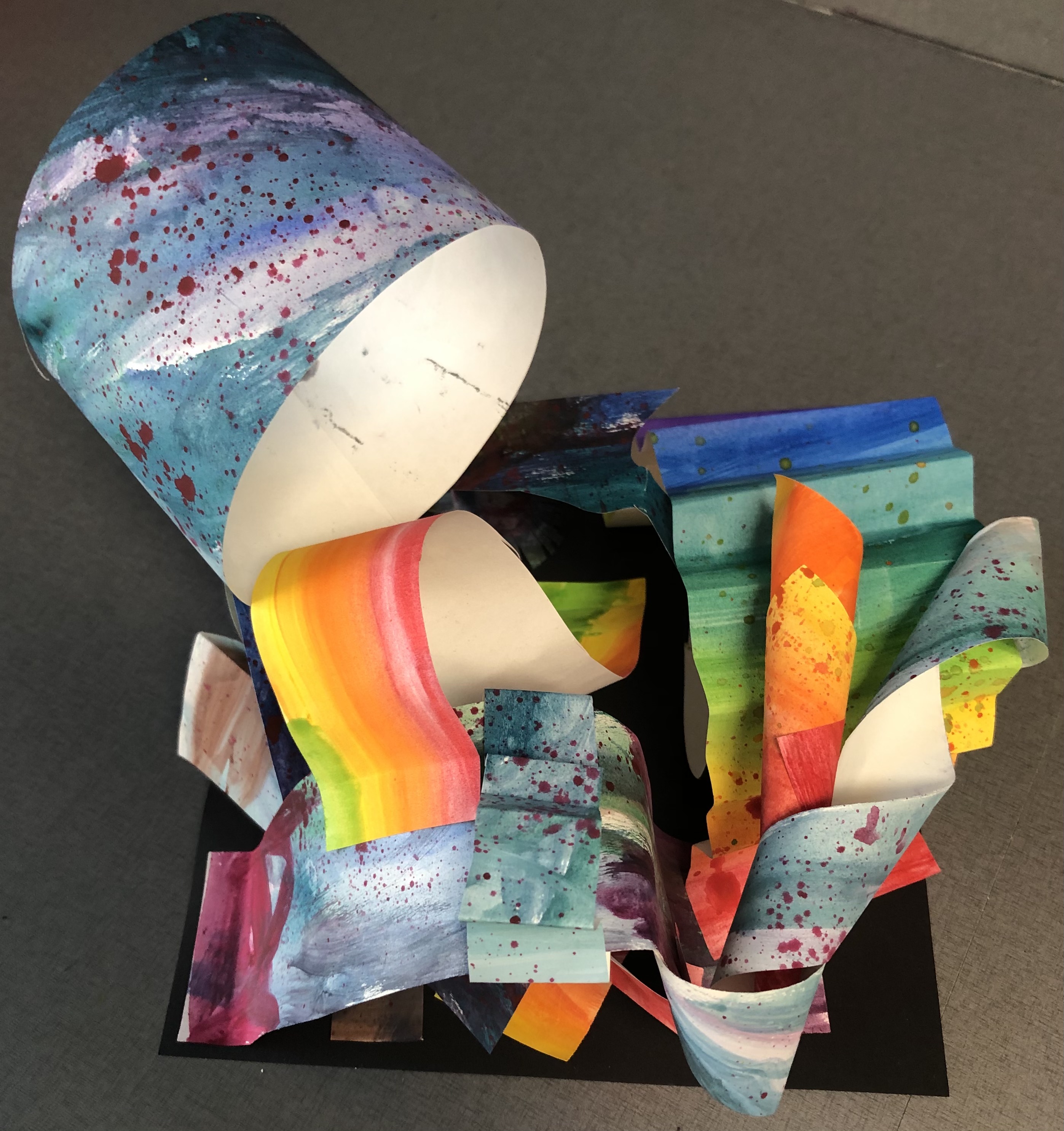 After learning and practicing various paper sculpting methods, students created their sculptures to demonstrate the use of form. Students were told to create various forms and try out many compositions before gluing their final sculpture to ensure that sculptures were balanced.