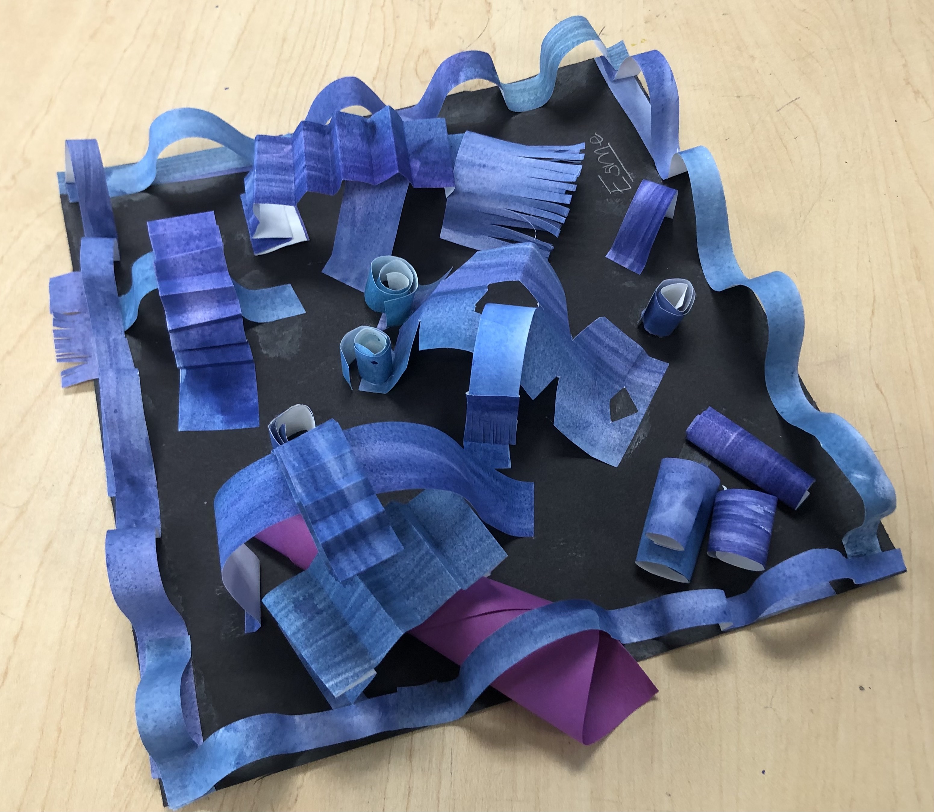 Students began by painting thin paper with watercolor to create a unique material for the project. They were given the option to use a color scheme when painting their paper since we had been talking about them throughout the semester. Students also explored various ways of painting with watercolors including mixing colors, blotting with paper and sponges, and adding other materials to change how the paint dries.