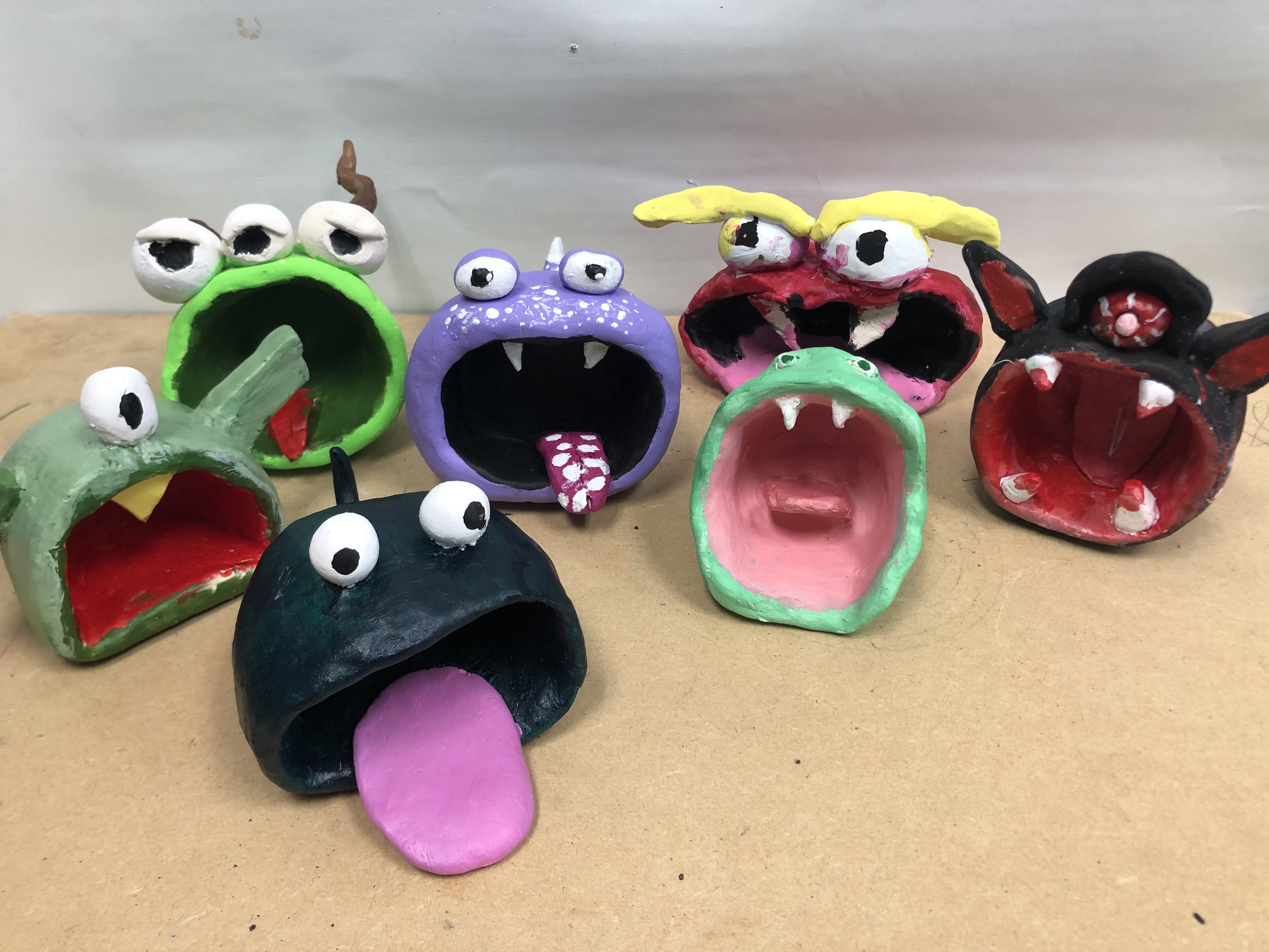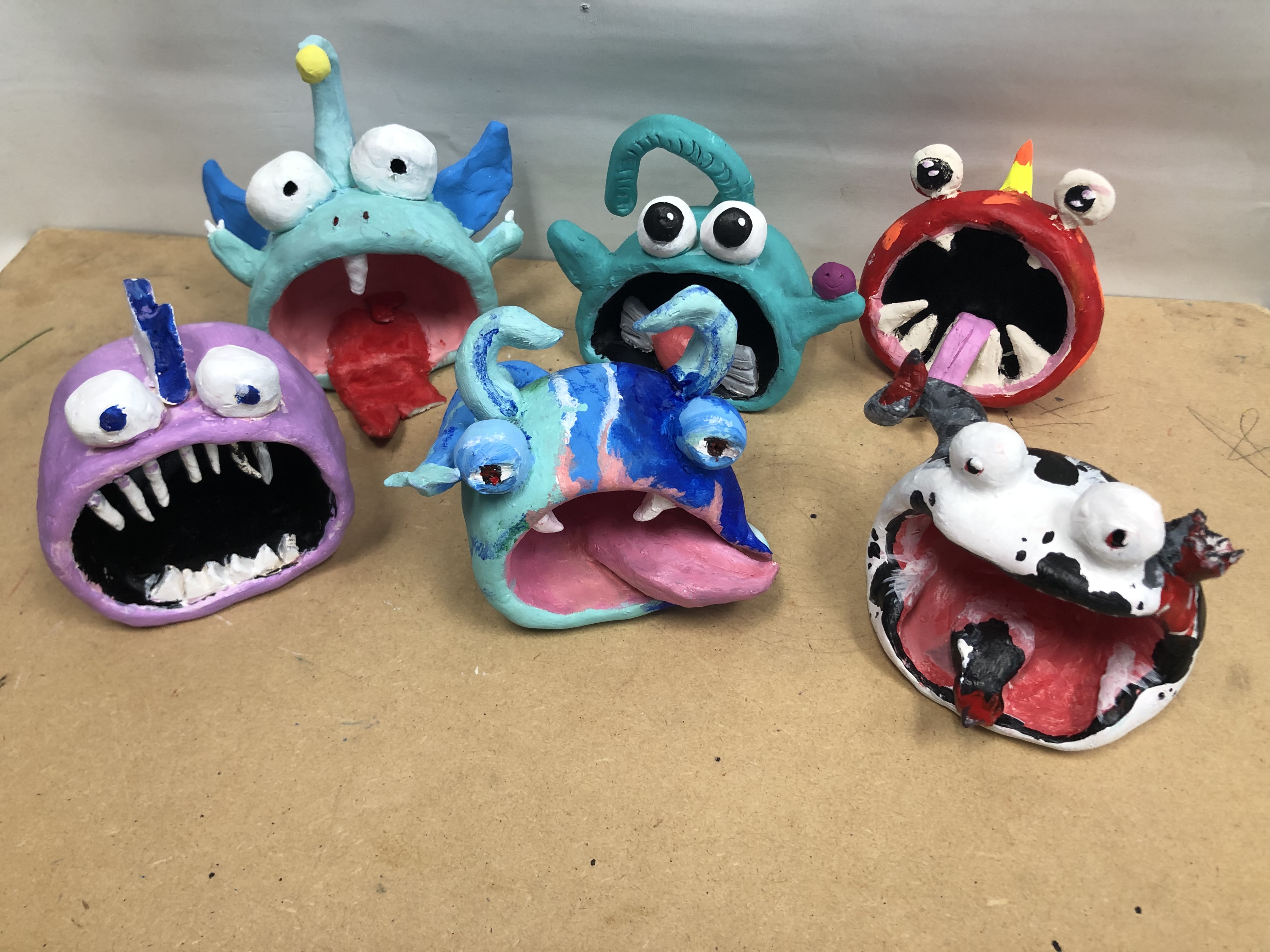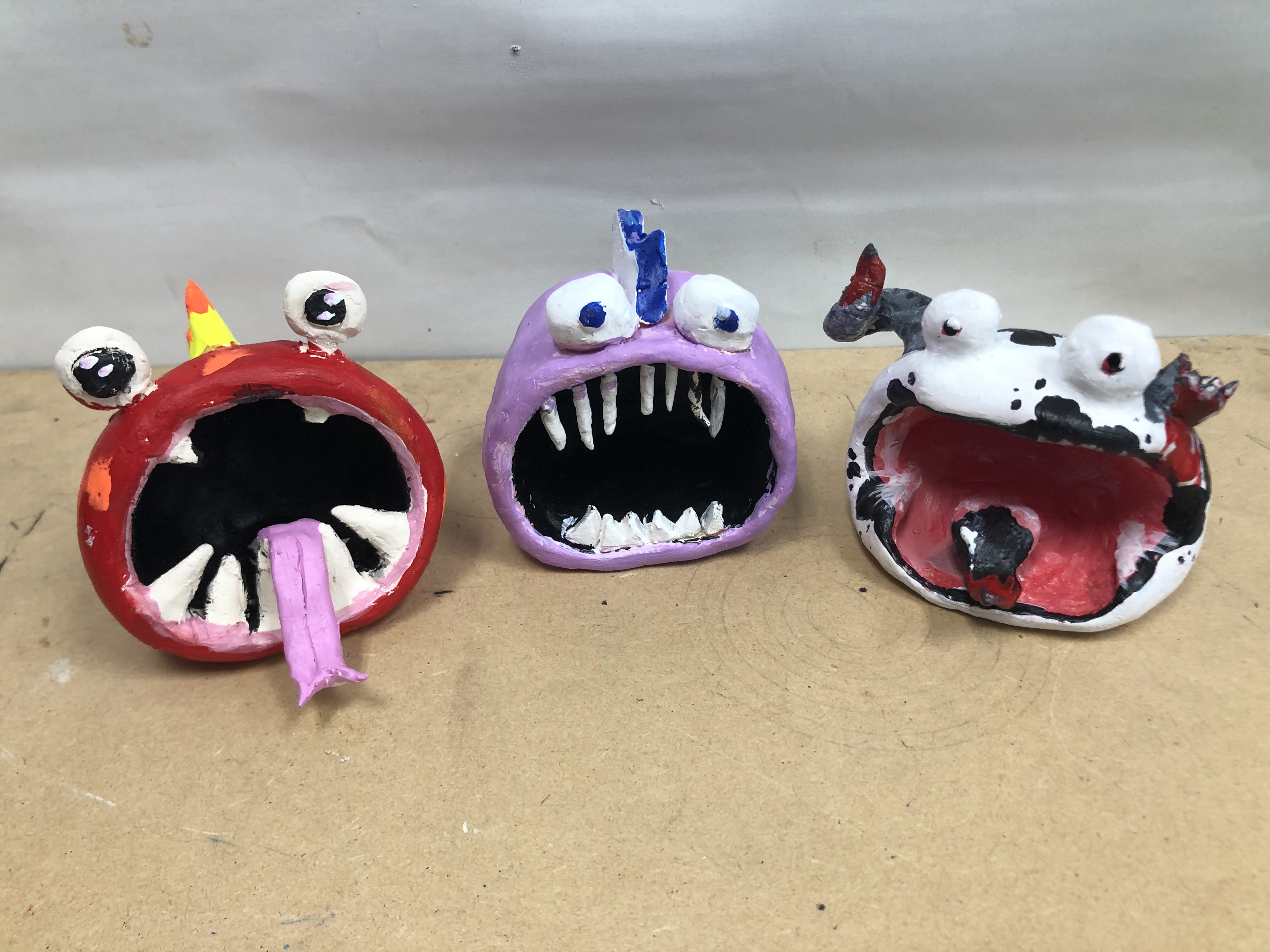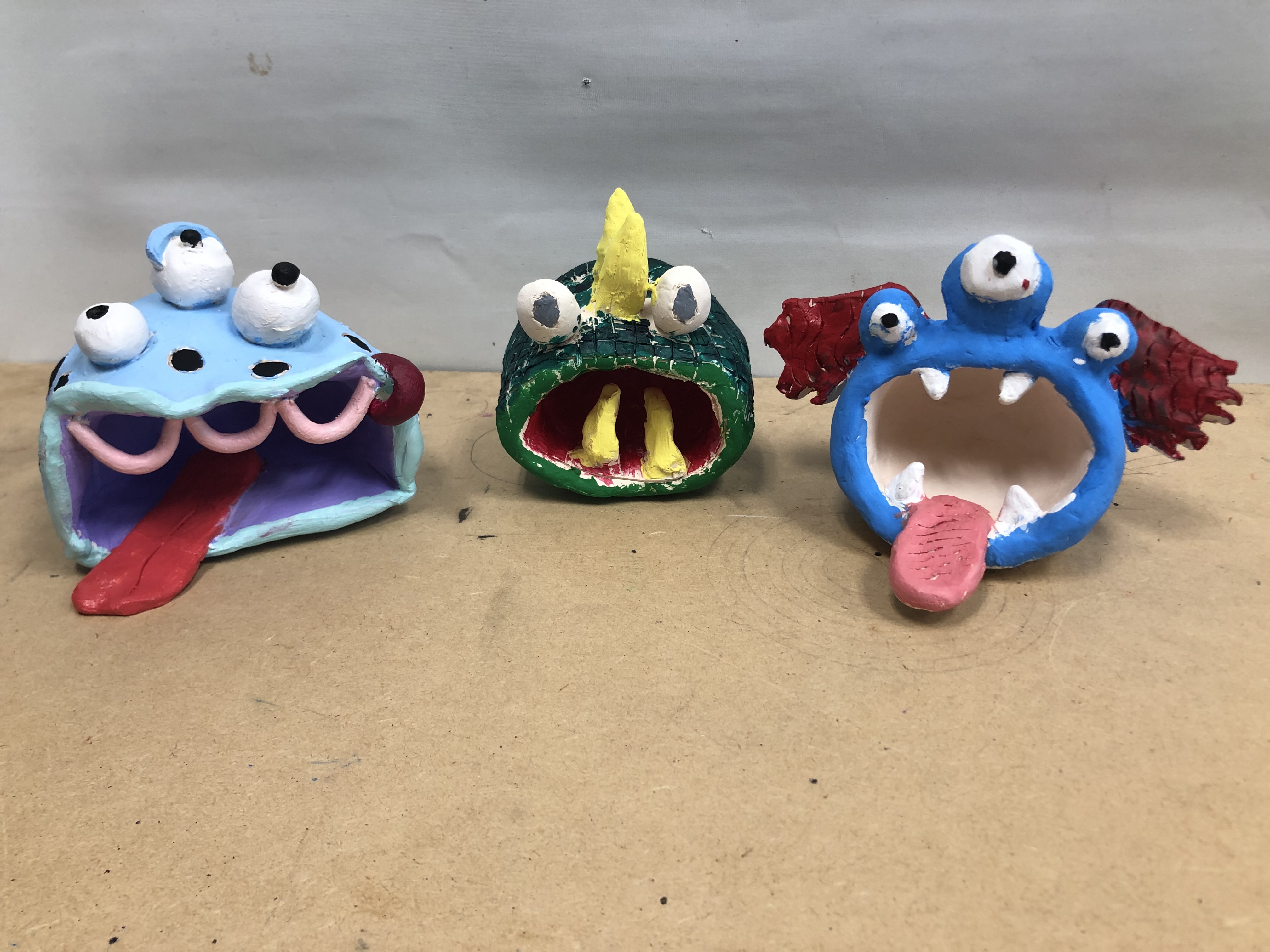 Students learned the basics of Ceramics including the stages of clay and the full ceramics process. Students wedged their clay, then learned how to create a pinch pot. After making their project base, students learned about slabs and coils, two other clay hand-building methods. Students learned the importance of scoring and slipping their attachments, then began adding details to their creatures. Students were required to add at least three features on their monster.