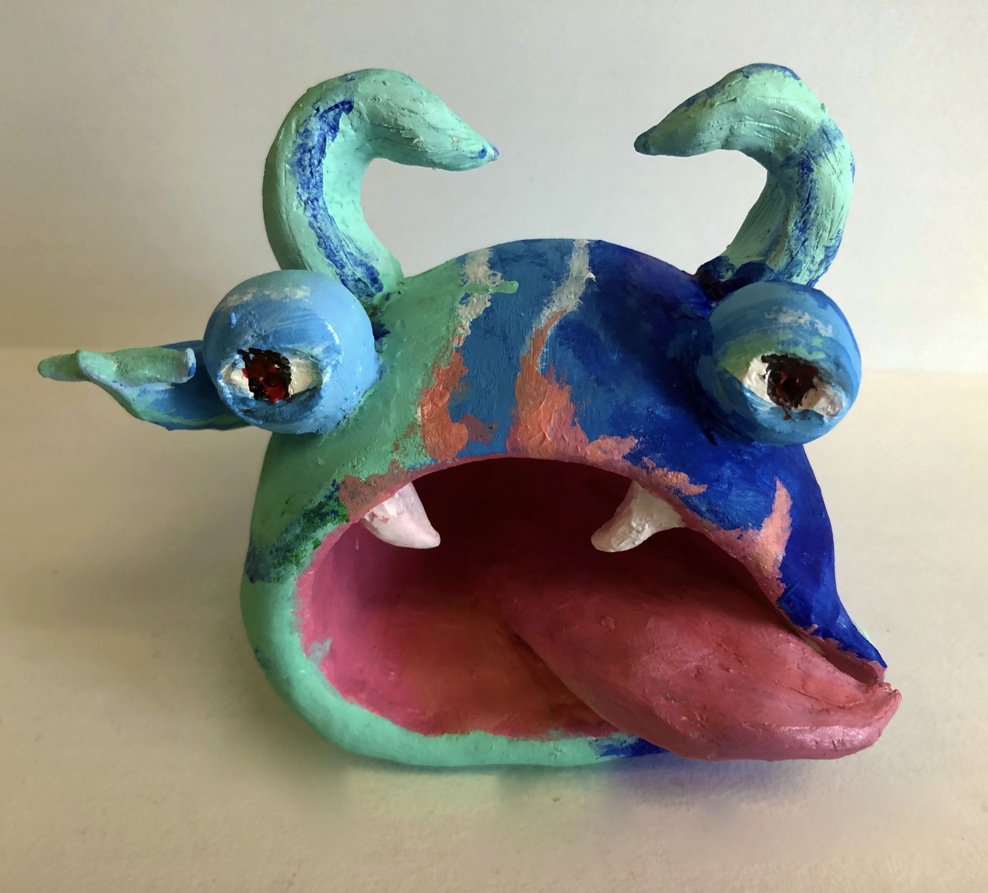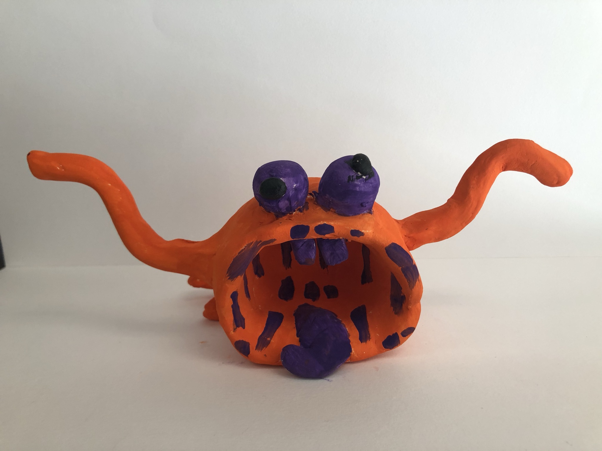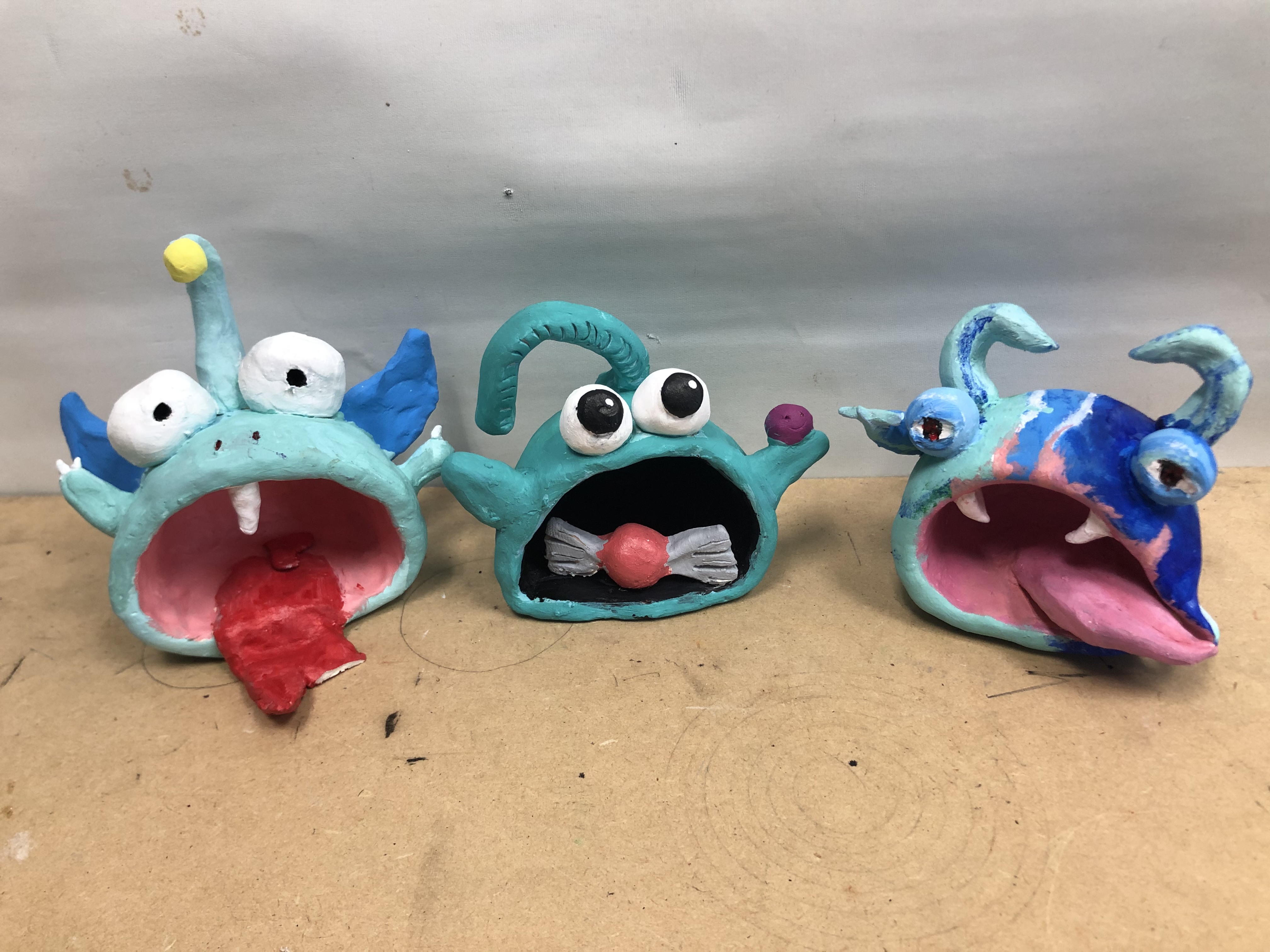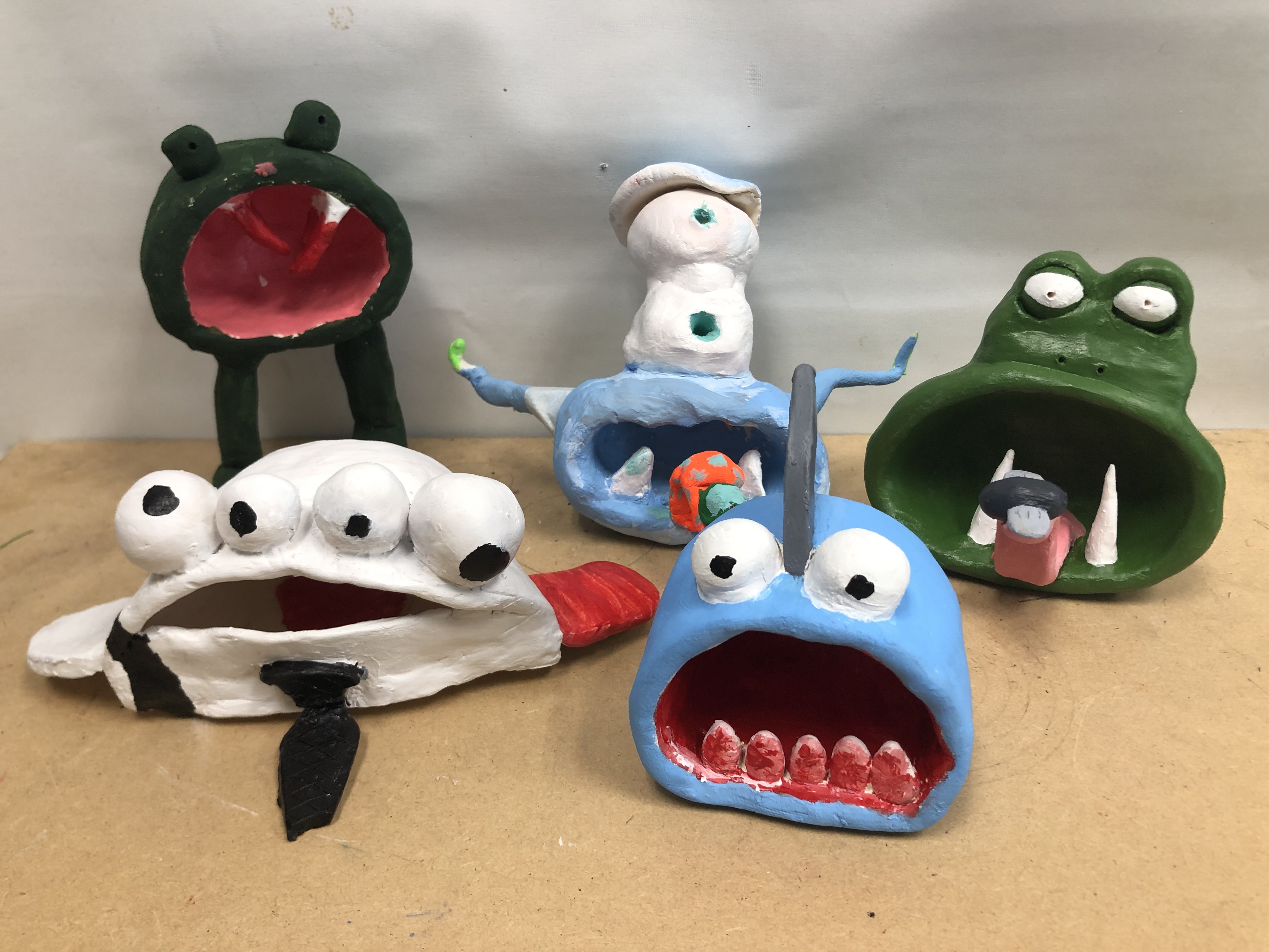 Students learned the basics of Ceramics including the stages of clay and the full ceramics process. Students wedged their clay, then learned how to create a pinch pot. After making their project base, students learned about slabs and coils, two other clay hand-building methods. Students learned the importance of scoring and slipping their attachments, then began adding details to their creatures. Students were required to add at least three features on their monster.
