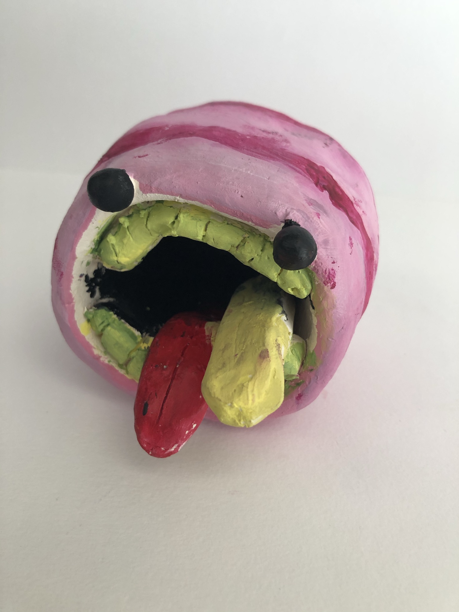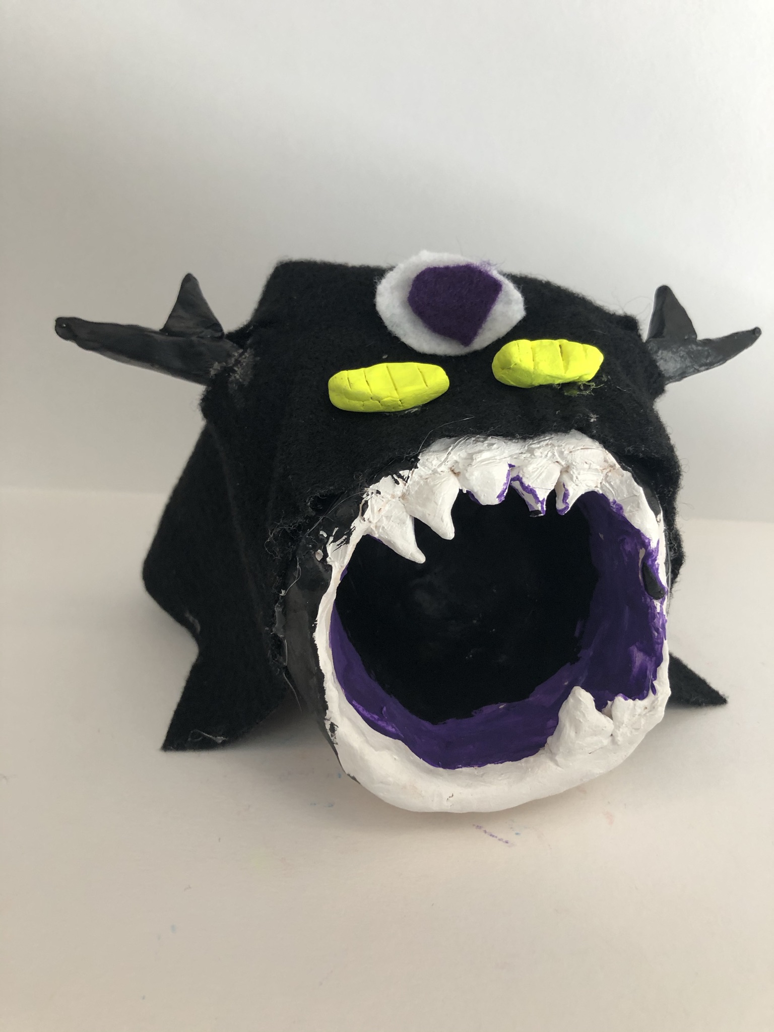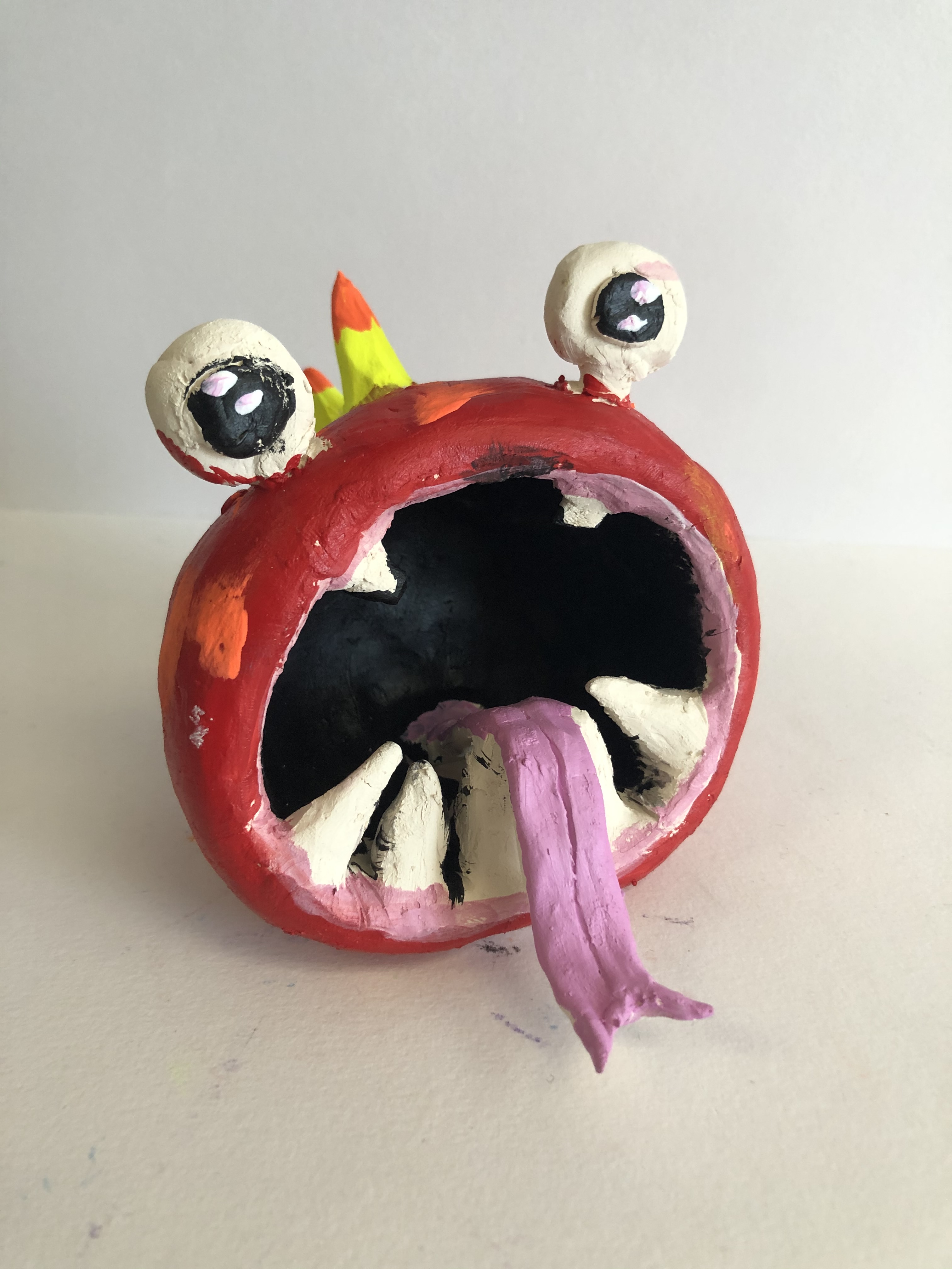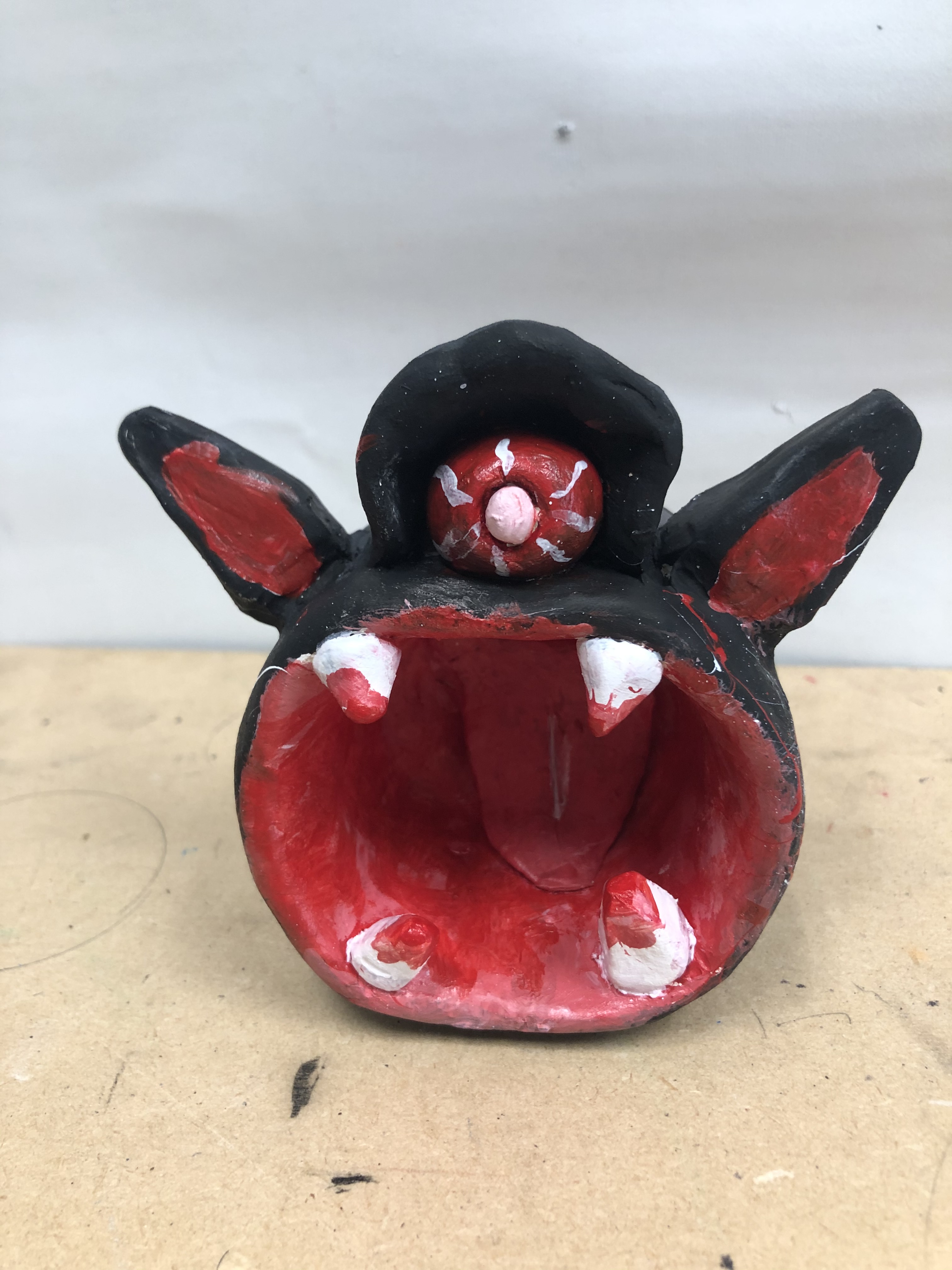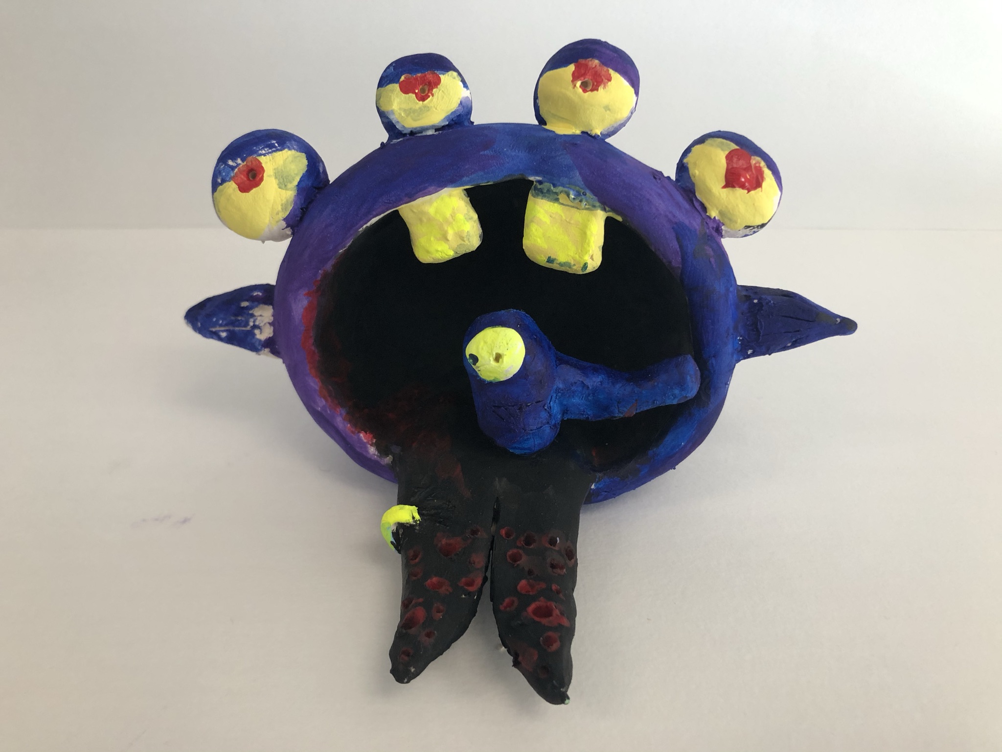 Students learned the basics of Ceramics including the stages of clay and the full ceramics process. Students wedged their clay, then learned how to create a pinch pot. After making their project base, students learned about slabs and coils, two other clay hand-building methods. Students learned the importance of scoring and slipping their attachments, then began adding details to their creatures. Students were required to add at least three features on their monster.