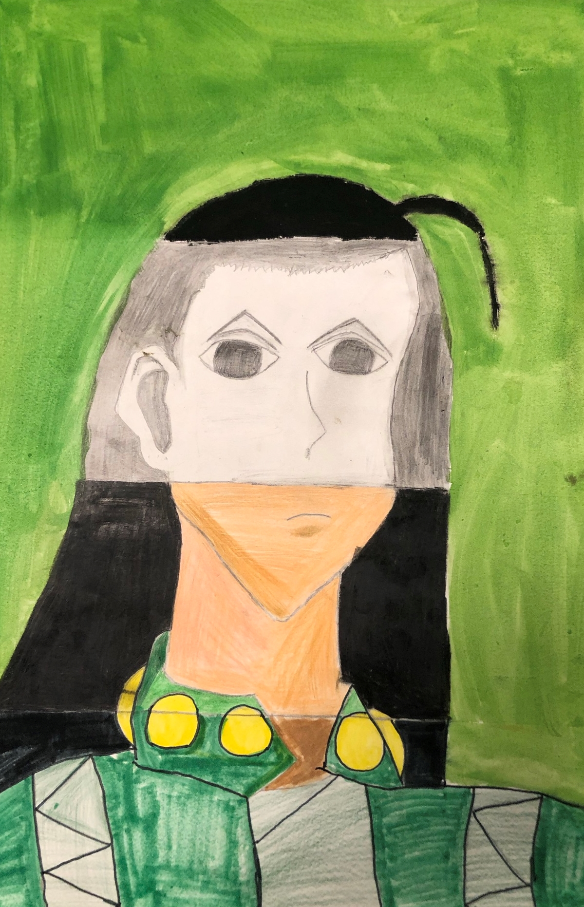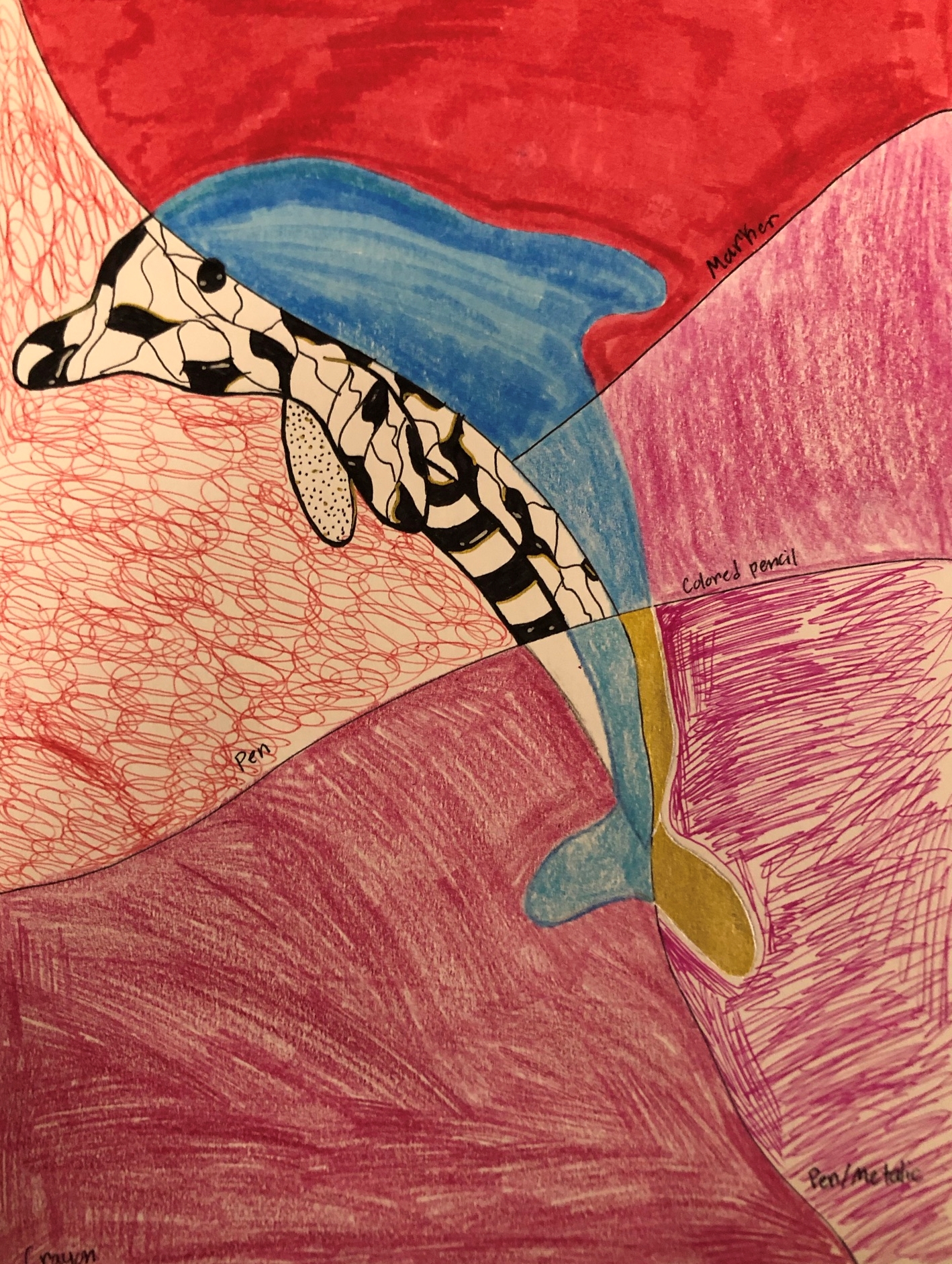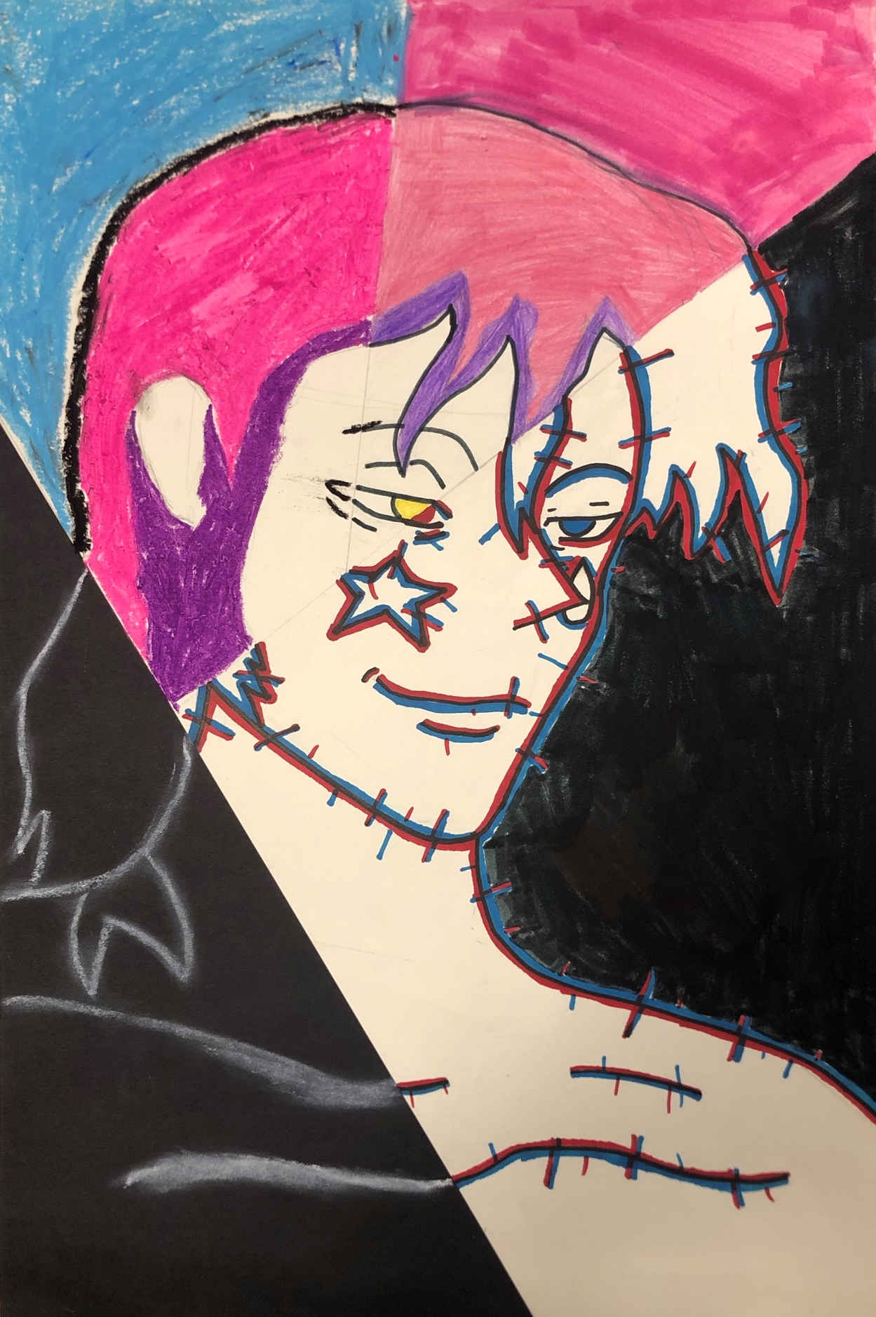 As one of their final projects for the year, students were tasked with creating a mixed-media project. Students picked and animal, object, or person to draw for the subject of their artwork. Then, students were required to divide their project into at least four sections. This was because students were asked to use at least four materials in their work.