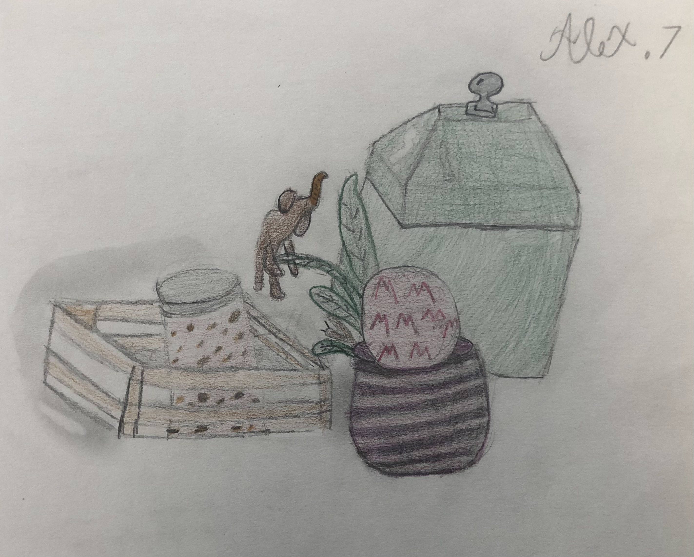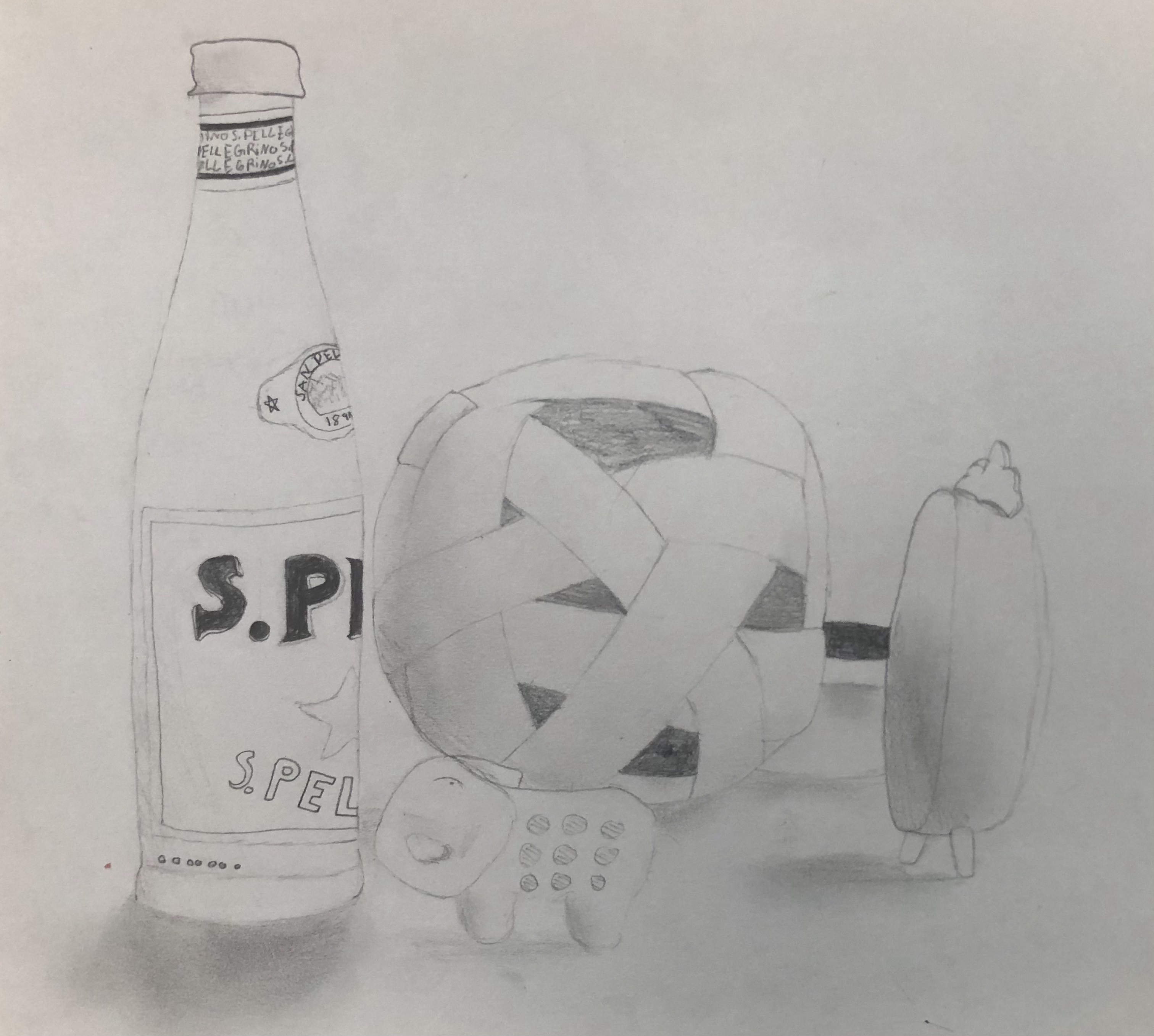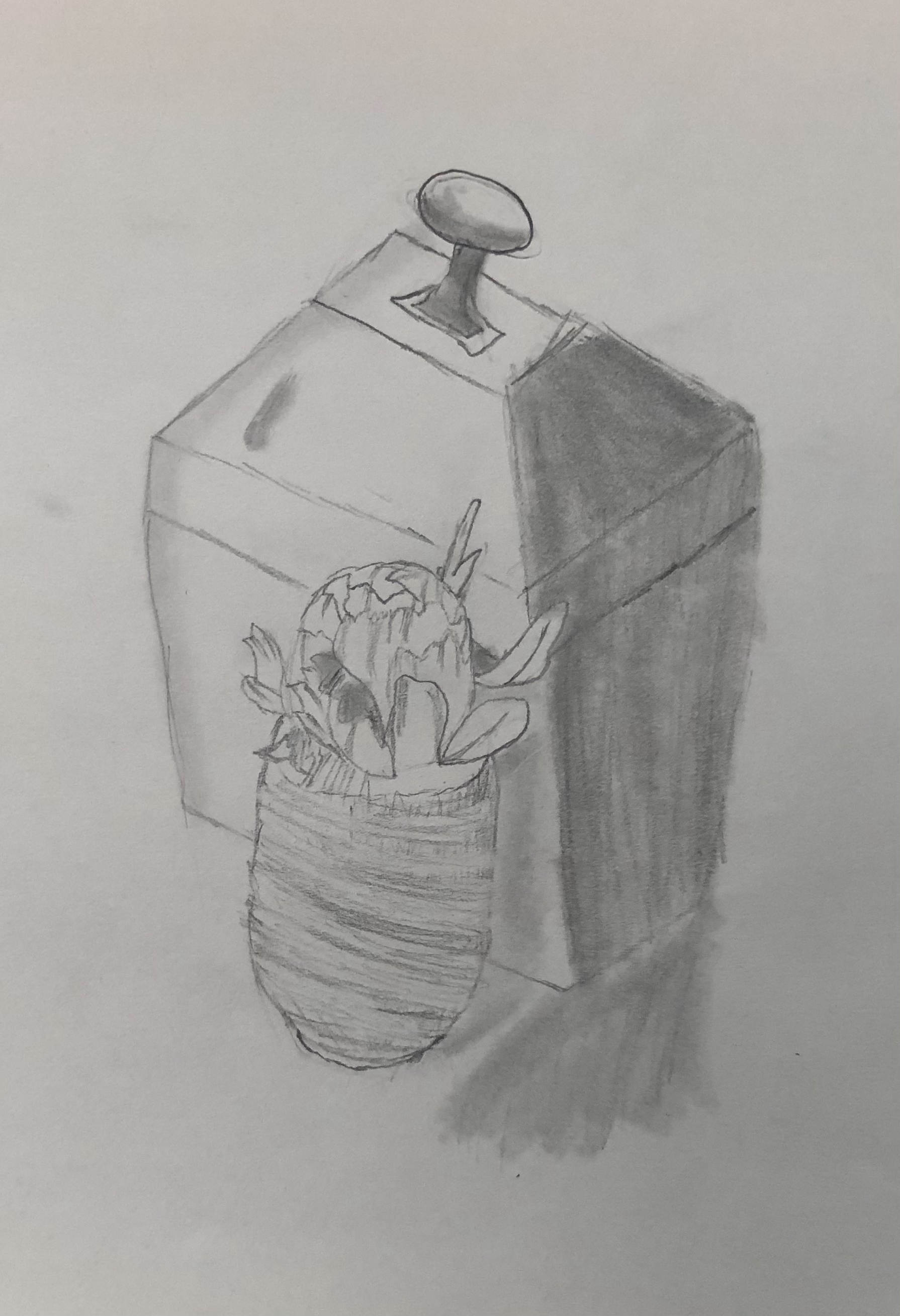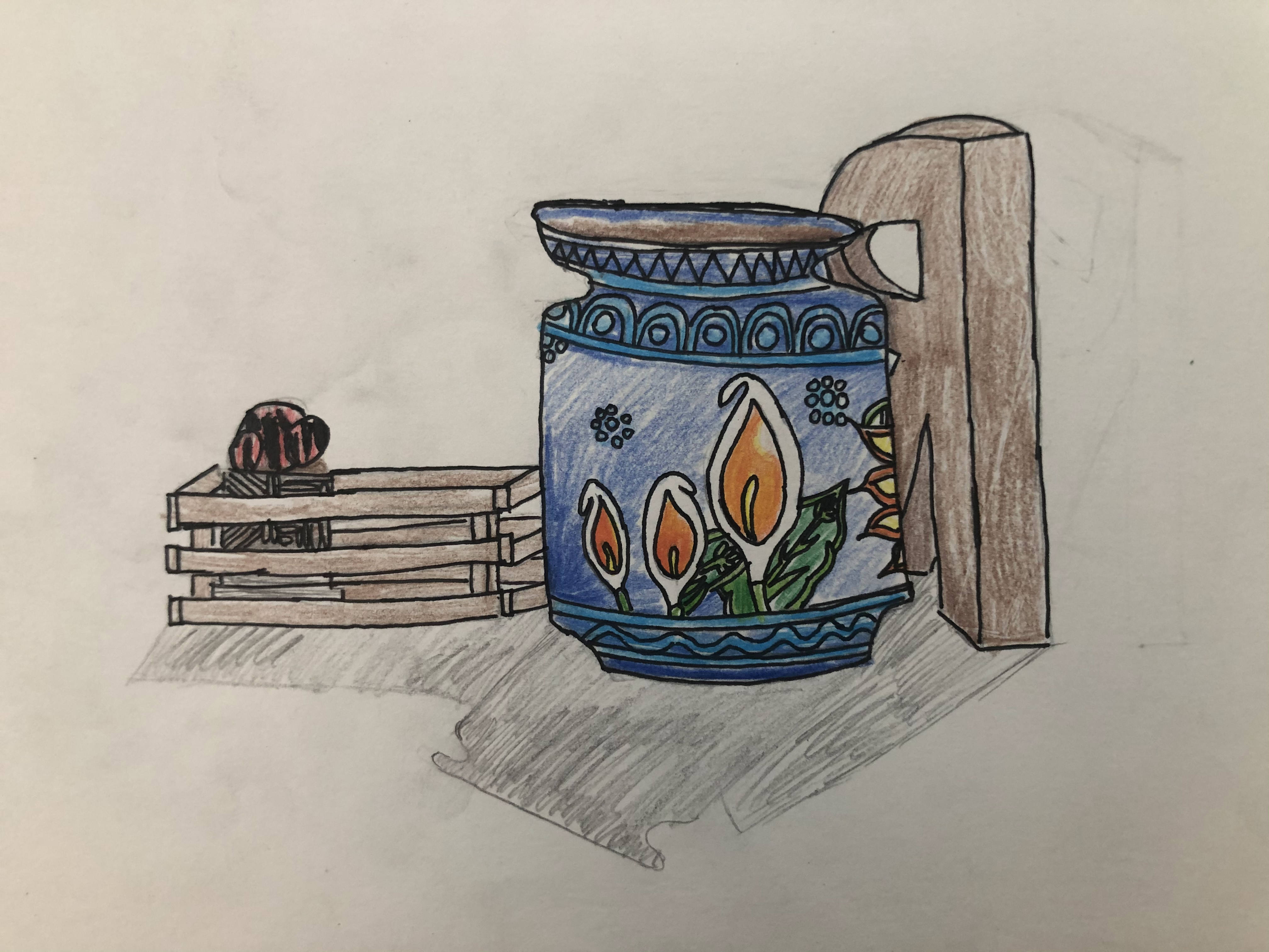 To begin the year, students were taught the basic drawing skill of blocking out. This skill helps students break down complicated objects into simple shapes, making it easier to draw. After learning the skill through teacher demonstration and a practice sketch in their sketchbook, students drew objects from observation. Art 1 students were provided objects placed as a still life, while Art 2 was allowed to bring in their own objects to draw. Students were asked to add details or shading to their project after drawing in the basic shapes. If students finished early, they were allowed to add color to their drawings.
