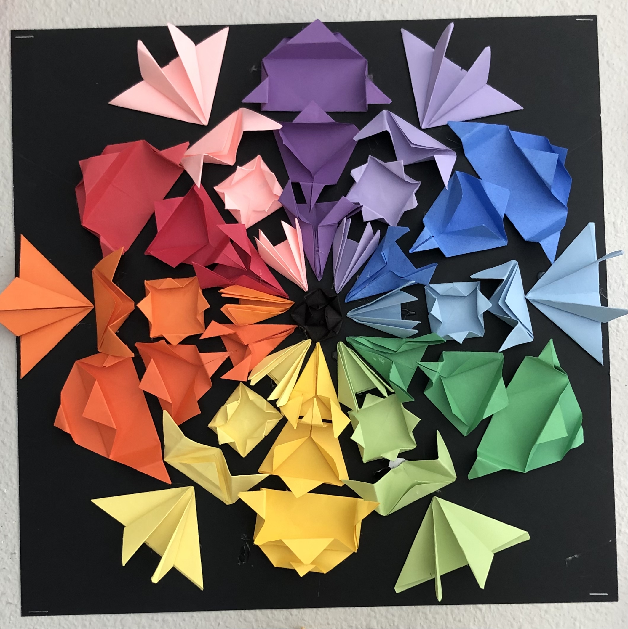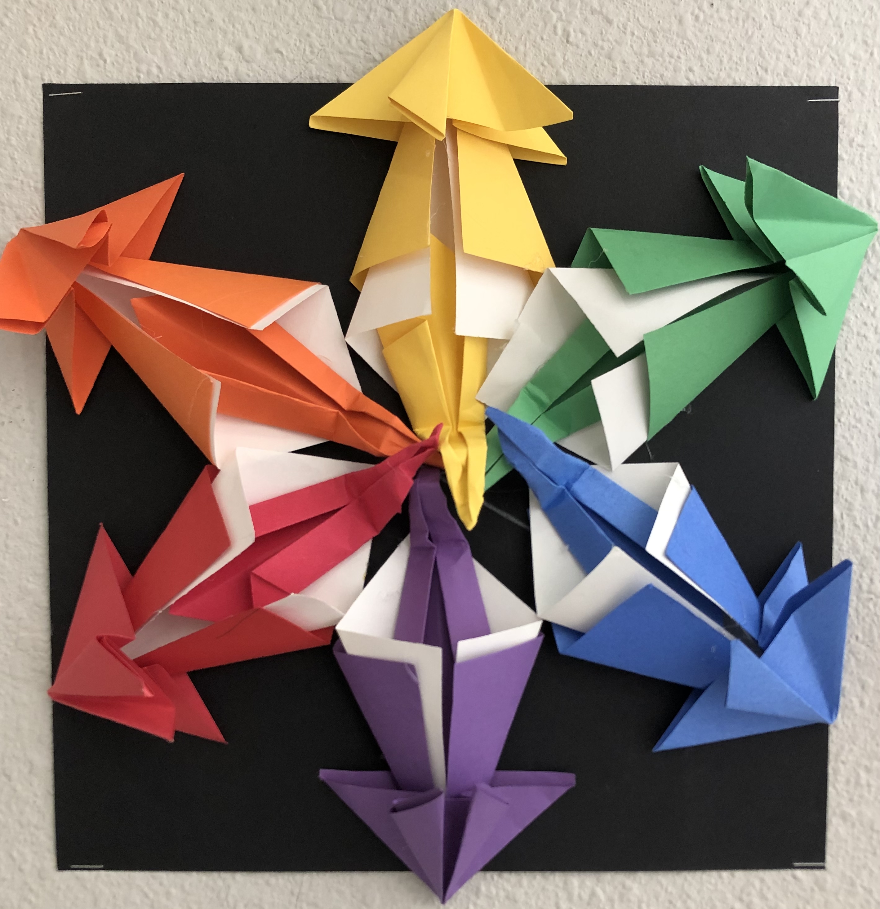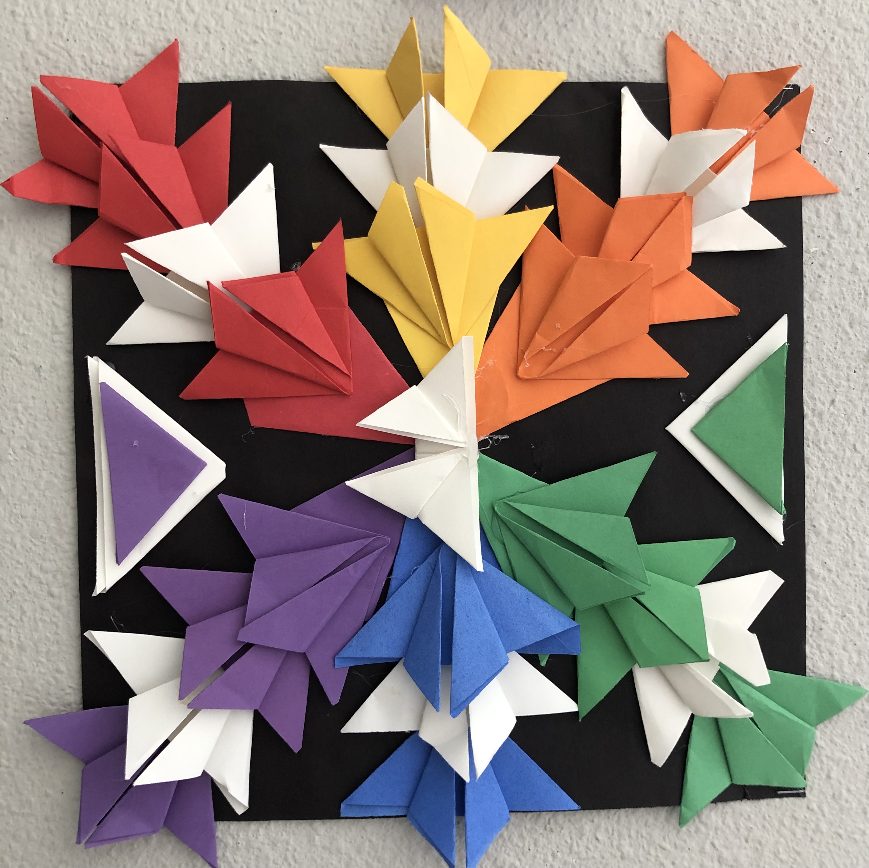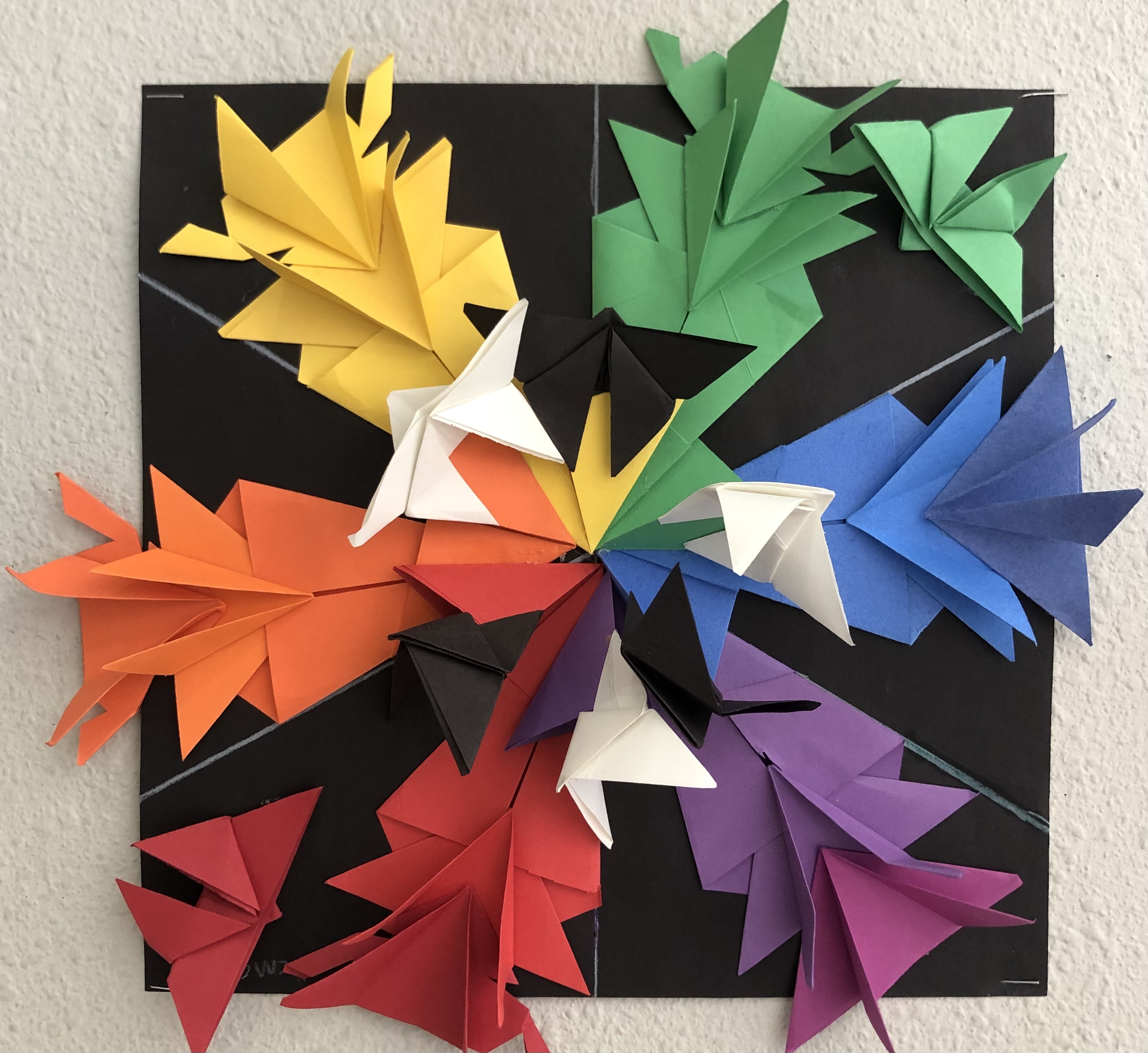 After the introduction to origami and preparing their papers, students were instructed to create at least three folds for each color (form), keeping in mind that they would want to balance their work. They could include black and white forms in their designs as well. Students tried out various arrangements before gluing down their final composition.