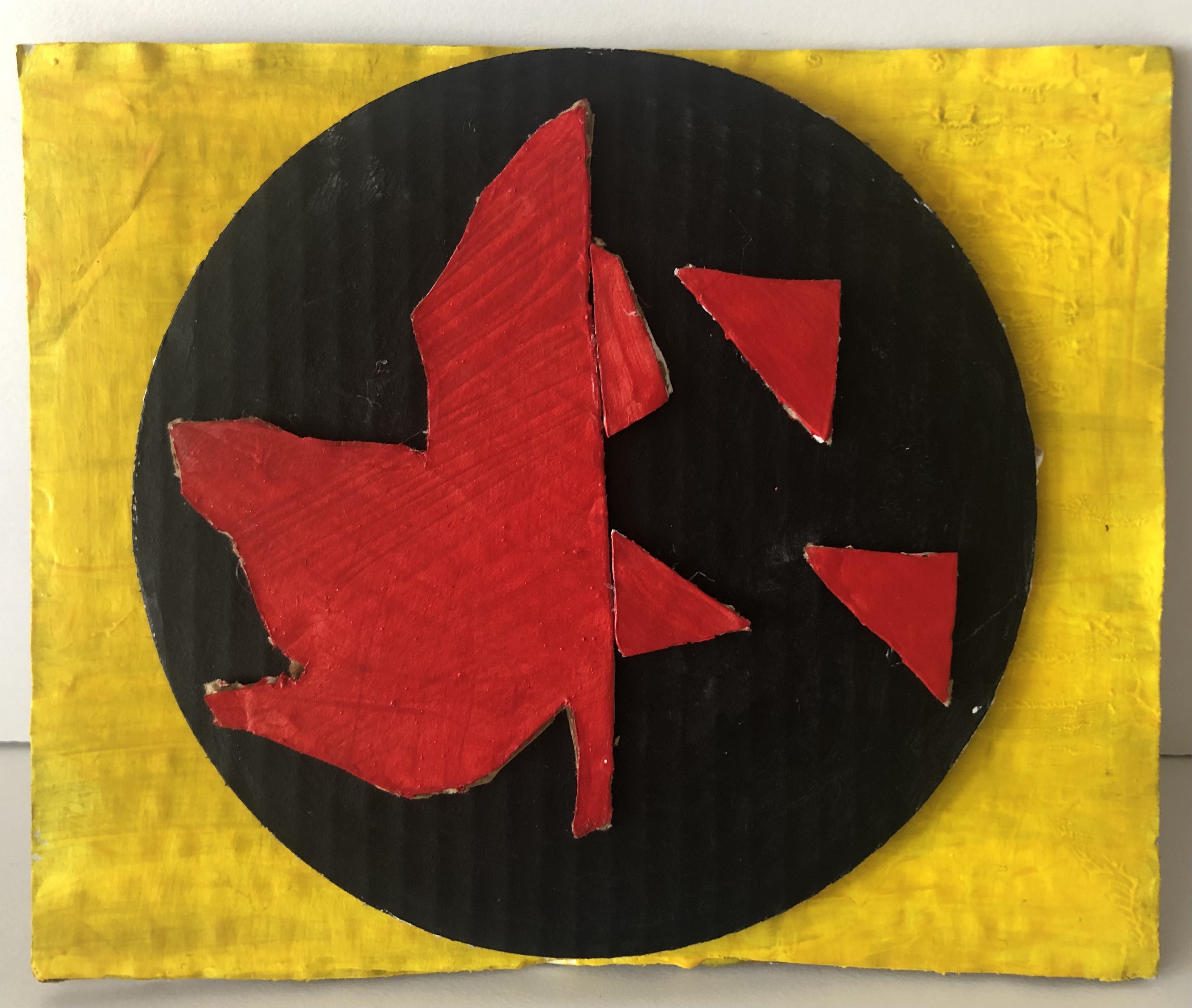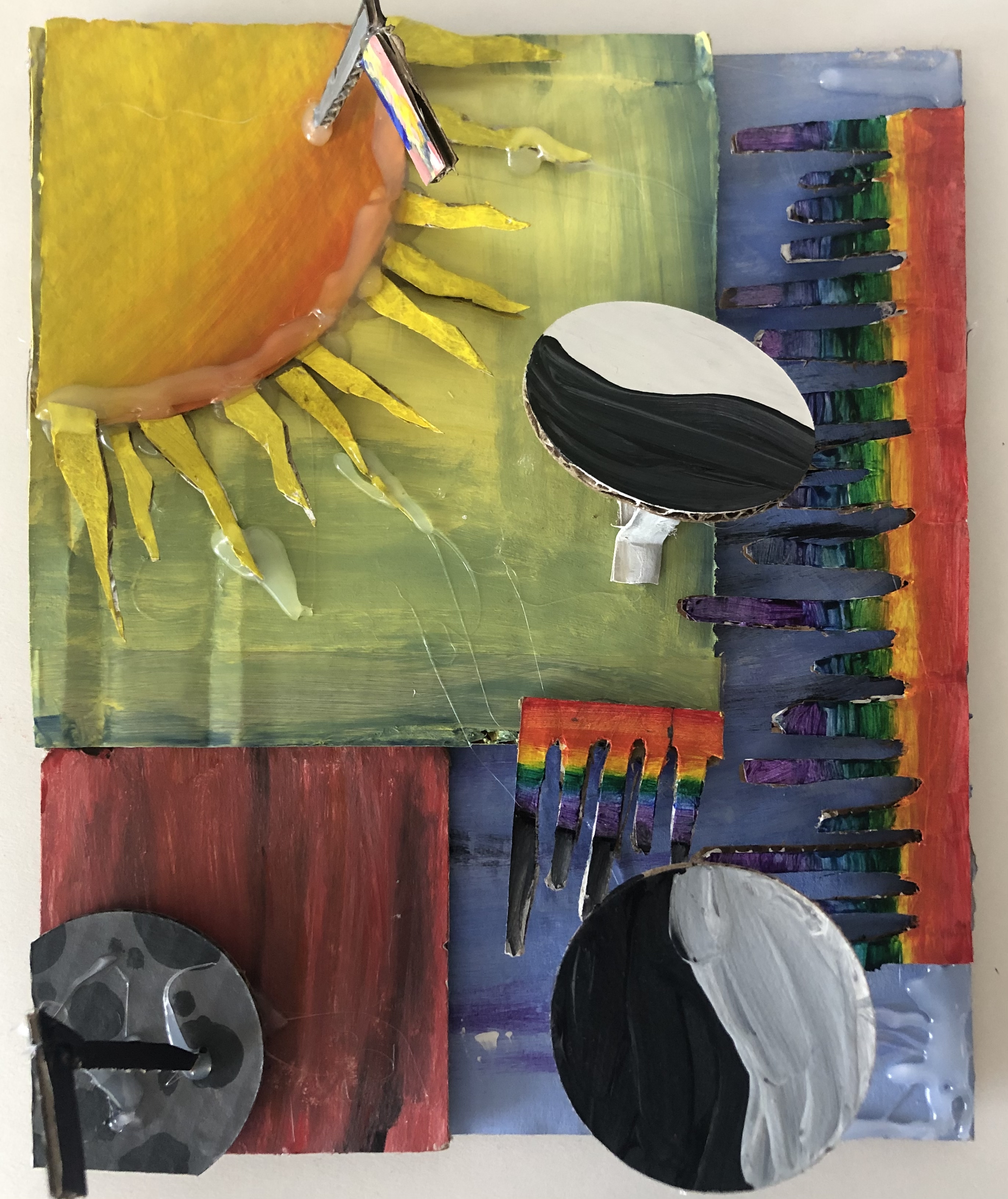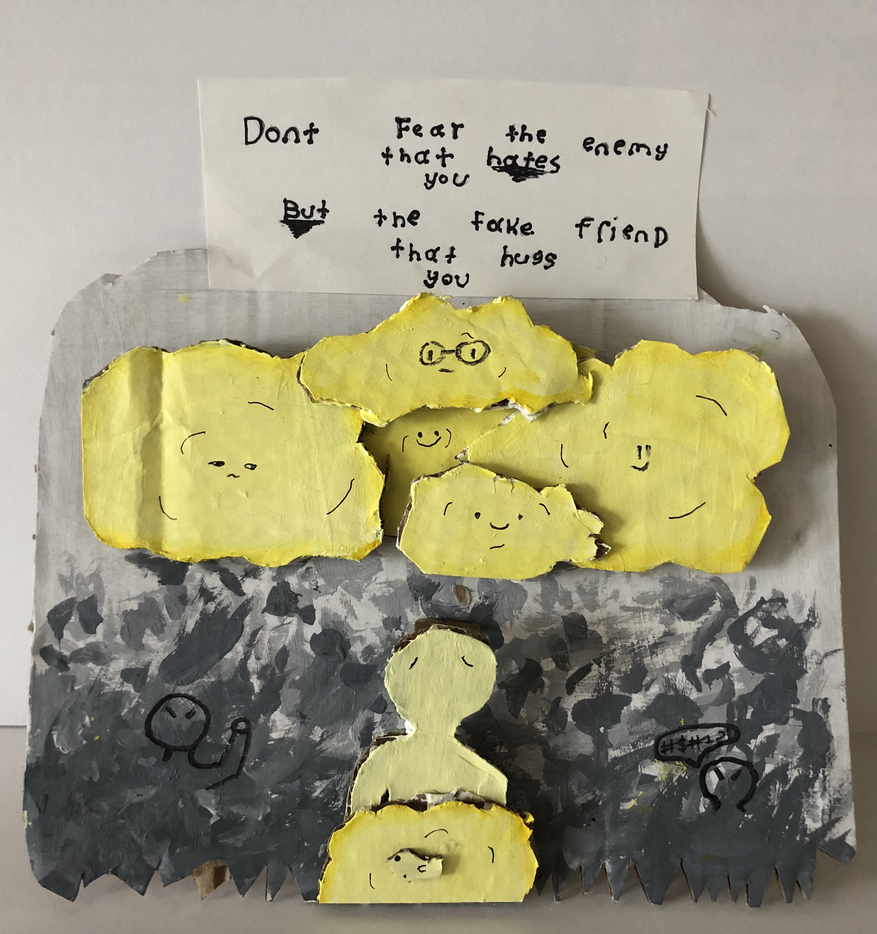 Students learned about Narrative Art and how artists use their work to tell stories. As a review of the elements of art shape and form, students planned a relief sculpture made of cardboard. After designing their sculpture through sketches, students began creating the individual pieces for their sculpture. Students gessoed their pieces once they were done, then painted or colored their pieces to match their story.