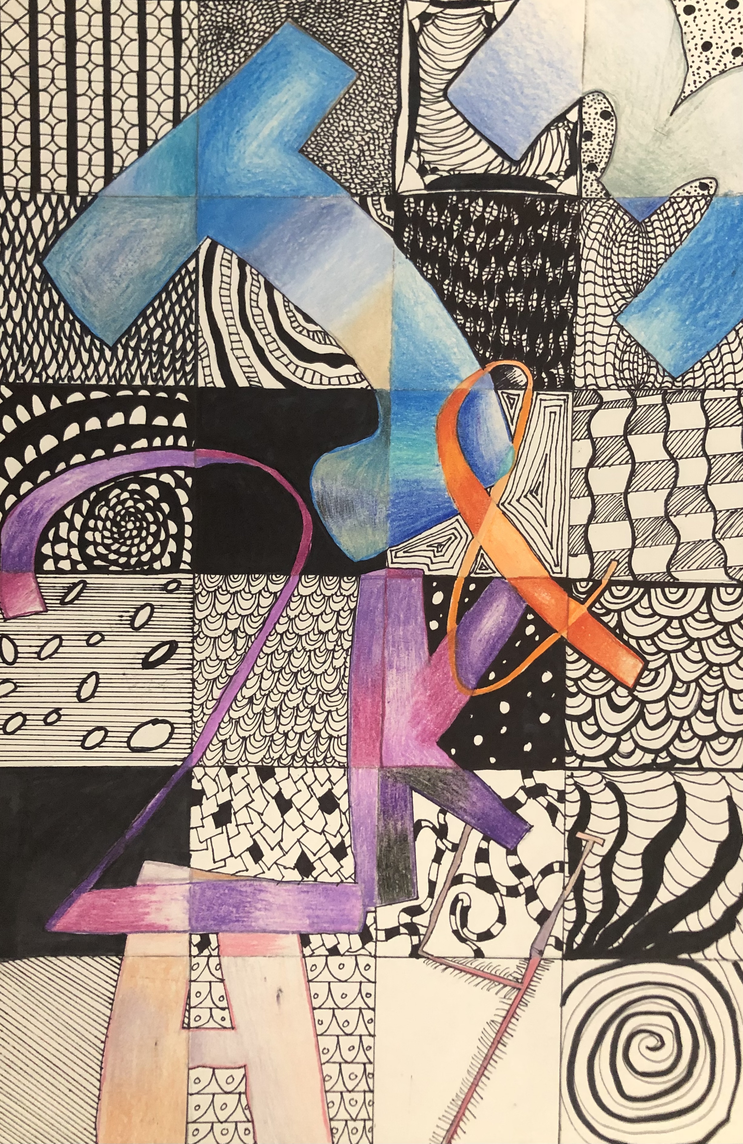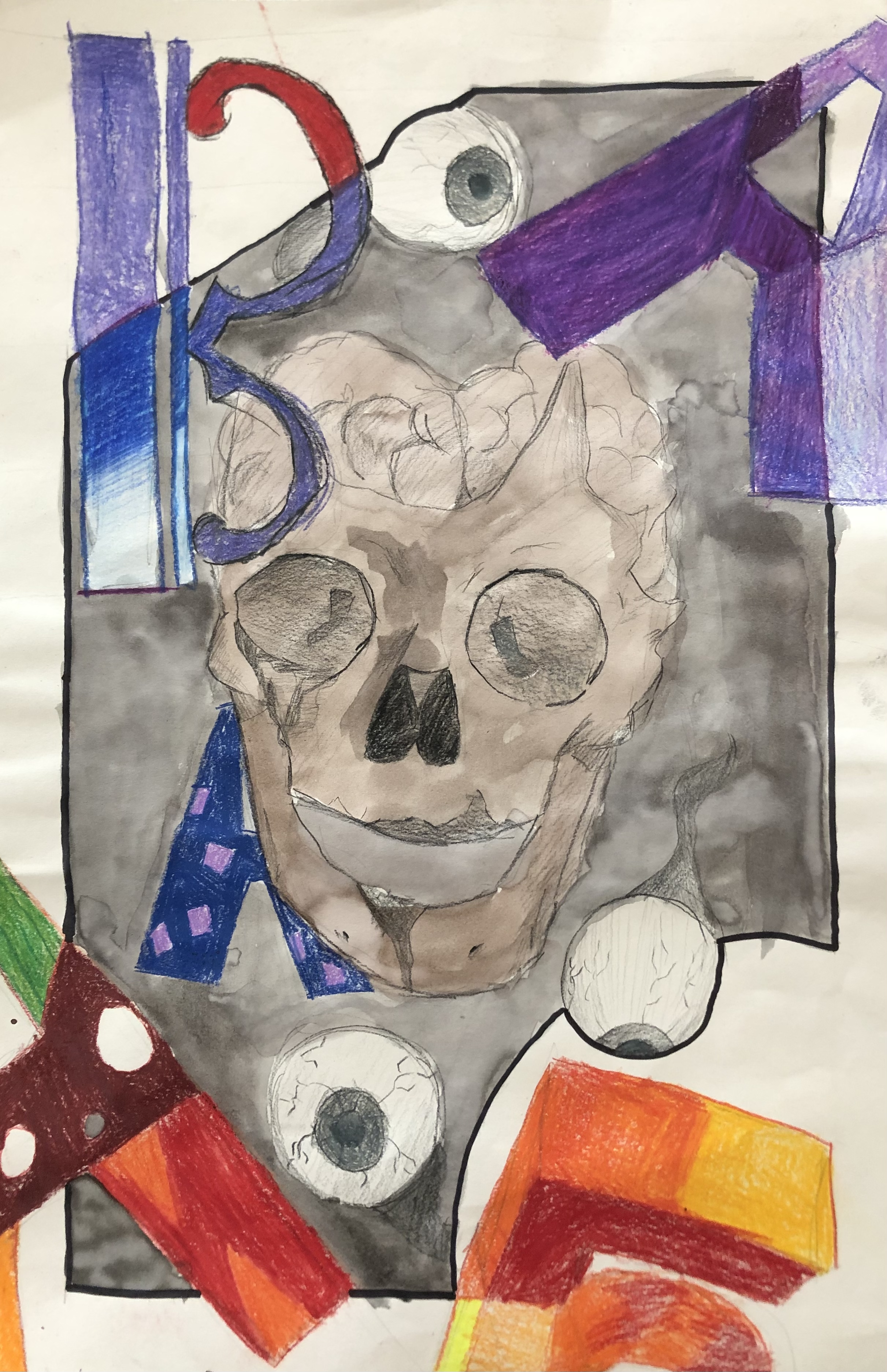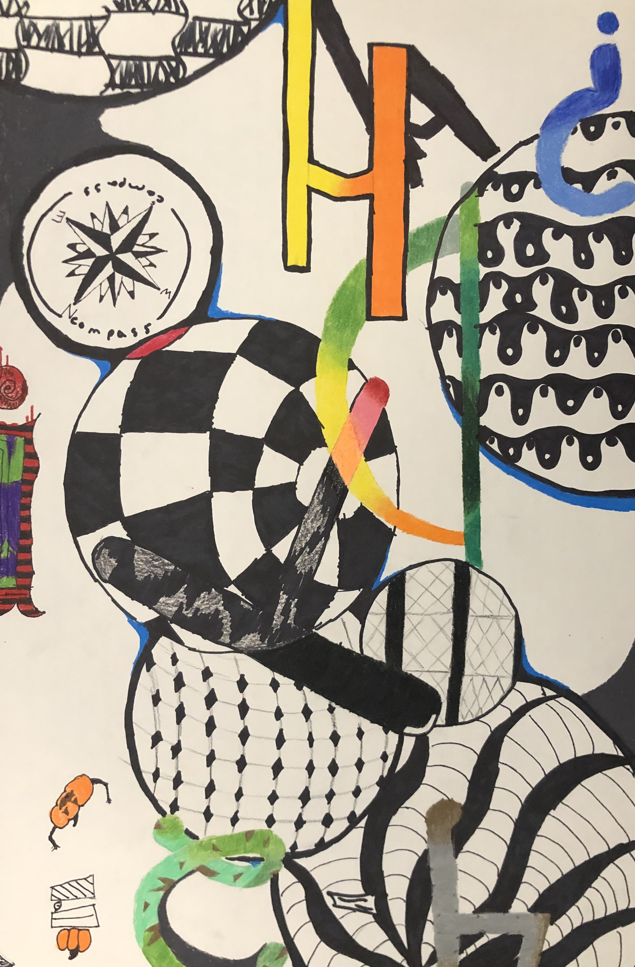 After discussing composition, students were required to create two thumbnail sketches of their project. After selecting the one they thought was the strongest, students created an under-drawing for their work. Their typography was colored in using colored pencil to make it stand out. After finishing their characters, students created a unique background using ink.