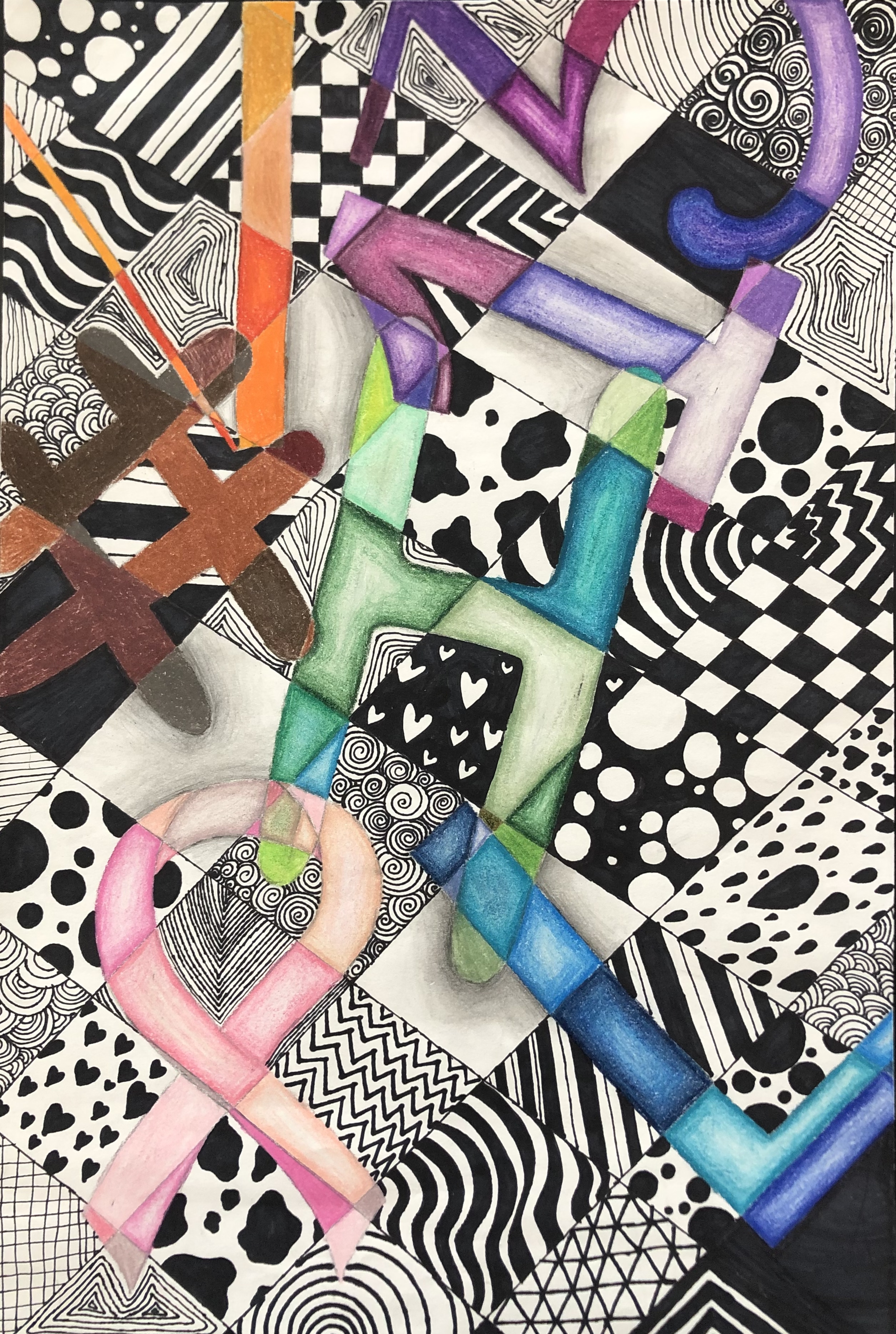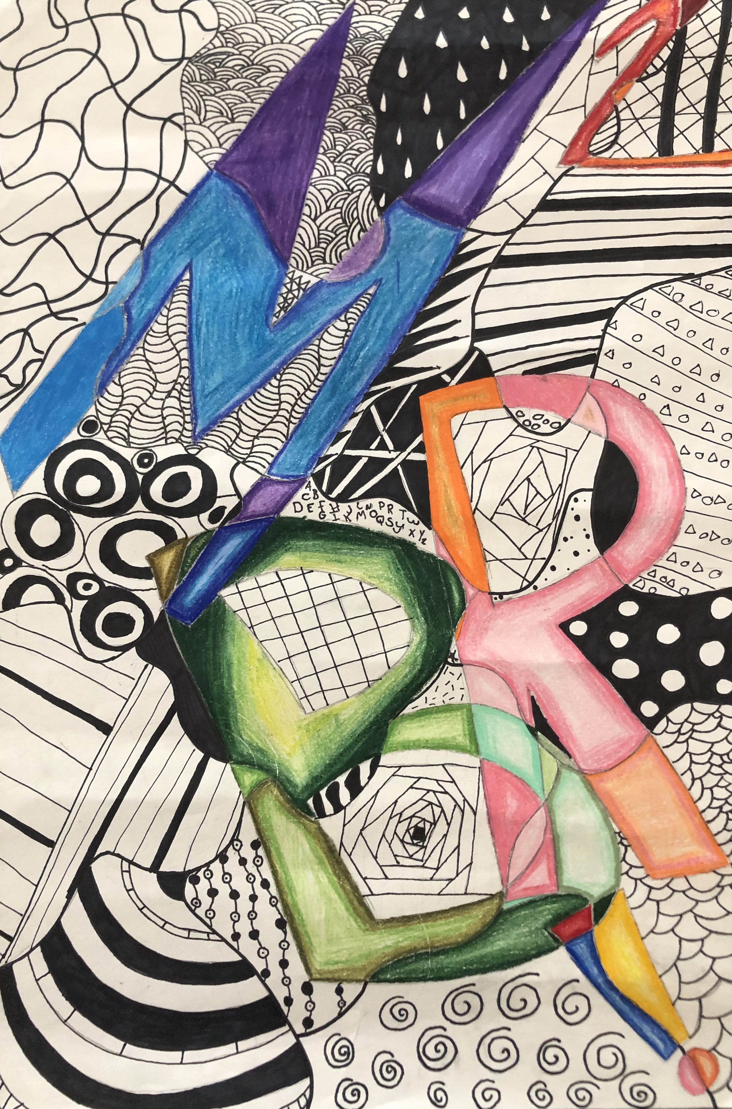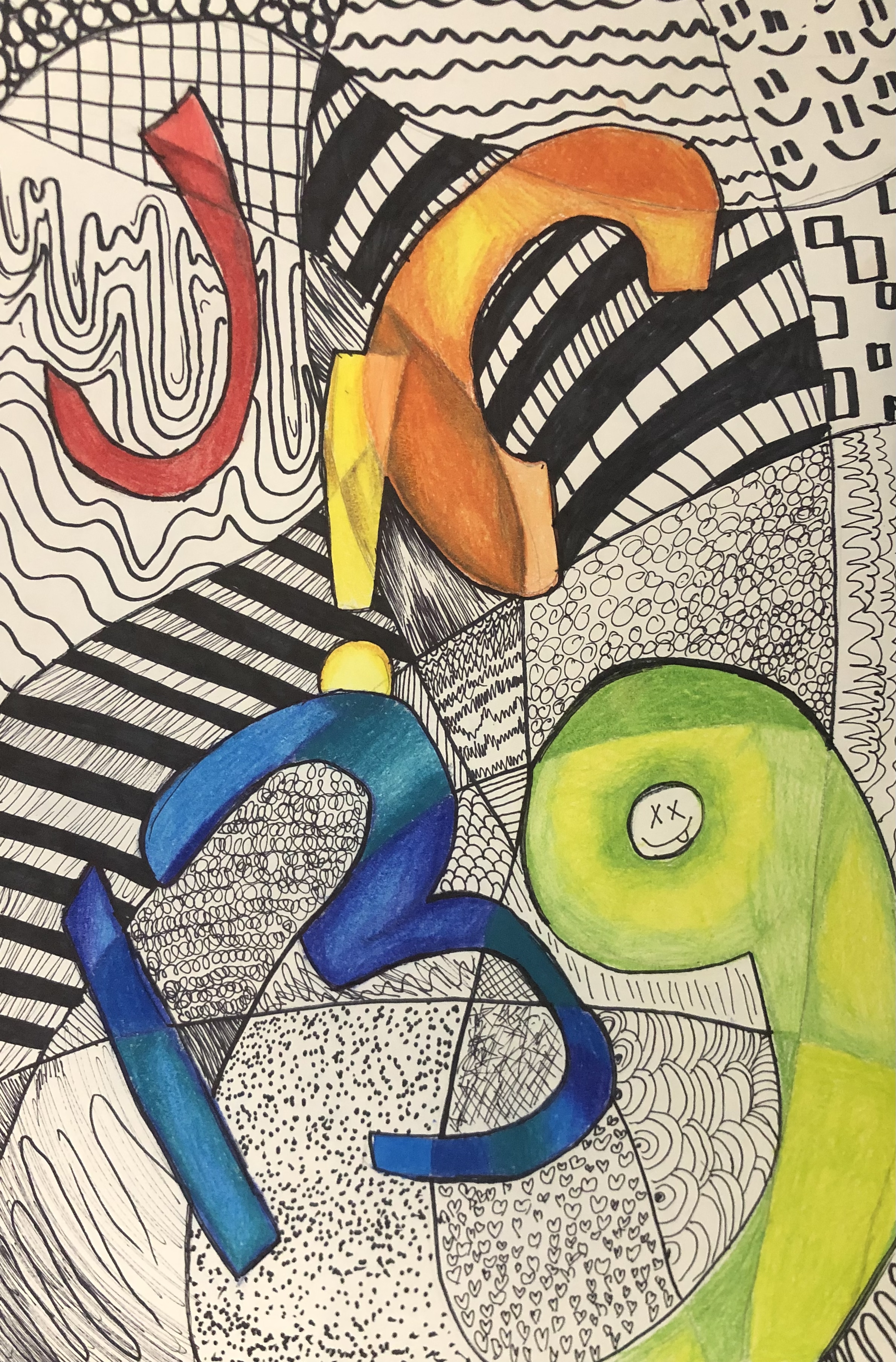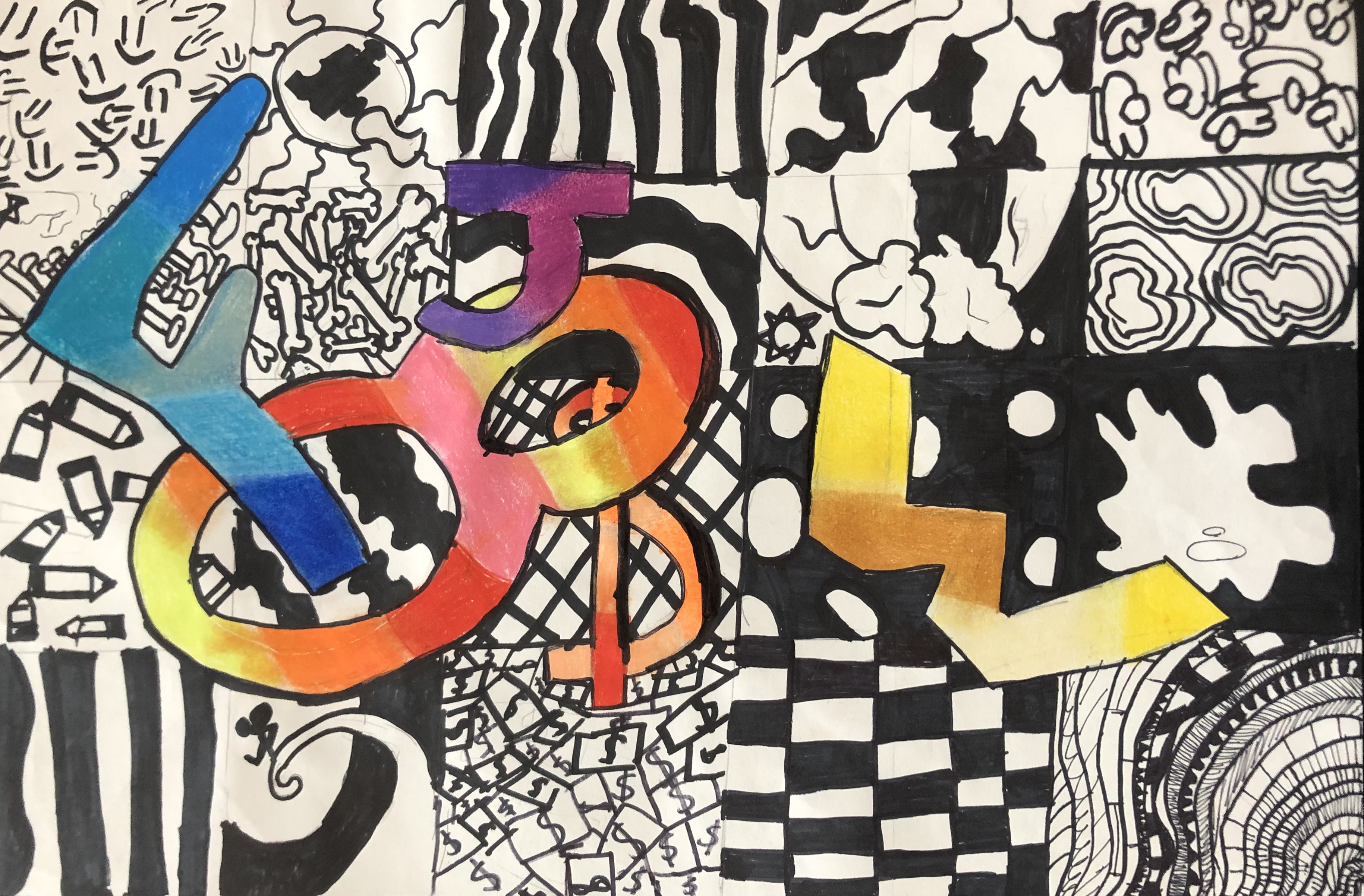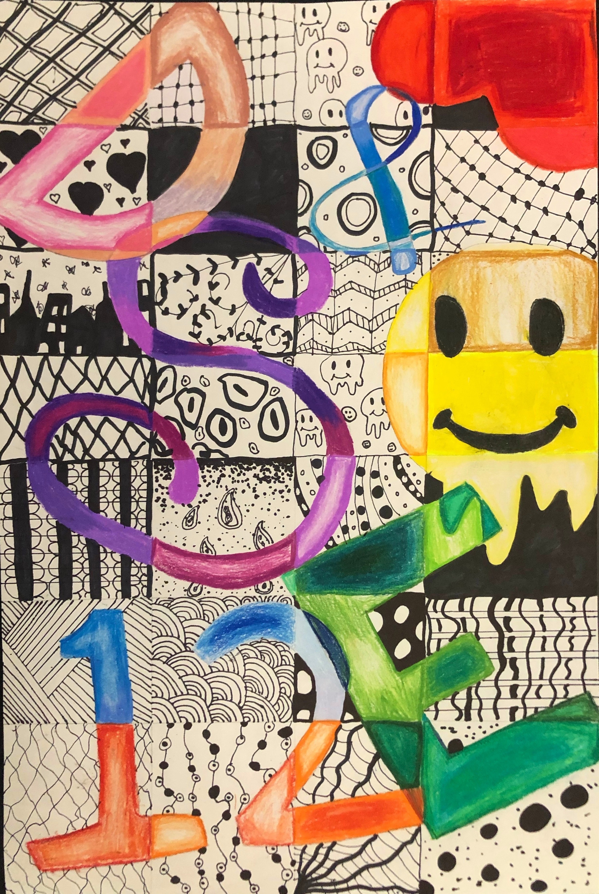 Students were given a chance to show off who they were in a unique way. In class, we talked about the significance of written language and how it could be used in an abstract way to represent a person (portrait). After learning the basics of typography, students used their computers to look up different fonts they could hand-draw for their project. Students used letters, numbers, and symbols to express their identity in their artwork.