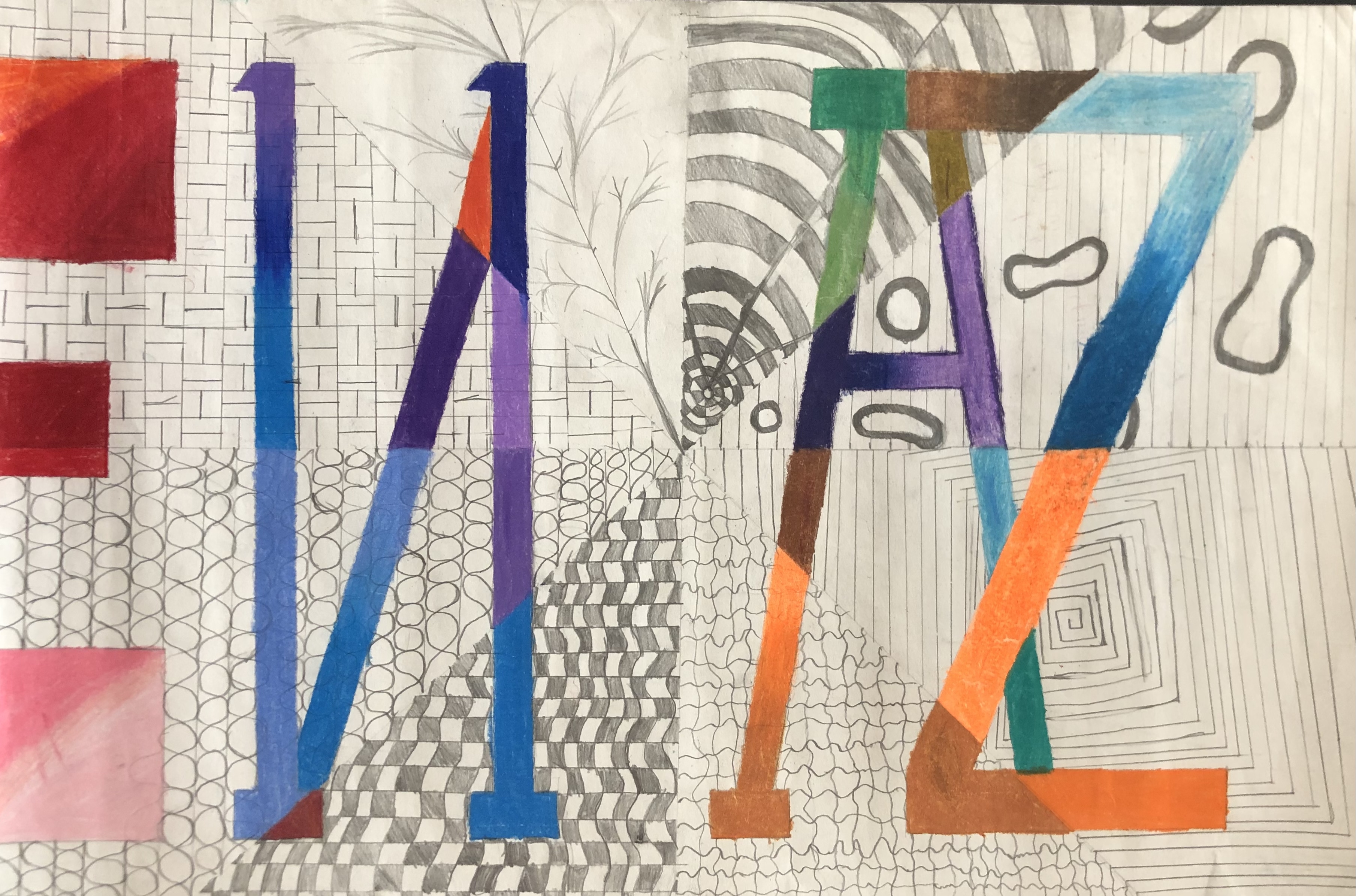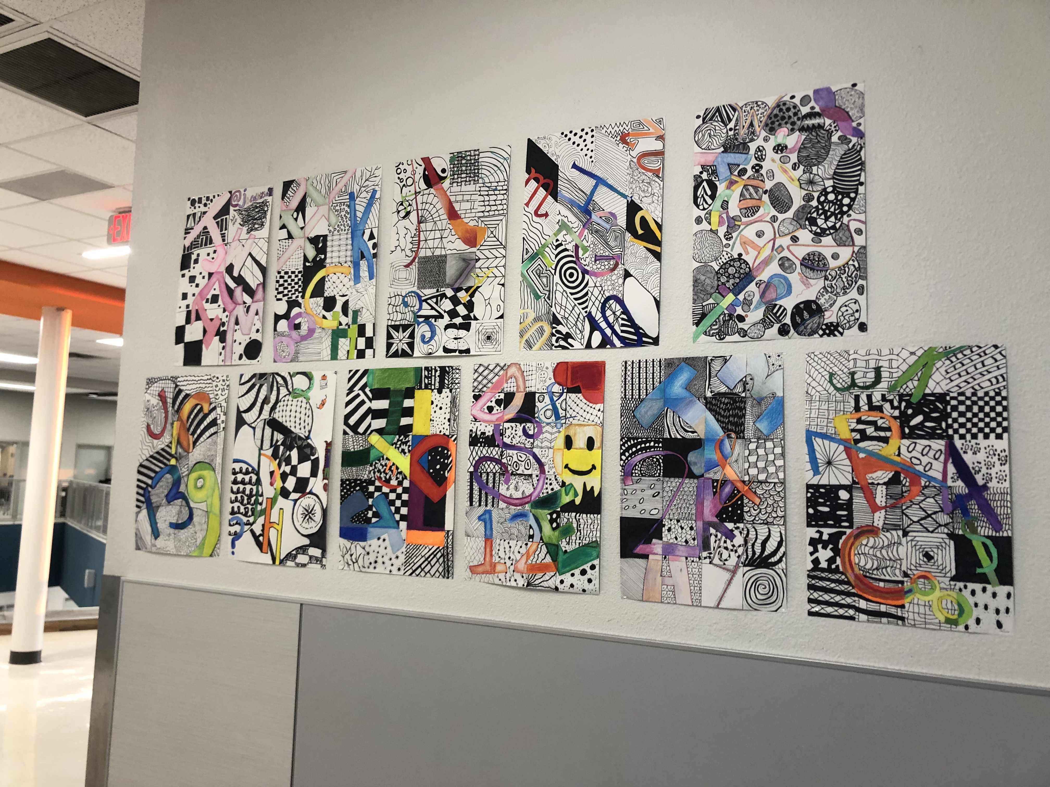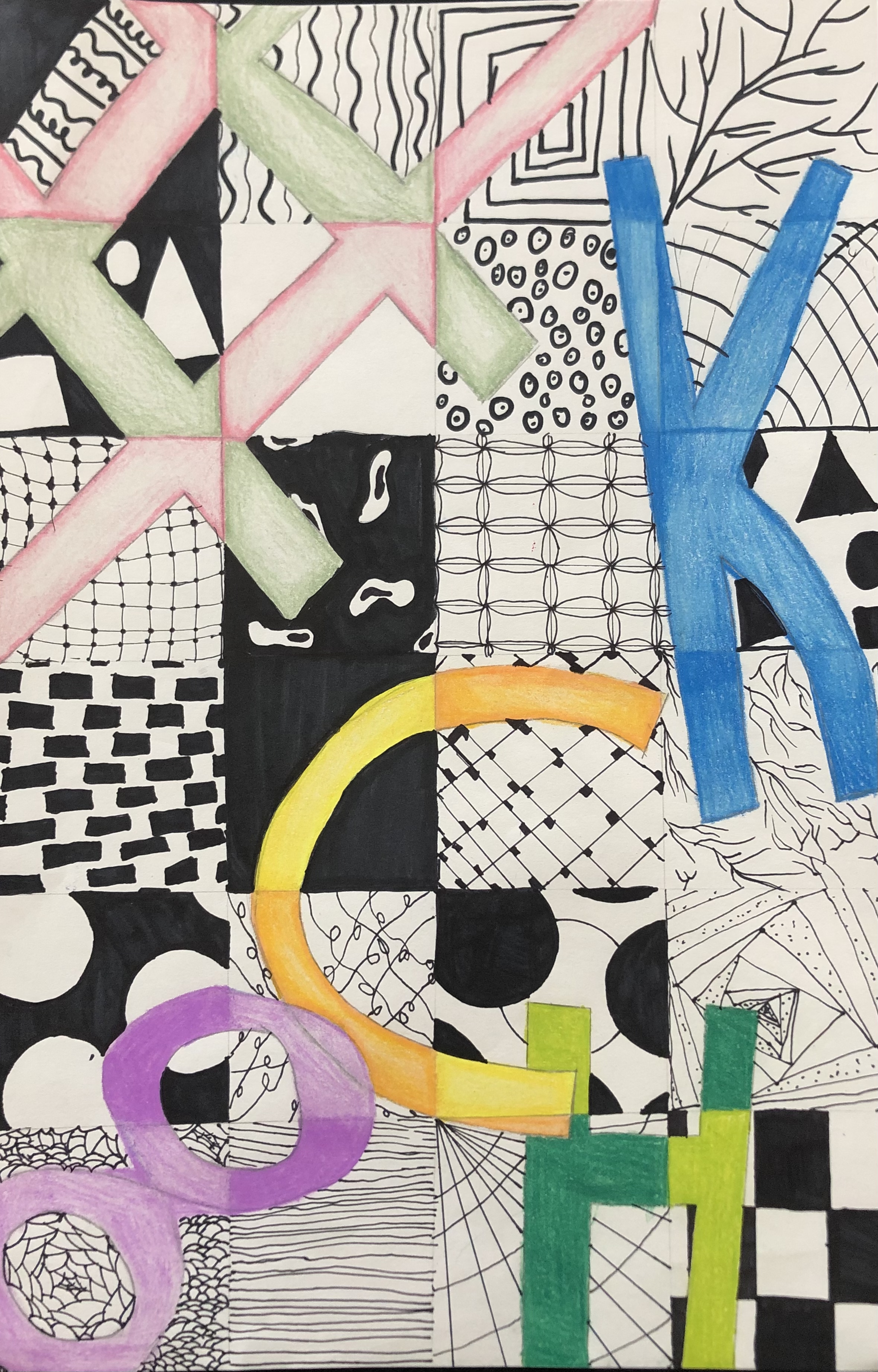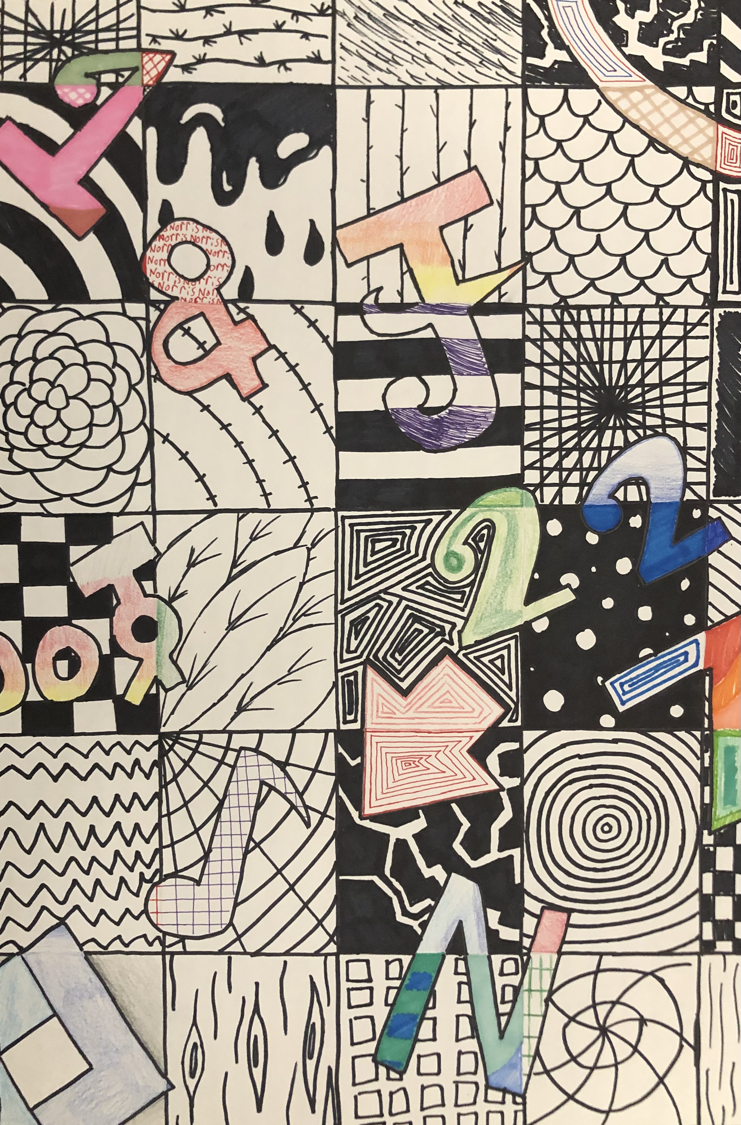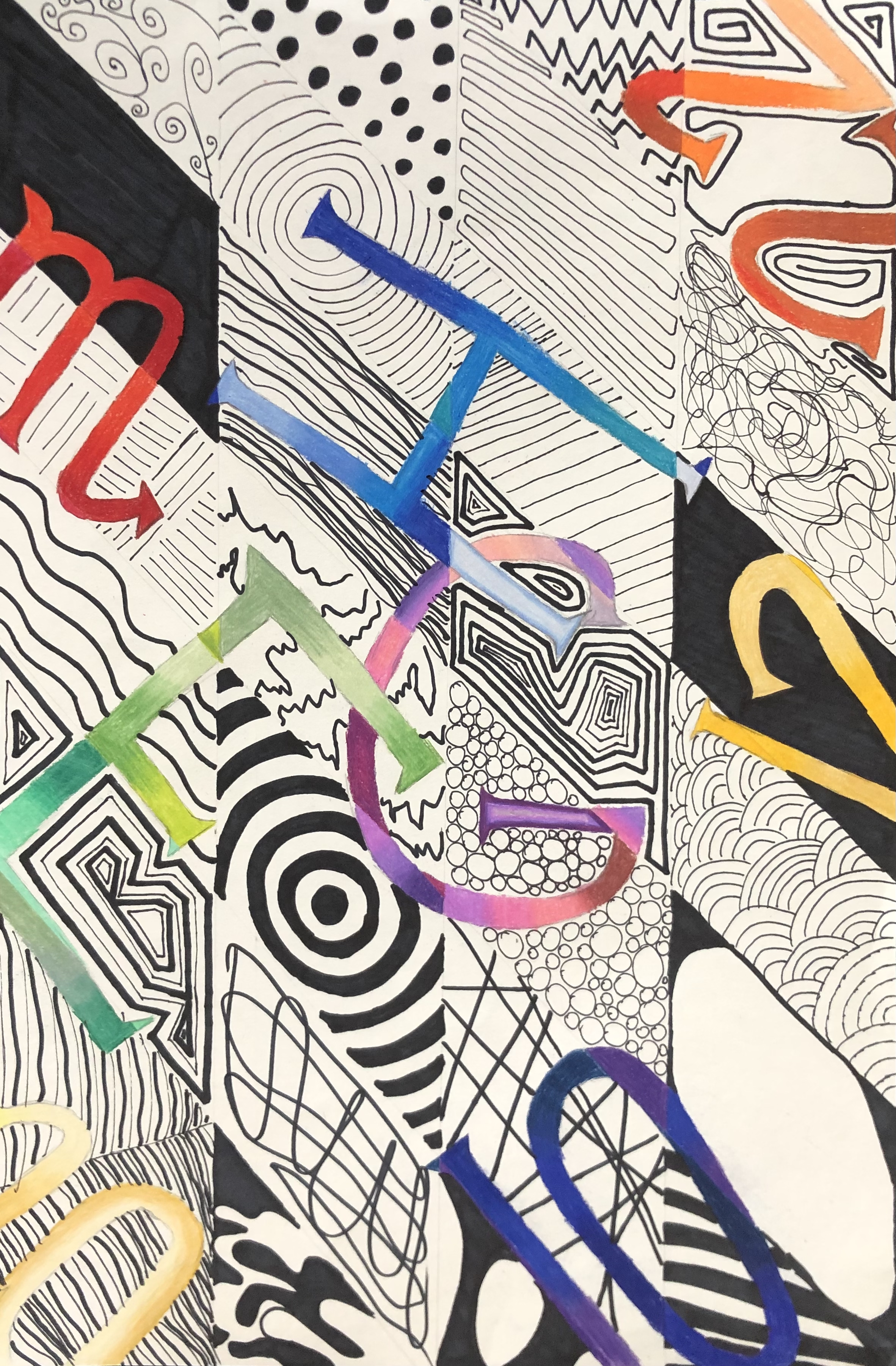 Students were given a chance to show off who they were in a unique way. In class, we talked about the significance of written language and how it could be used in an abstract way to represent a person (portrait). After learning the basics of typography, students used their computers to look up different fonts they could hand-draw for their project. Students used letters, numbers, and symbols to express their identity in their artwork.
