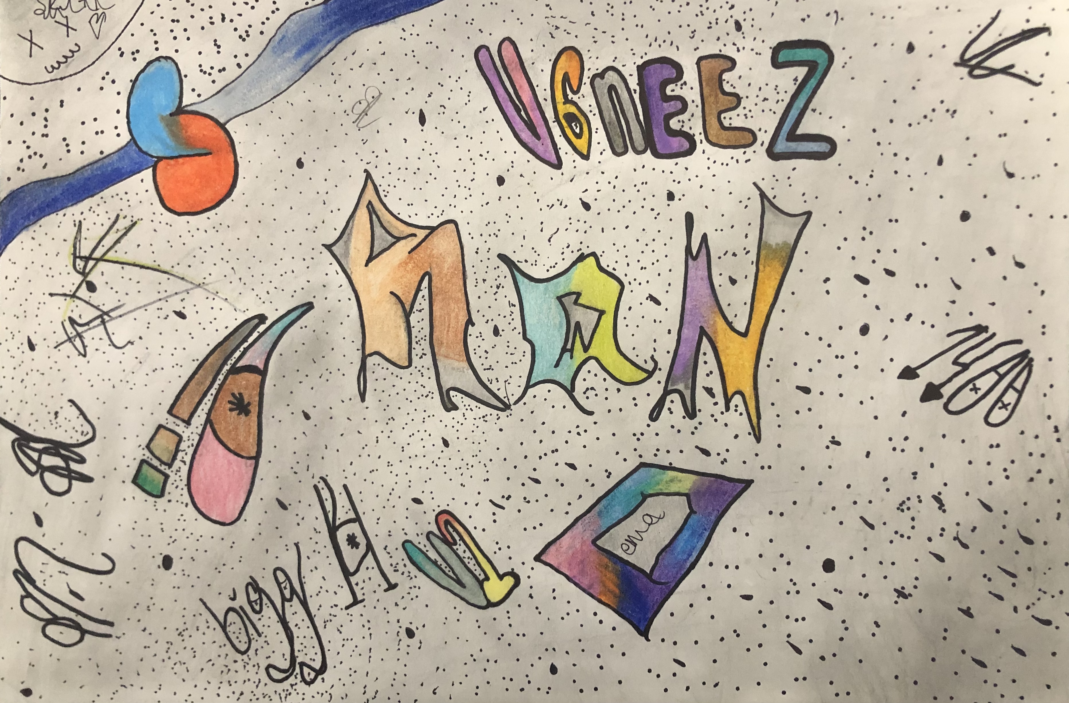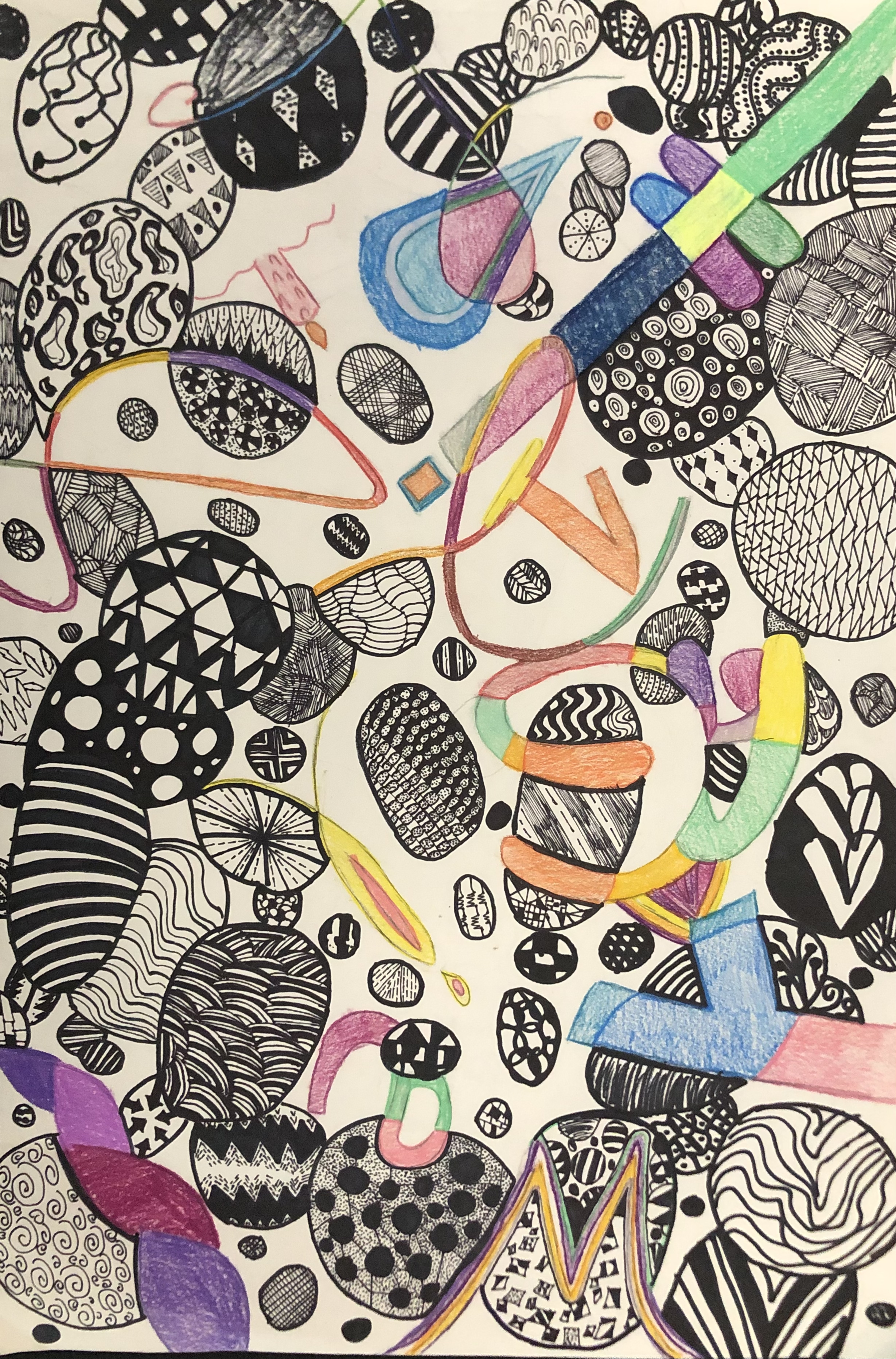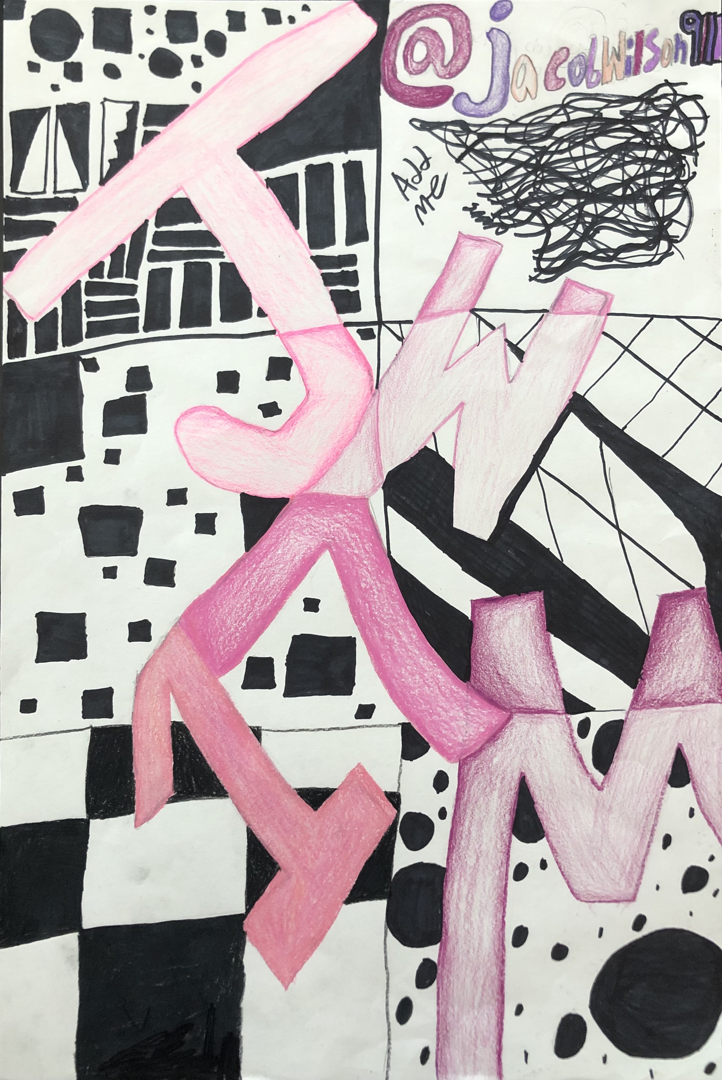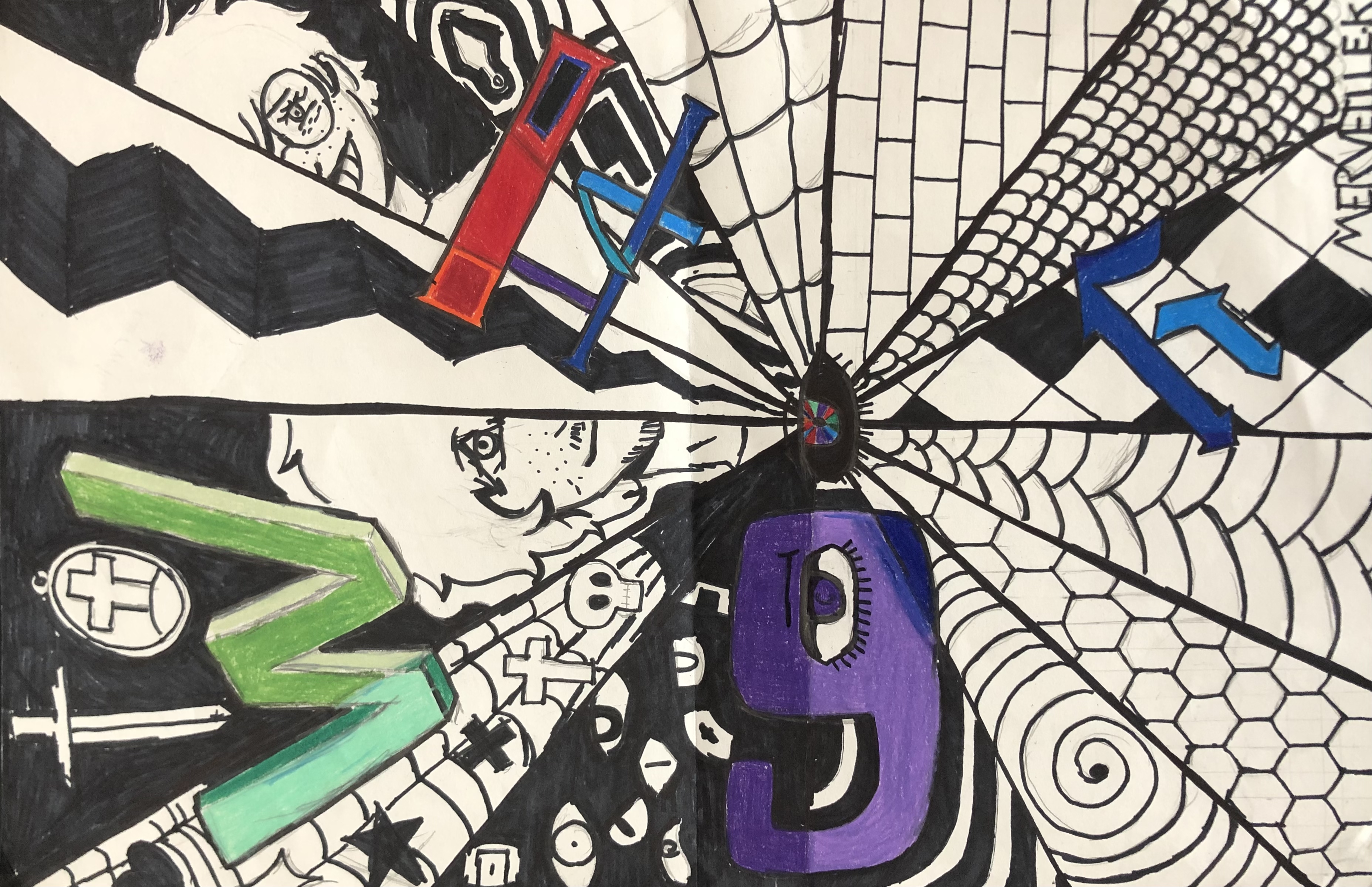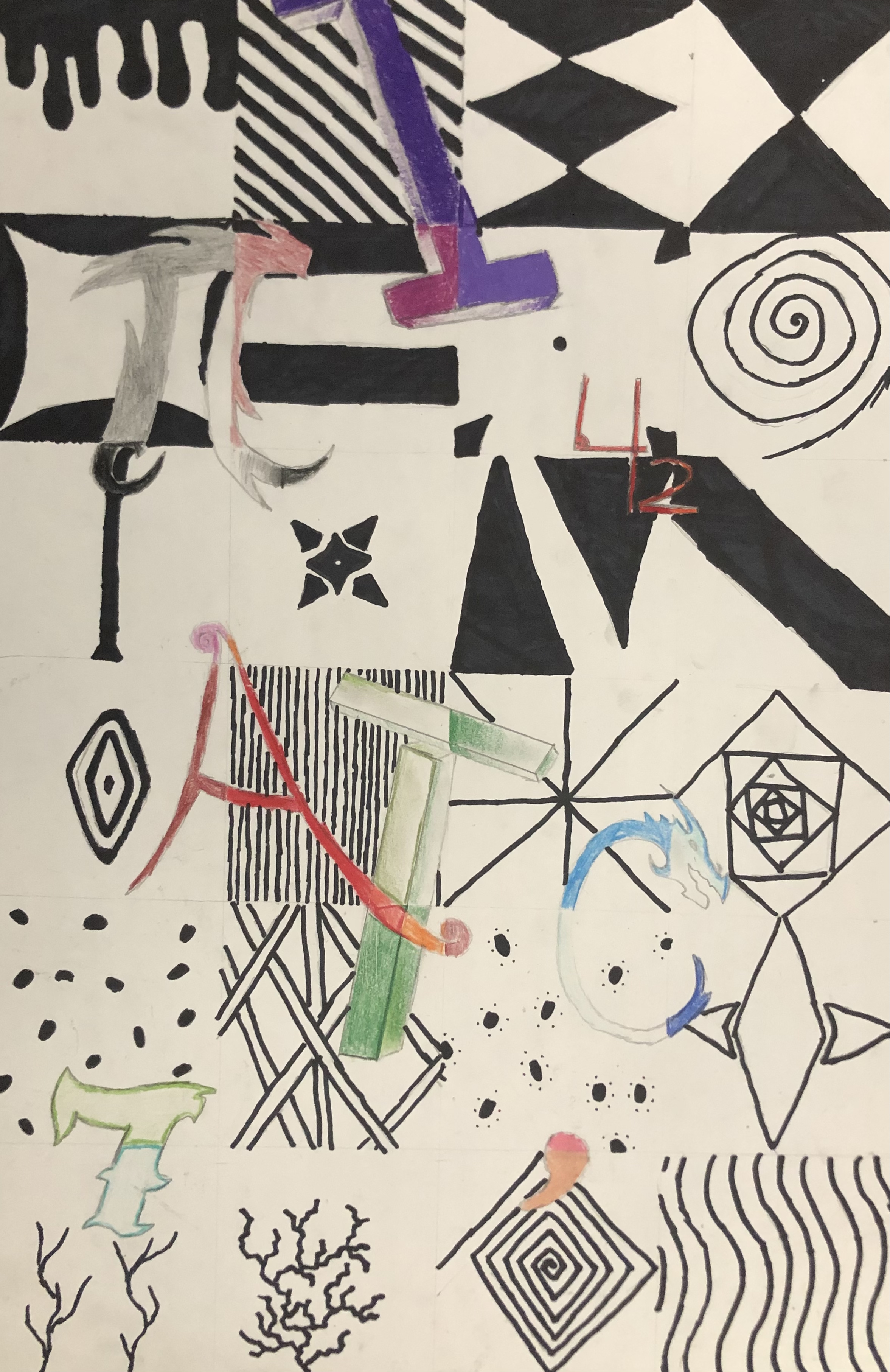 Students were given a chance to show off who they were in a unique way. In class, we talked about the significance of written language and how it could be used in an abstract way to represent a person (portrait). After learning the basics of typography, students used their computers to look up different fonts they could hand-draw for their project. Students used letters, numbers, and symbols to express their identity in their artwork.