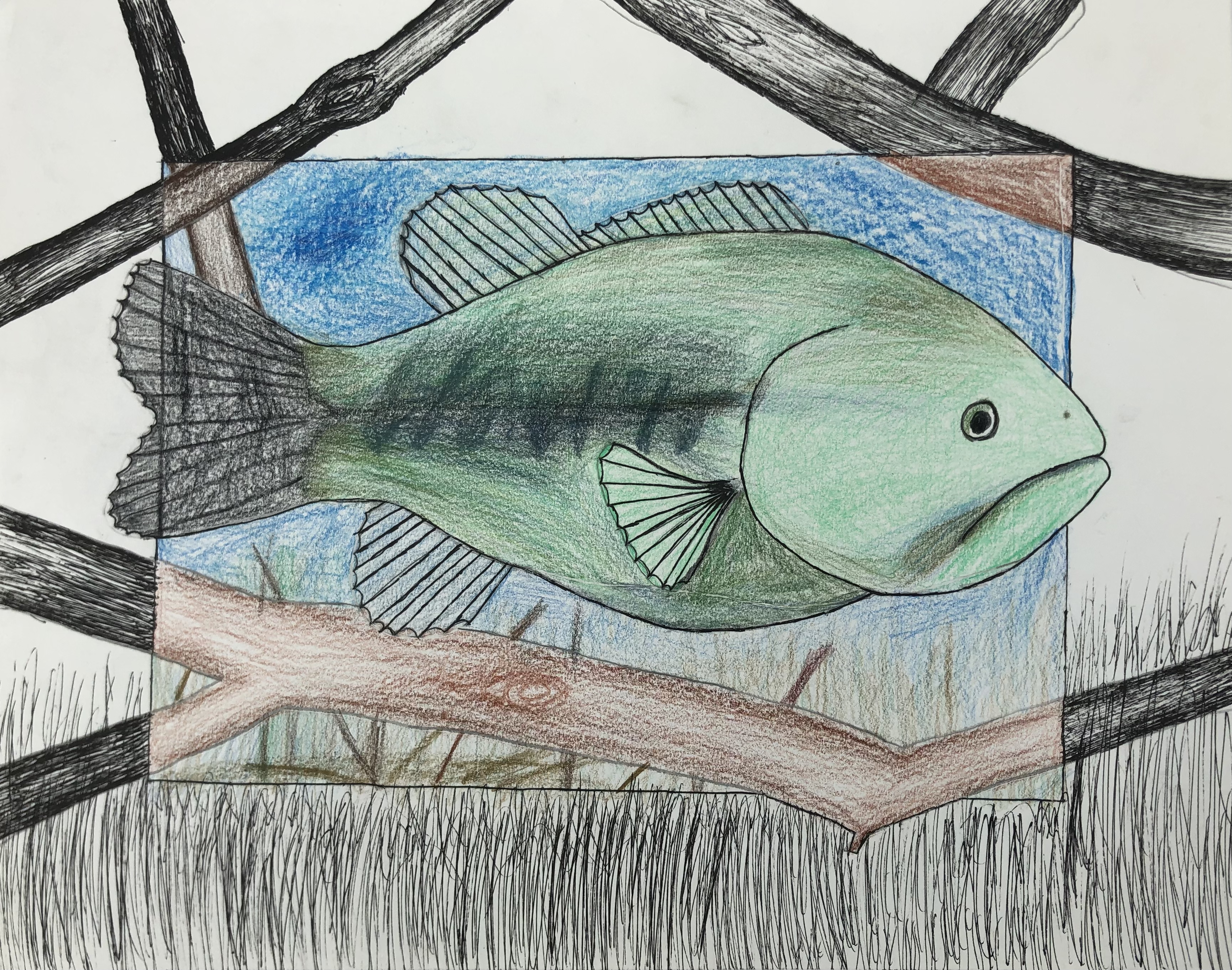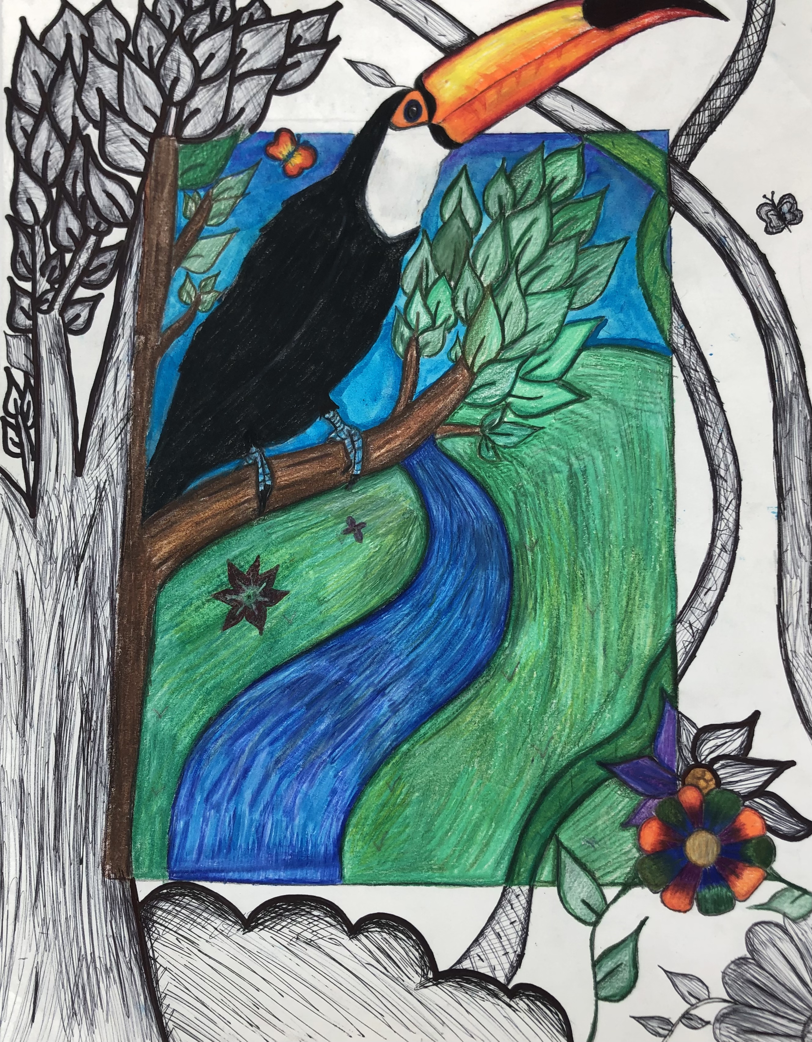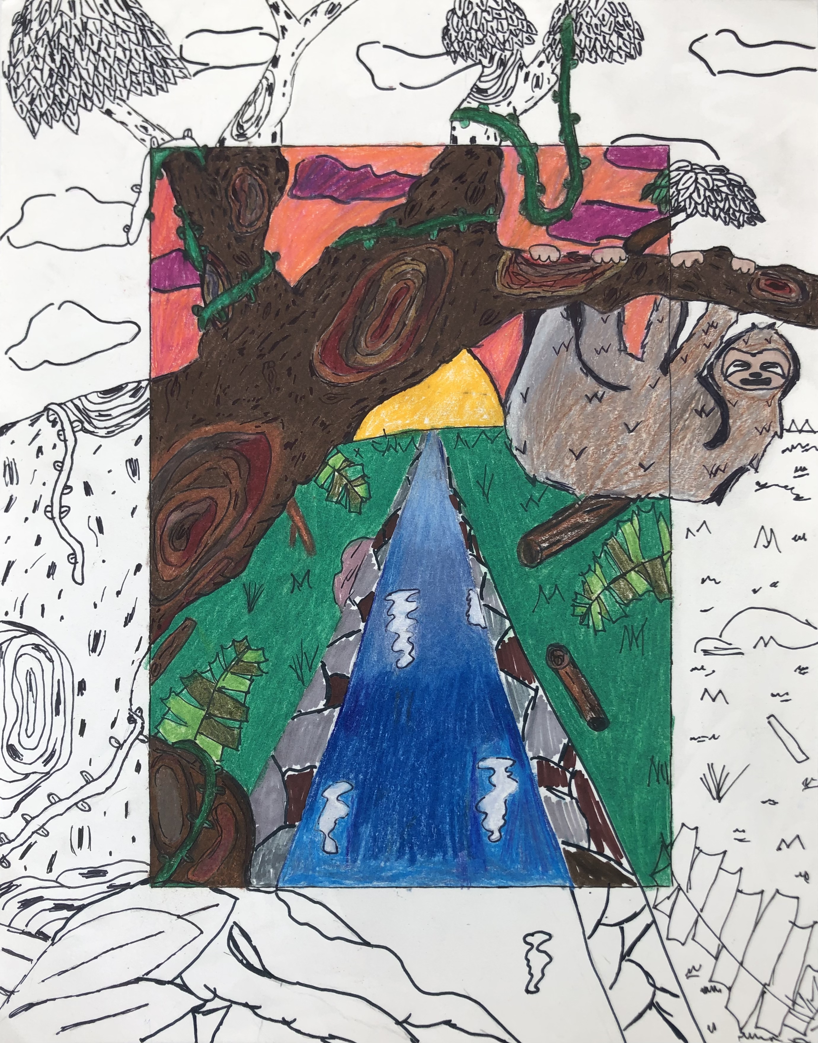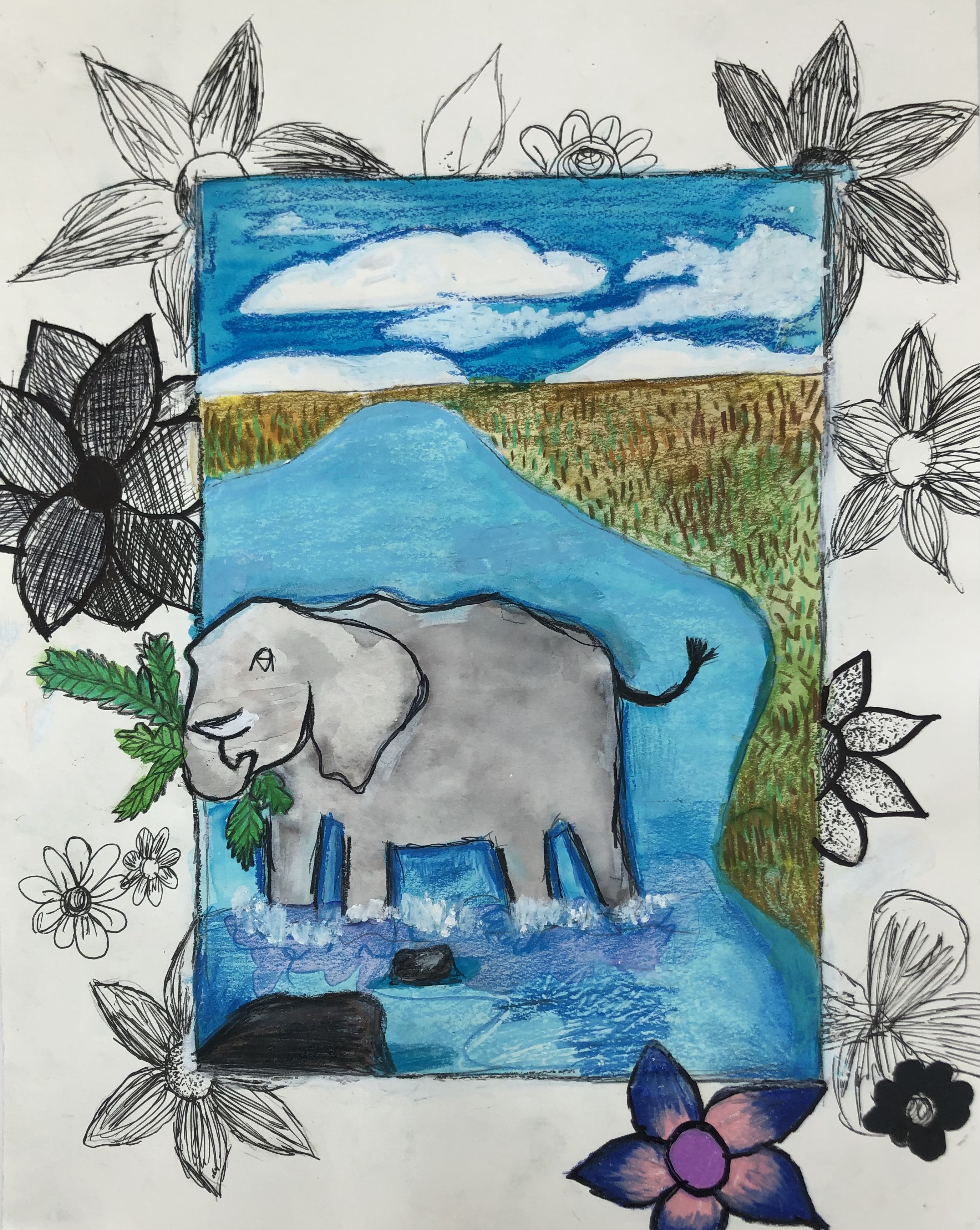 Students were given a choice of material to add color to their project. Most students used colored pencil, though many chose watercolor, marker, and oil pastel. Students were also encouraged to mix materials if desired.