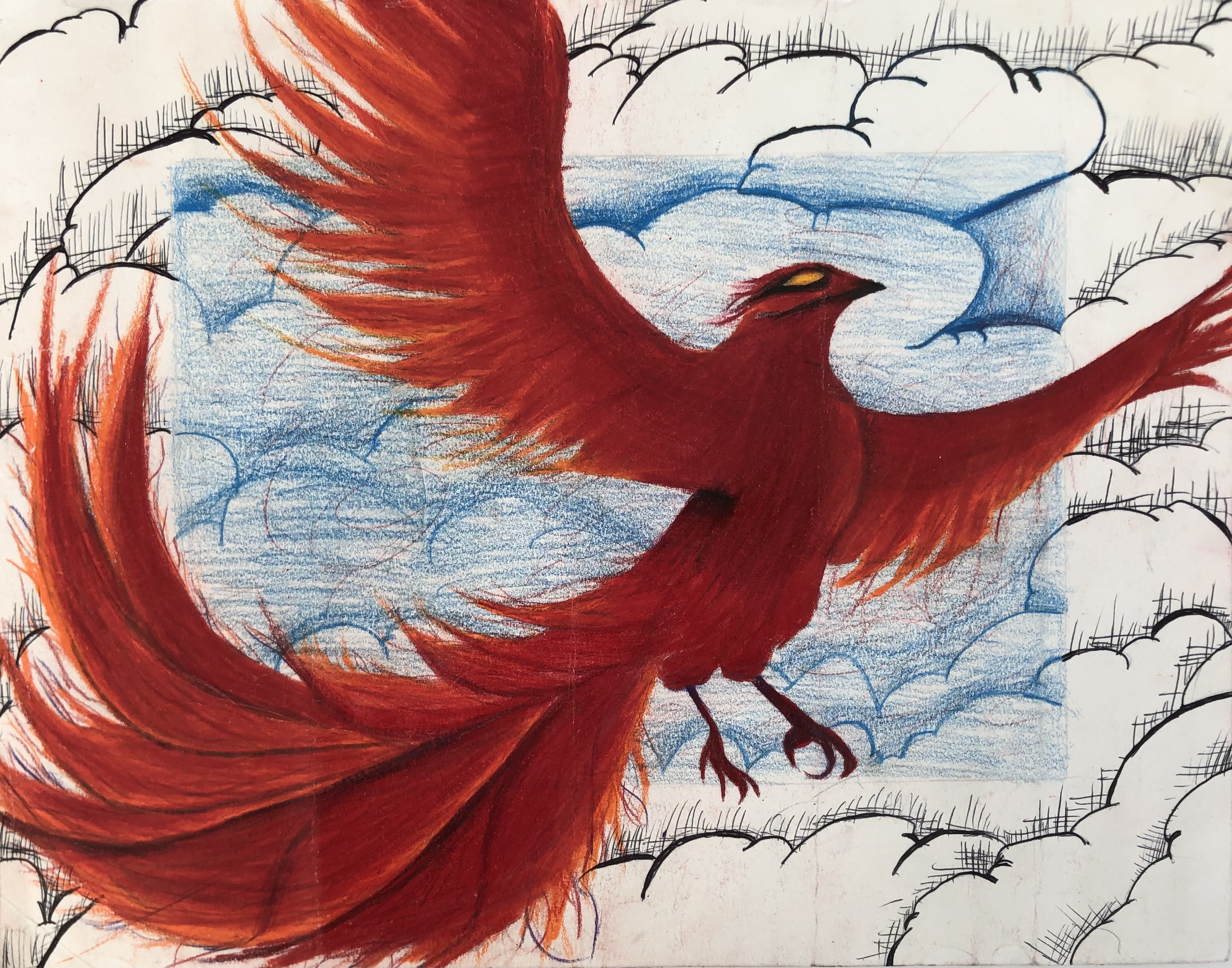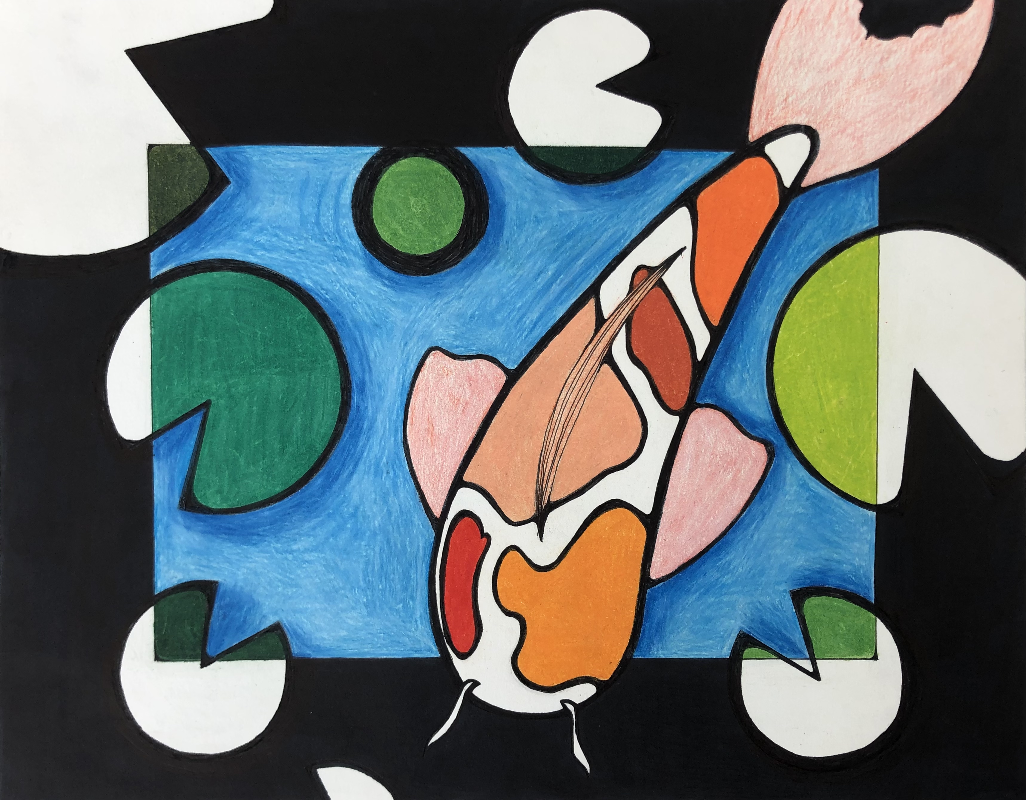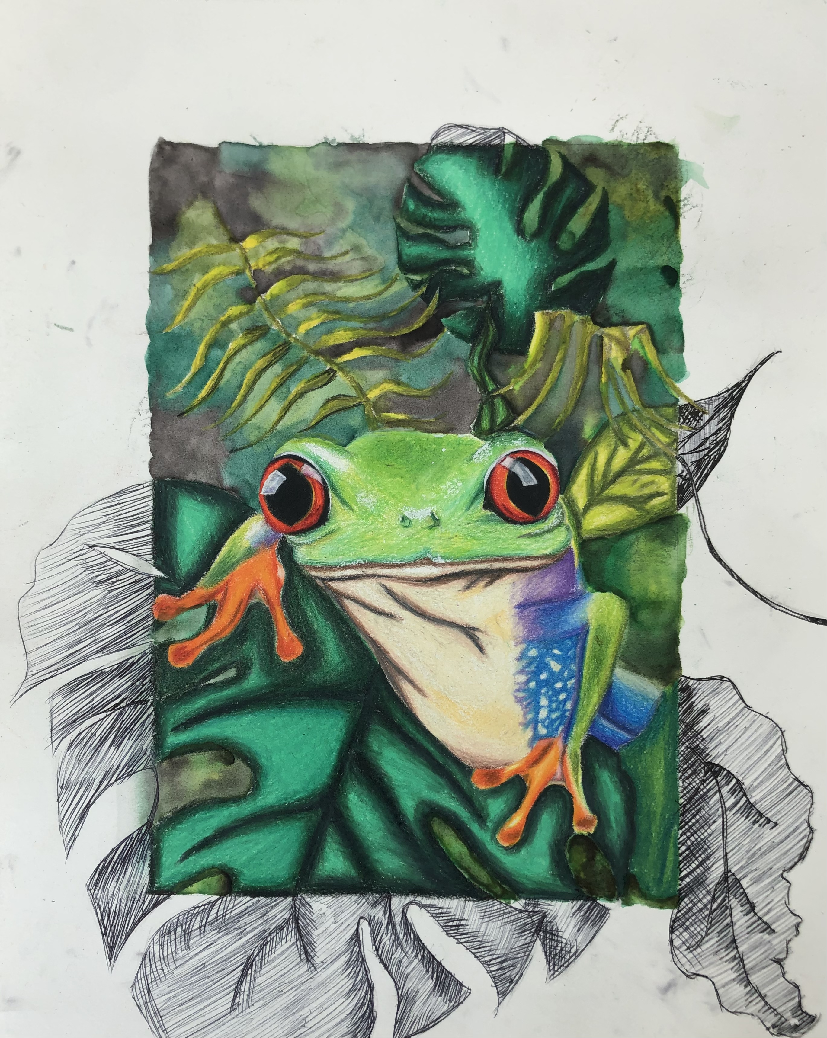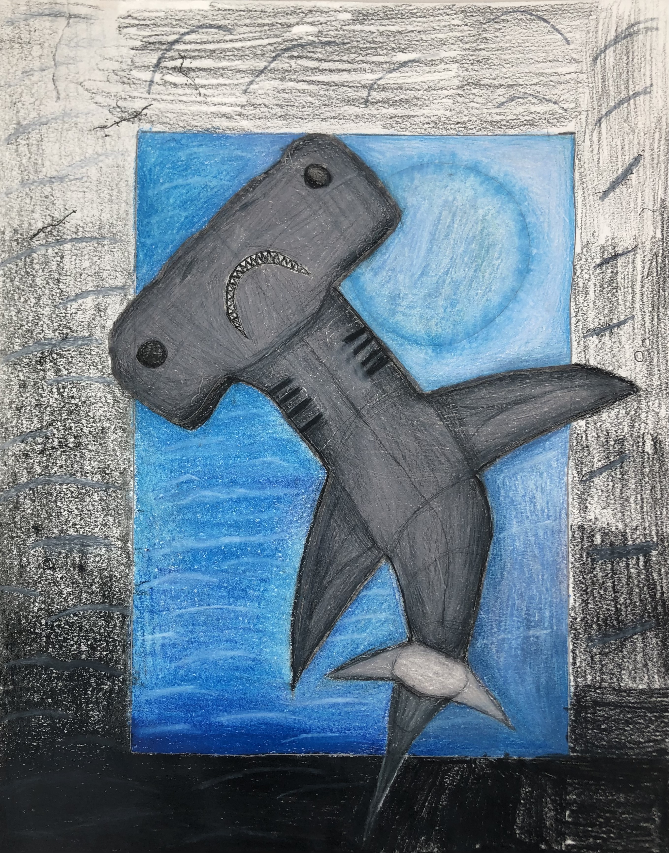 Students were given a choice of material to add color to their project. Most students used colored pencil, though many chose watercolor, marker, and oil pastel. Students were also encouraged to mix materials if desired.
