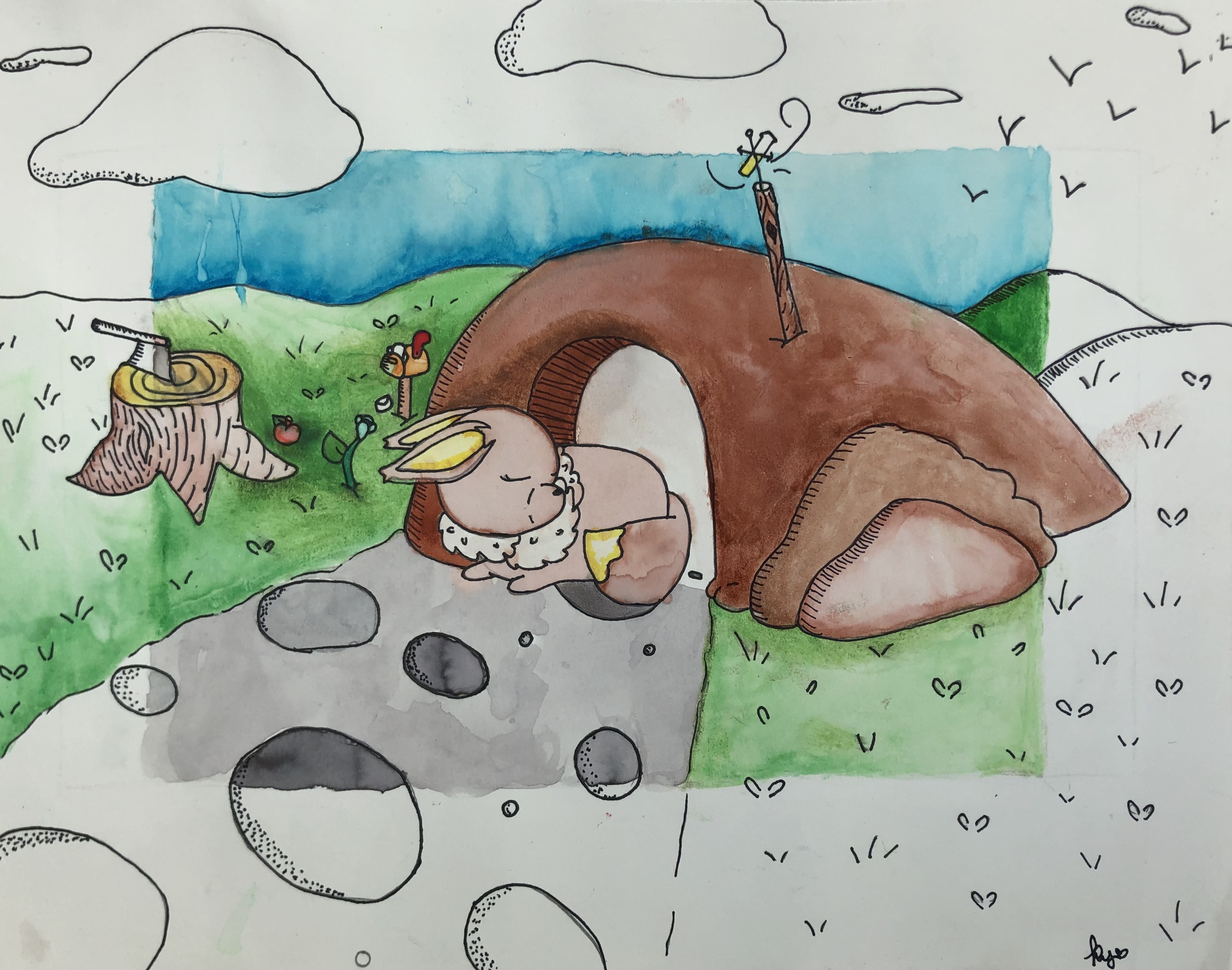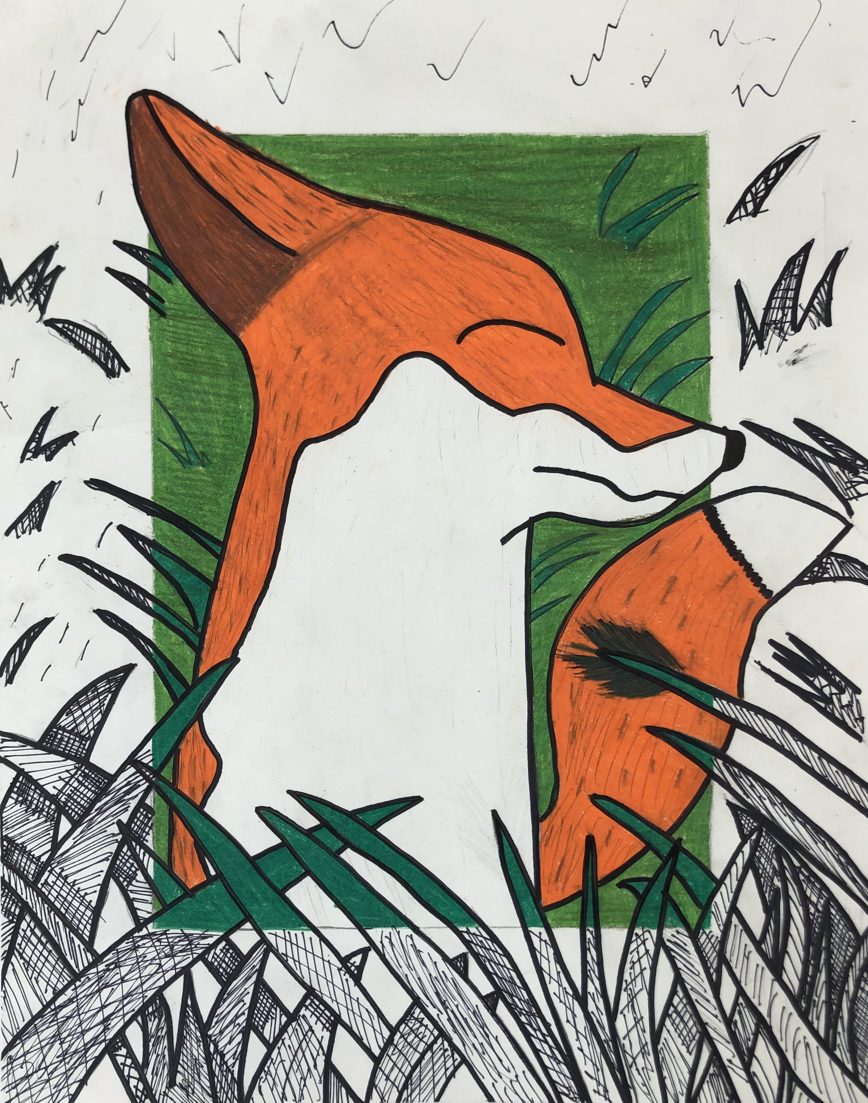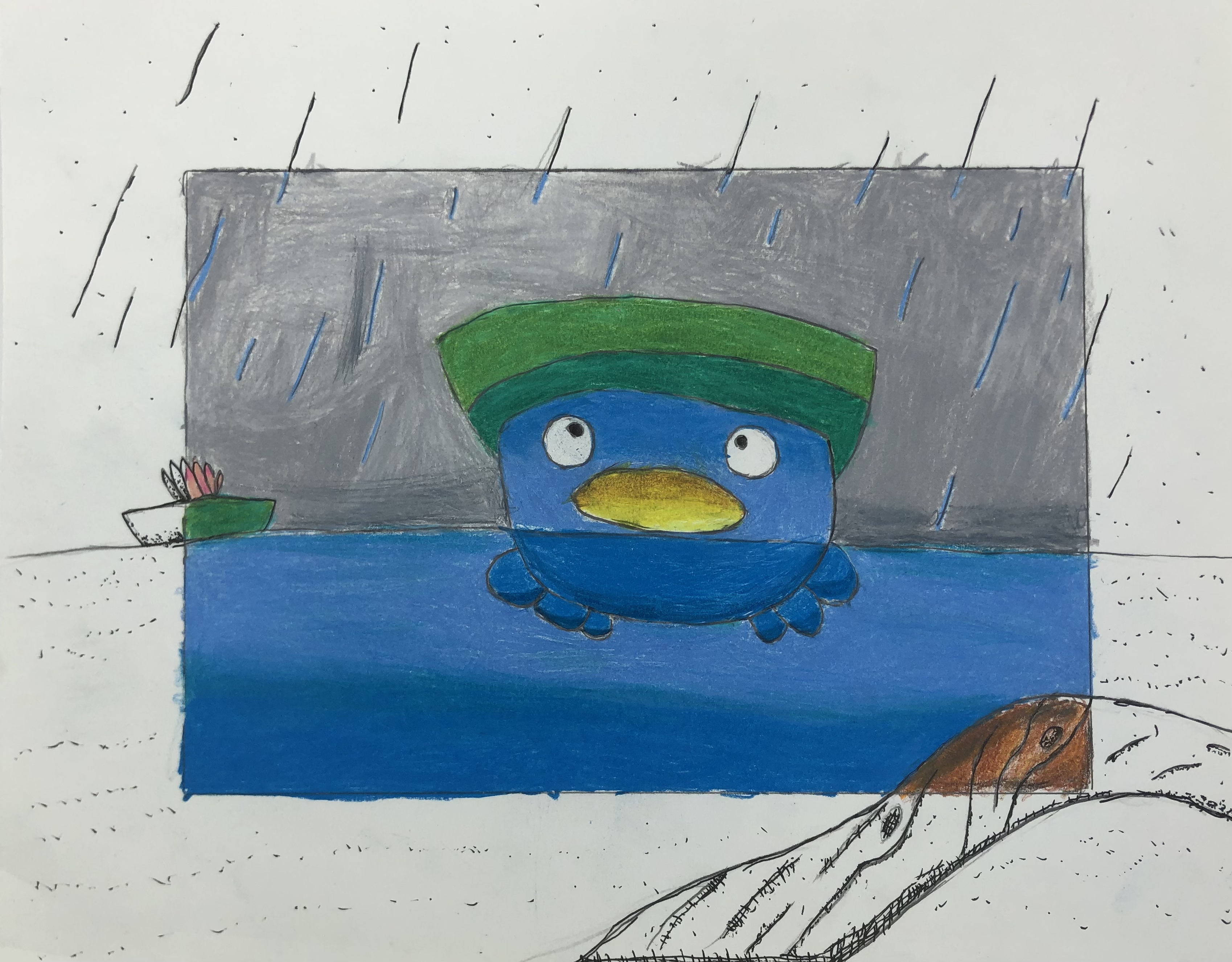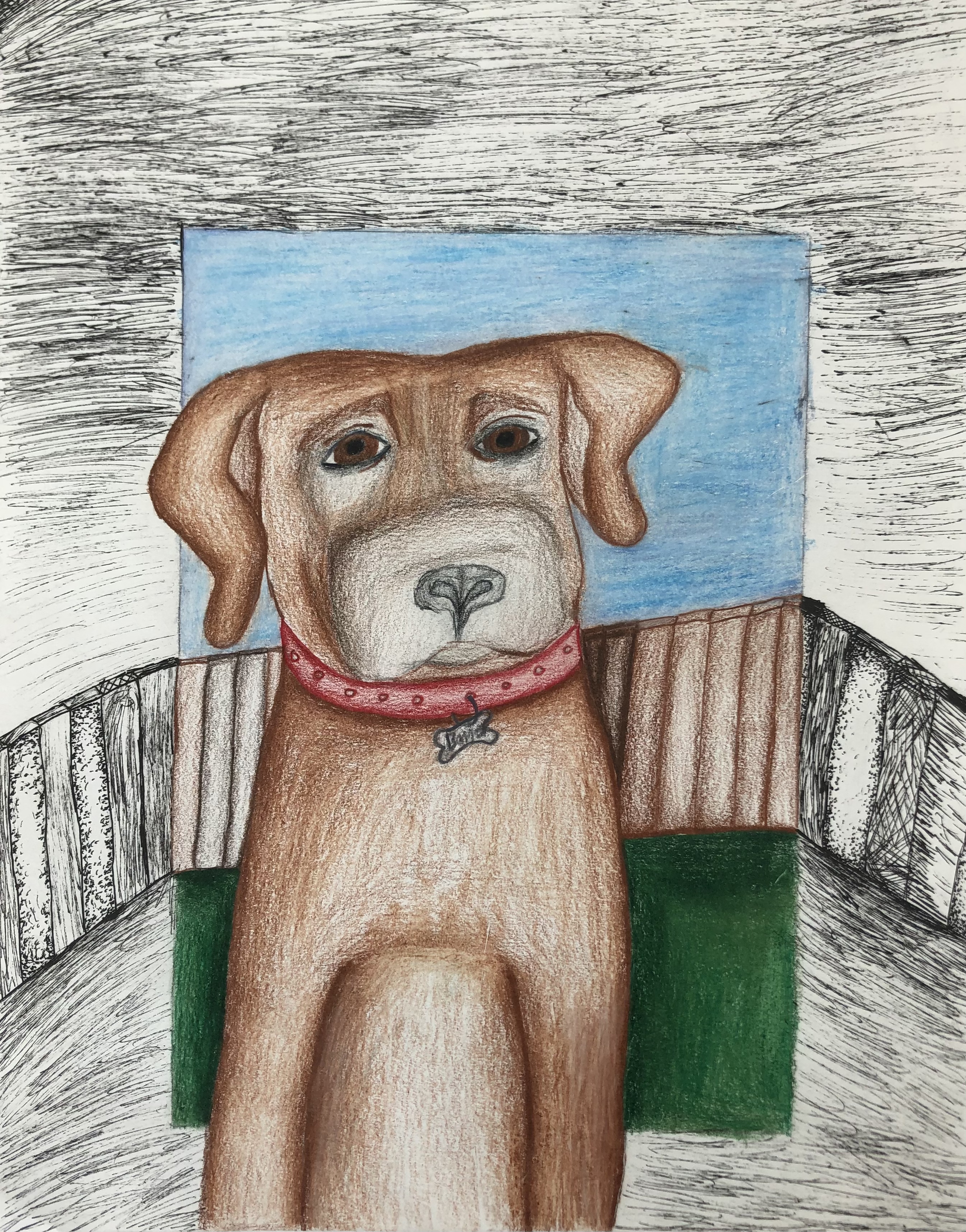 Students were given a choice of material to add color to their project. Most students used colored pencil, though many chose watercolor, marker, and oil pastel. Students were also encouraged to mix materials if desired.