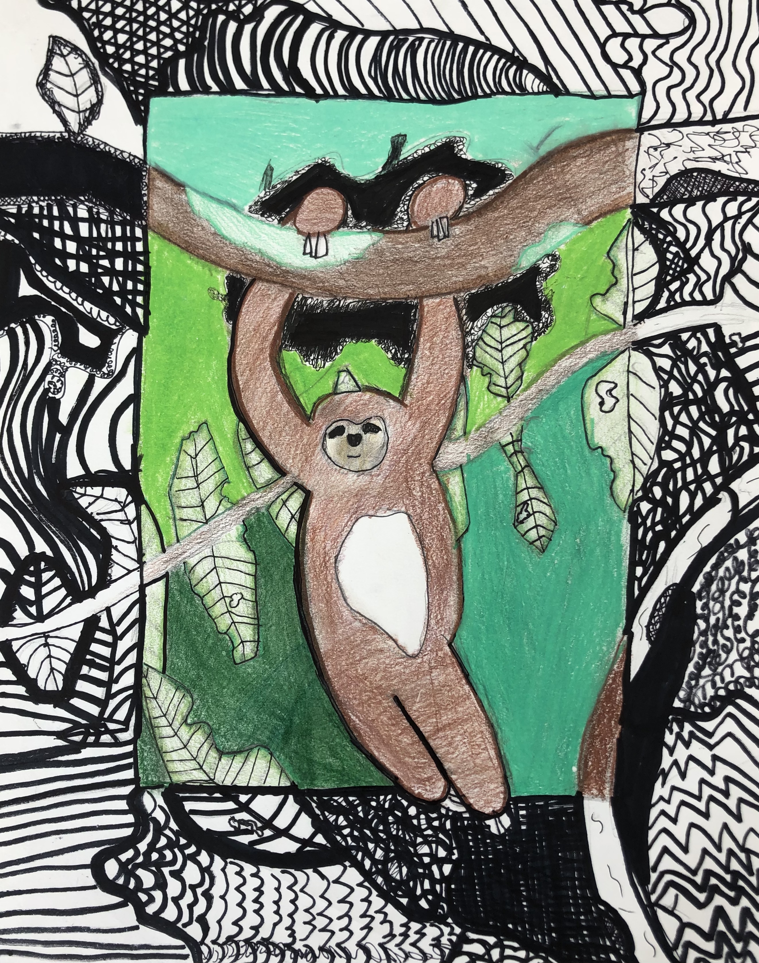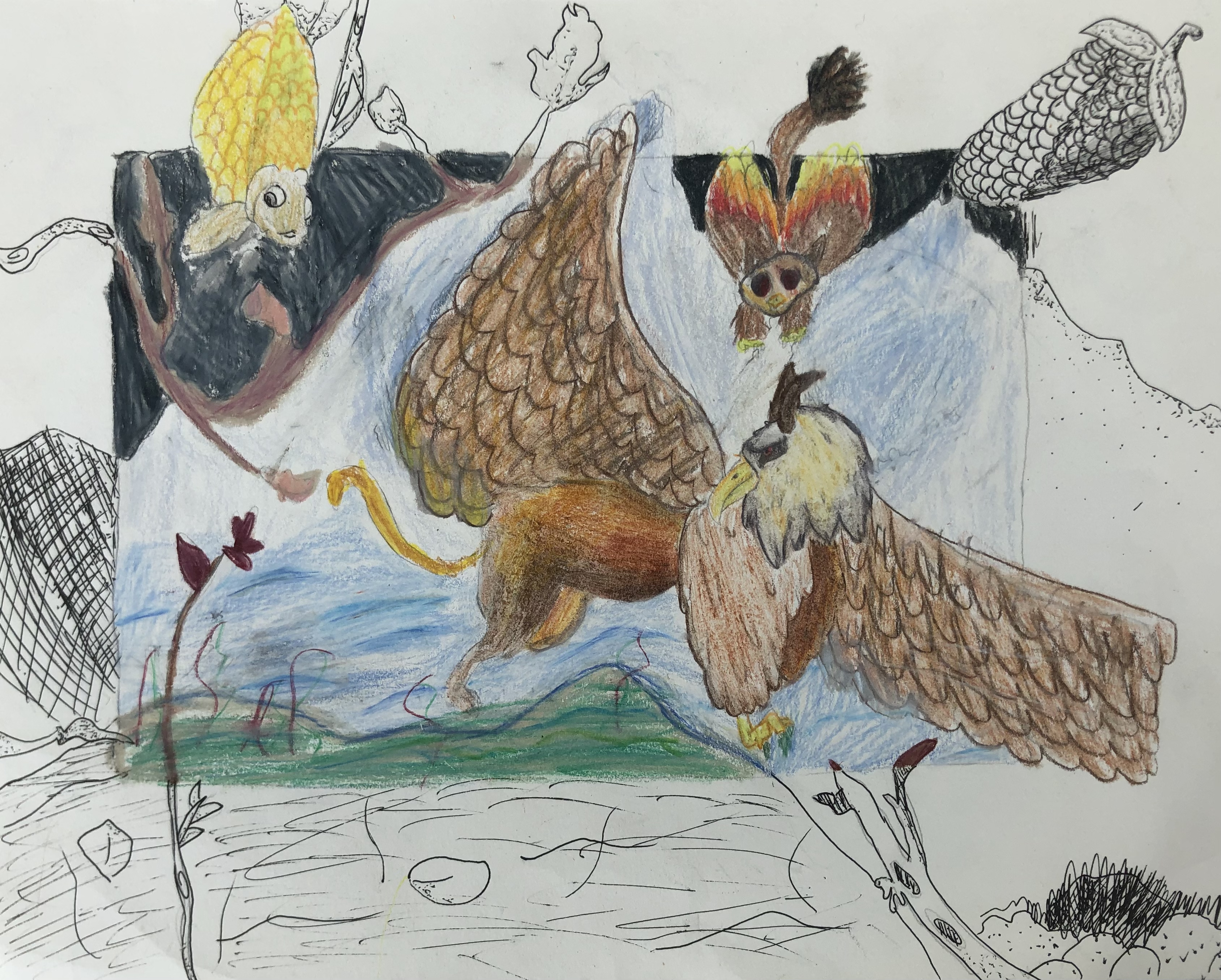 Once students selected and researched their creatures, they created a to-scale sketch of their composition. During class, the principle of design balance was discussed and studied by looking at examples from traditional artwork. After their sketch was complete, students transferred their design to their final paper.