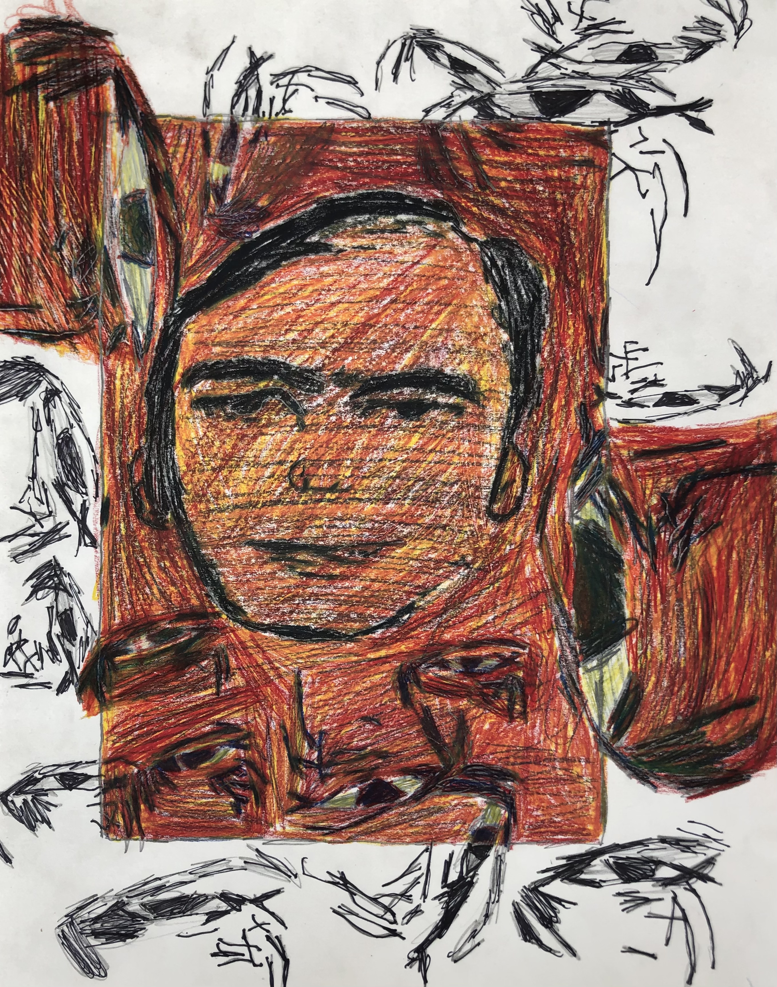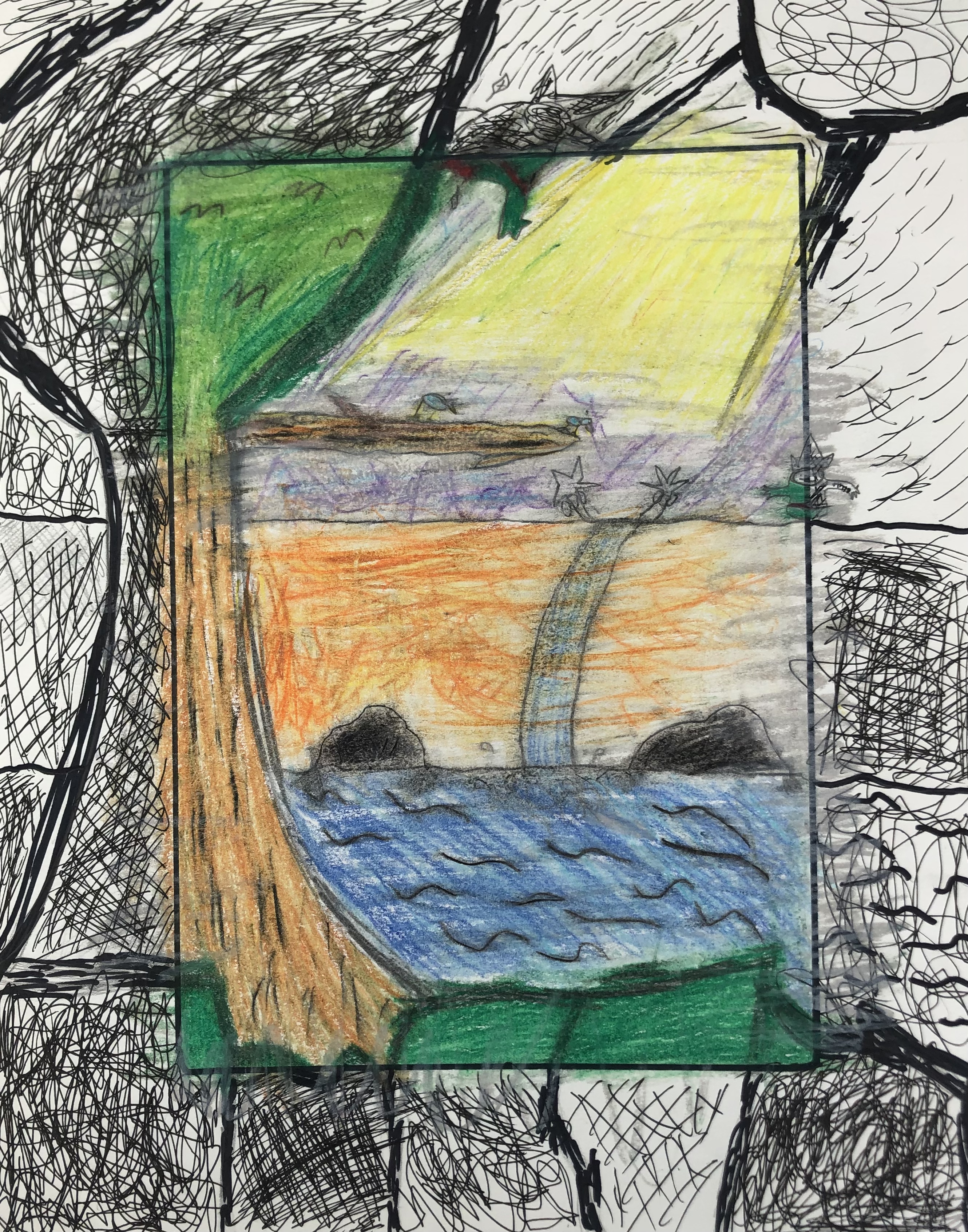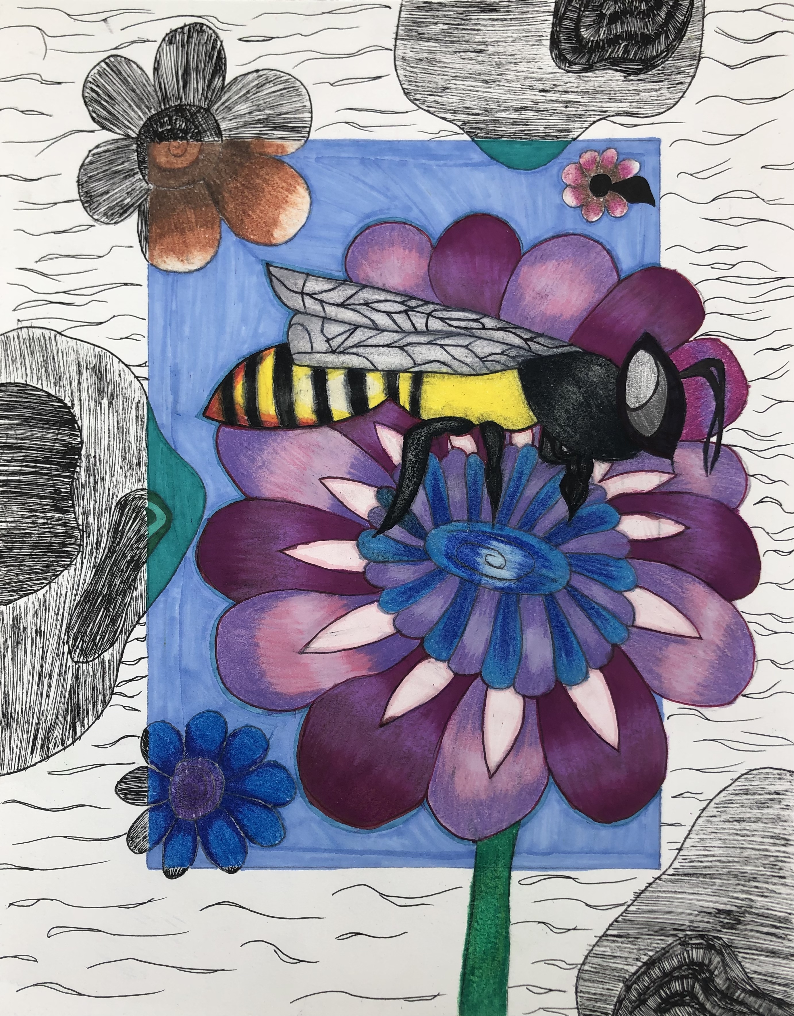 Before moving onto the border, students were taught various ink shading techniques including hatching, cross hatching, stippling, and scribbling. Students used at least one ink technique to create a developed border.