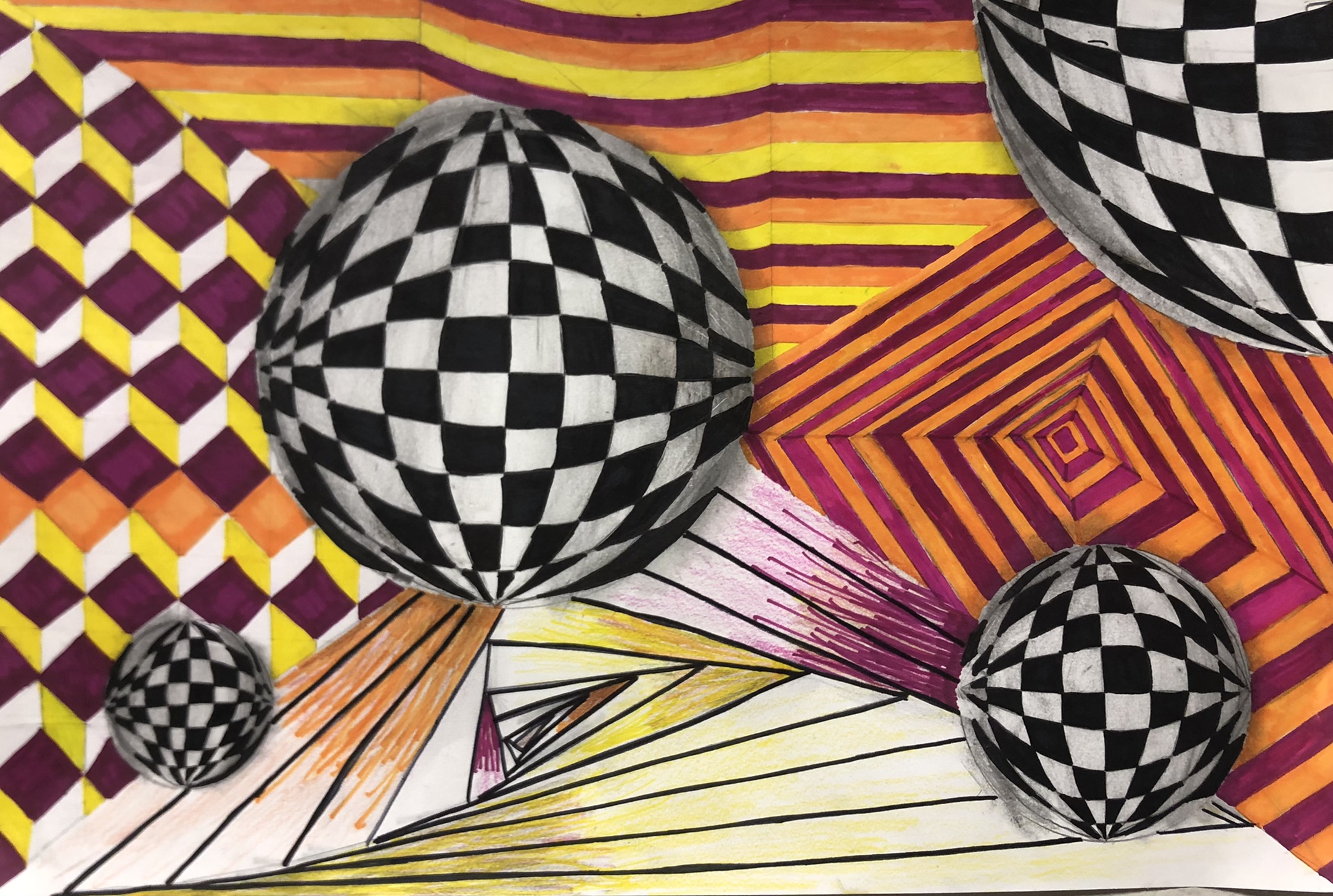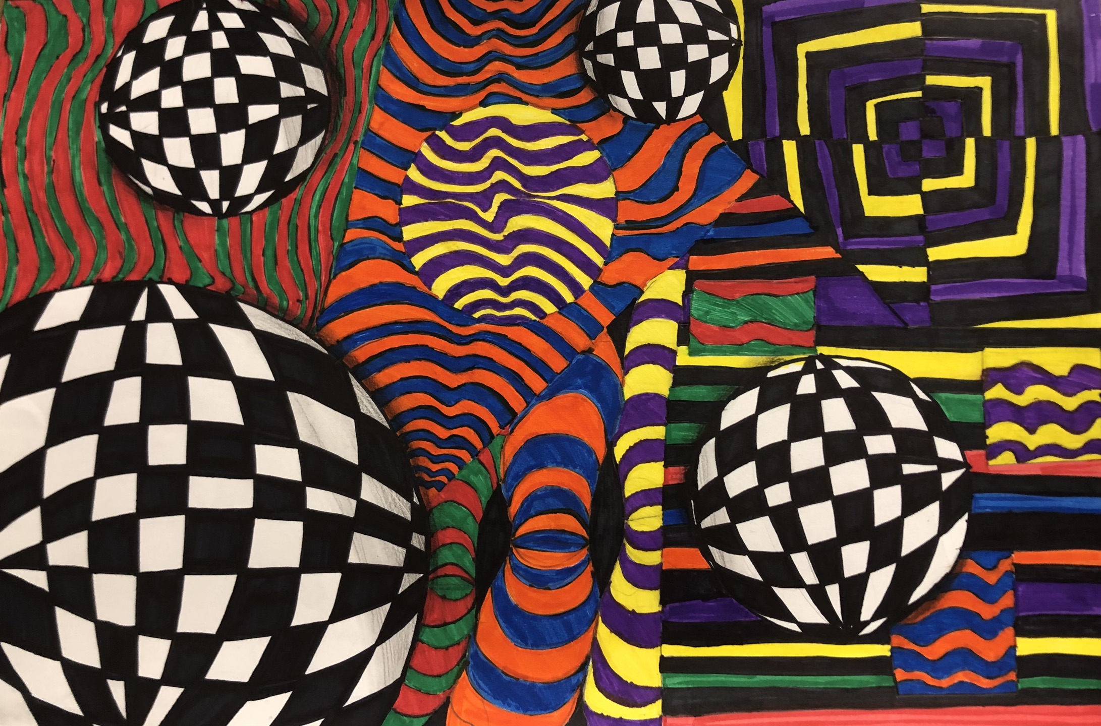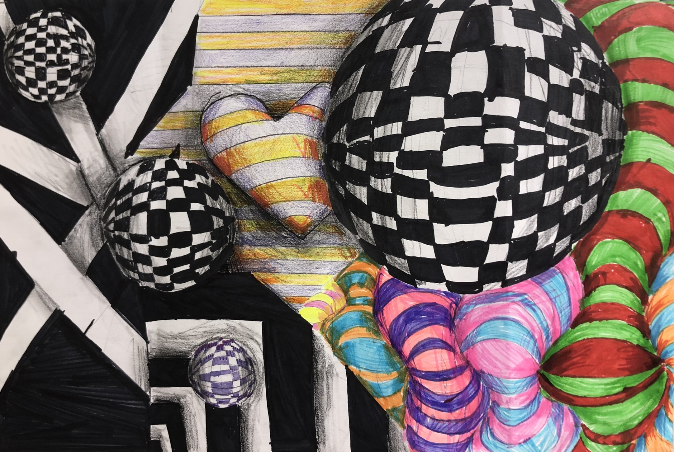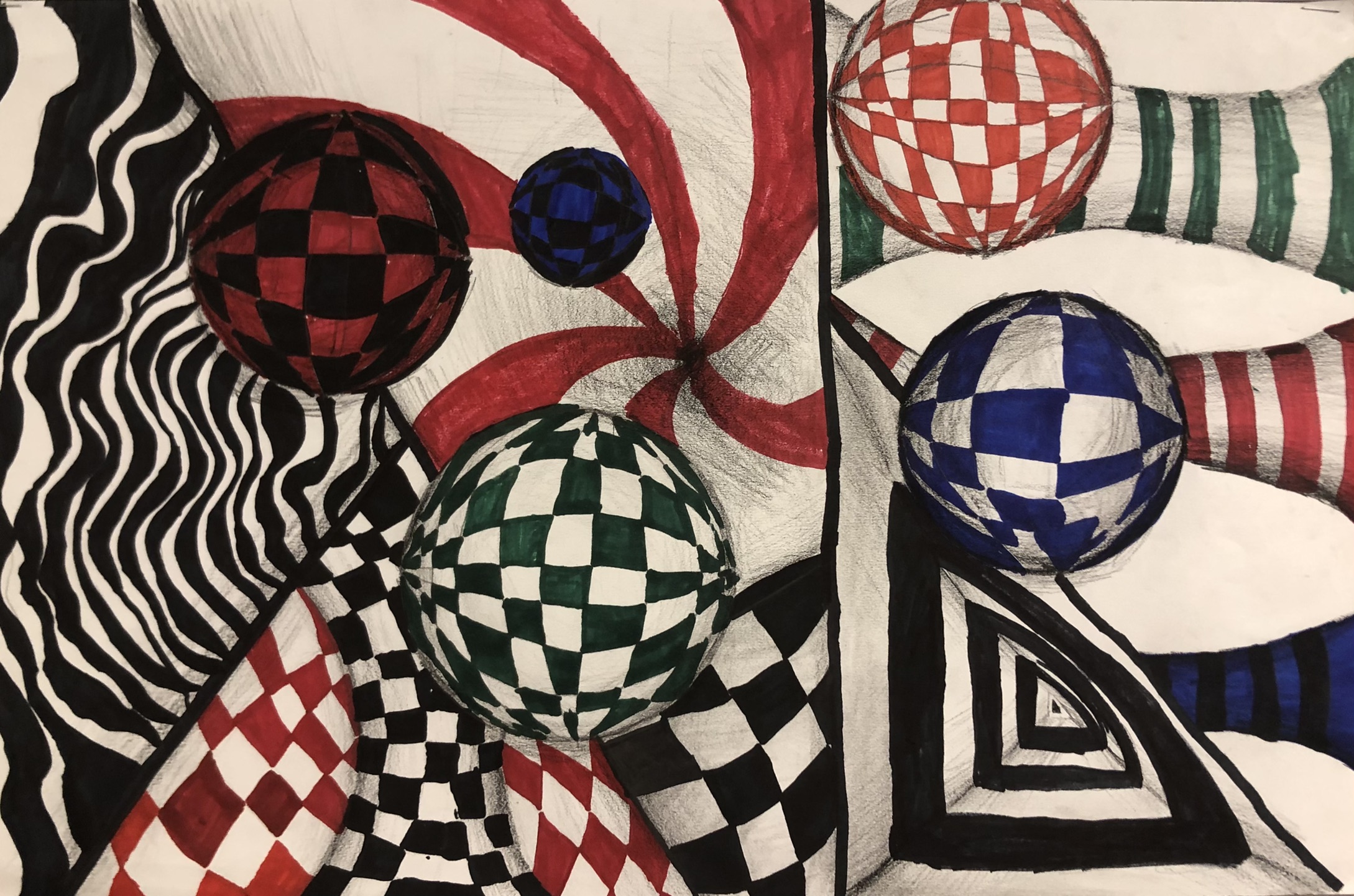For Op-Art Drawings, students were tasked with creating an interesting composition in which multiple forms looked as though they were protruding from the page. Students then filled the backgrounds of their drawings with various Op-Art Designs to create a visually interesting composition.