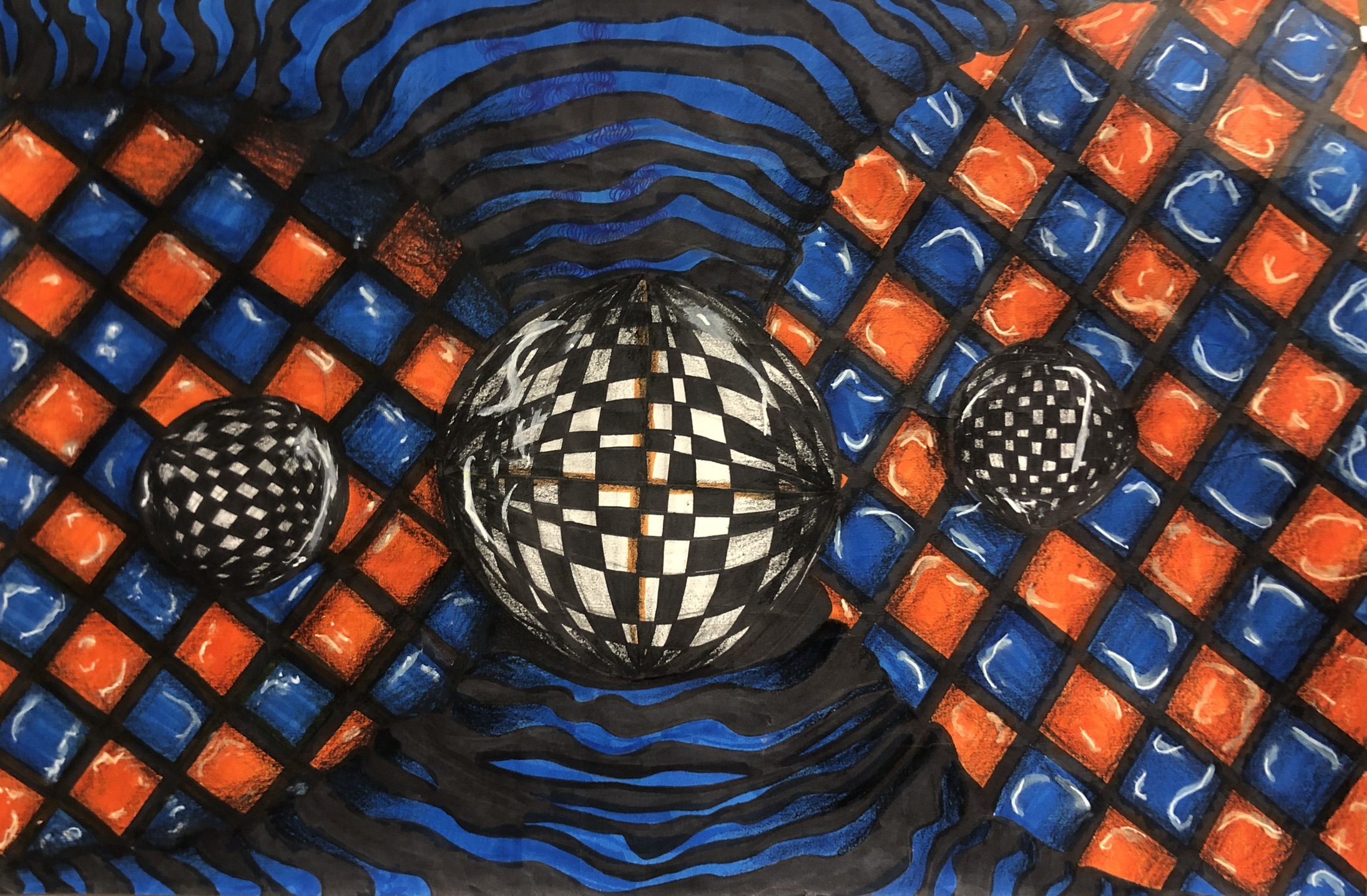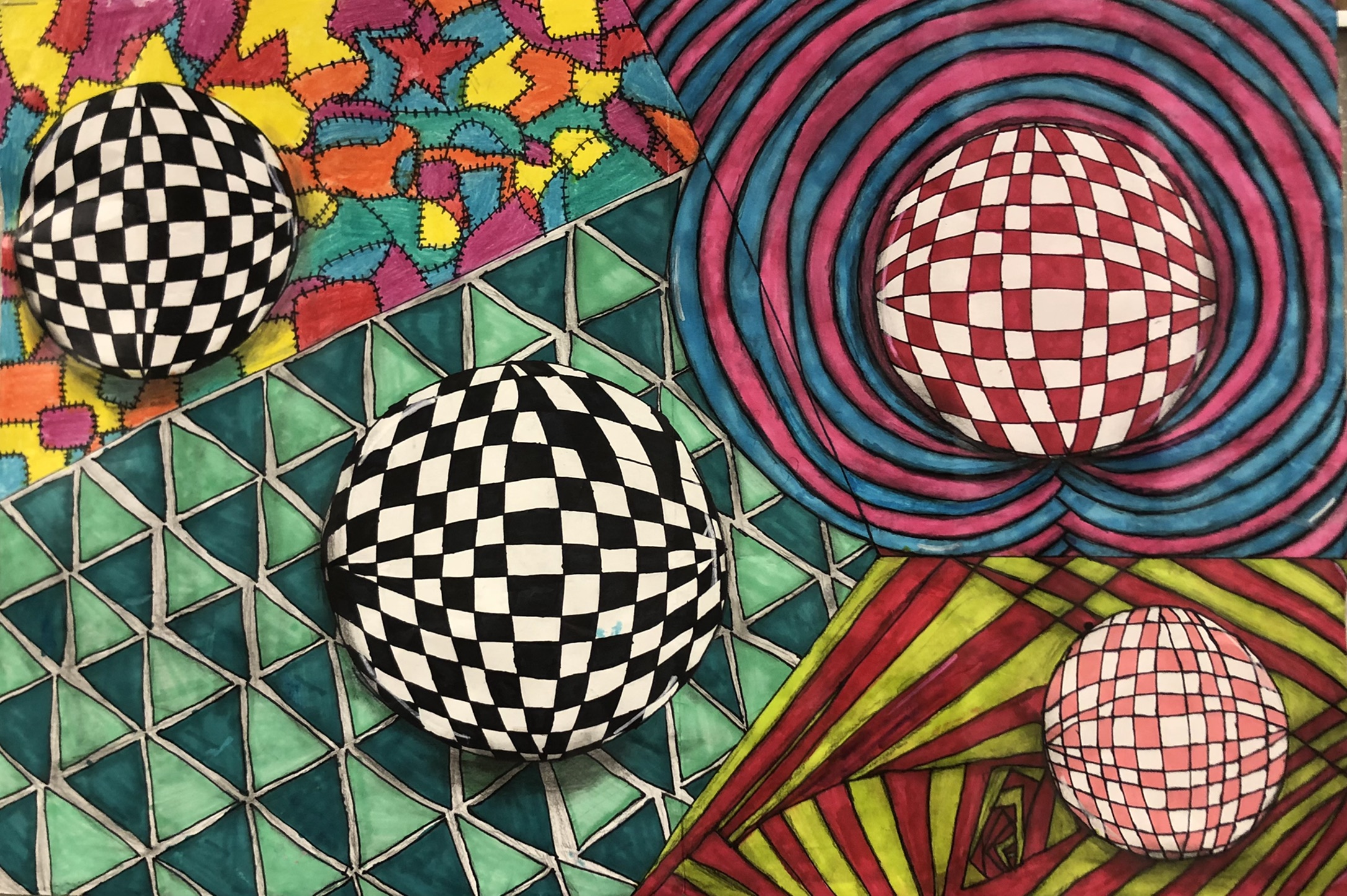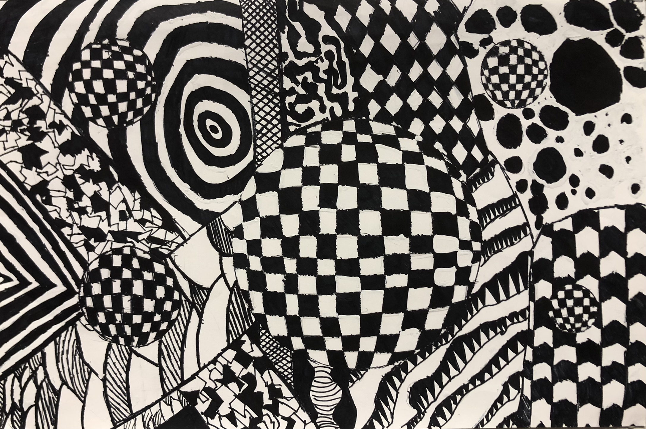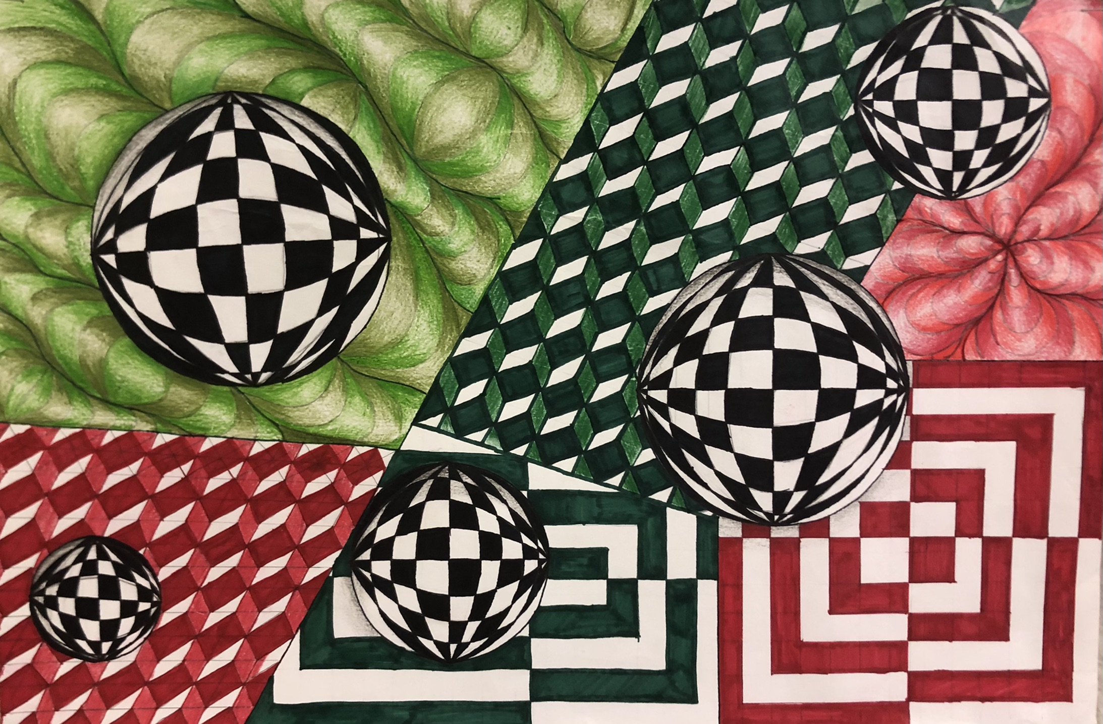 For Op-Art Drawings, students were tasked with creating an interesting composition in which multiple forms looked as though they were protruding from the page. Students then filled the backgrounds of their drawings with various Op-Art Designs to create a visually interesting composition.