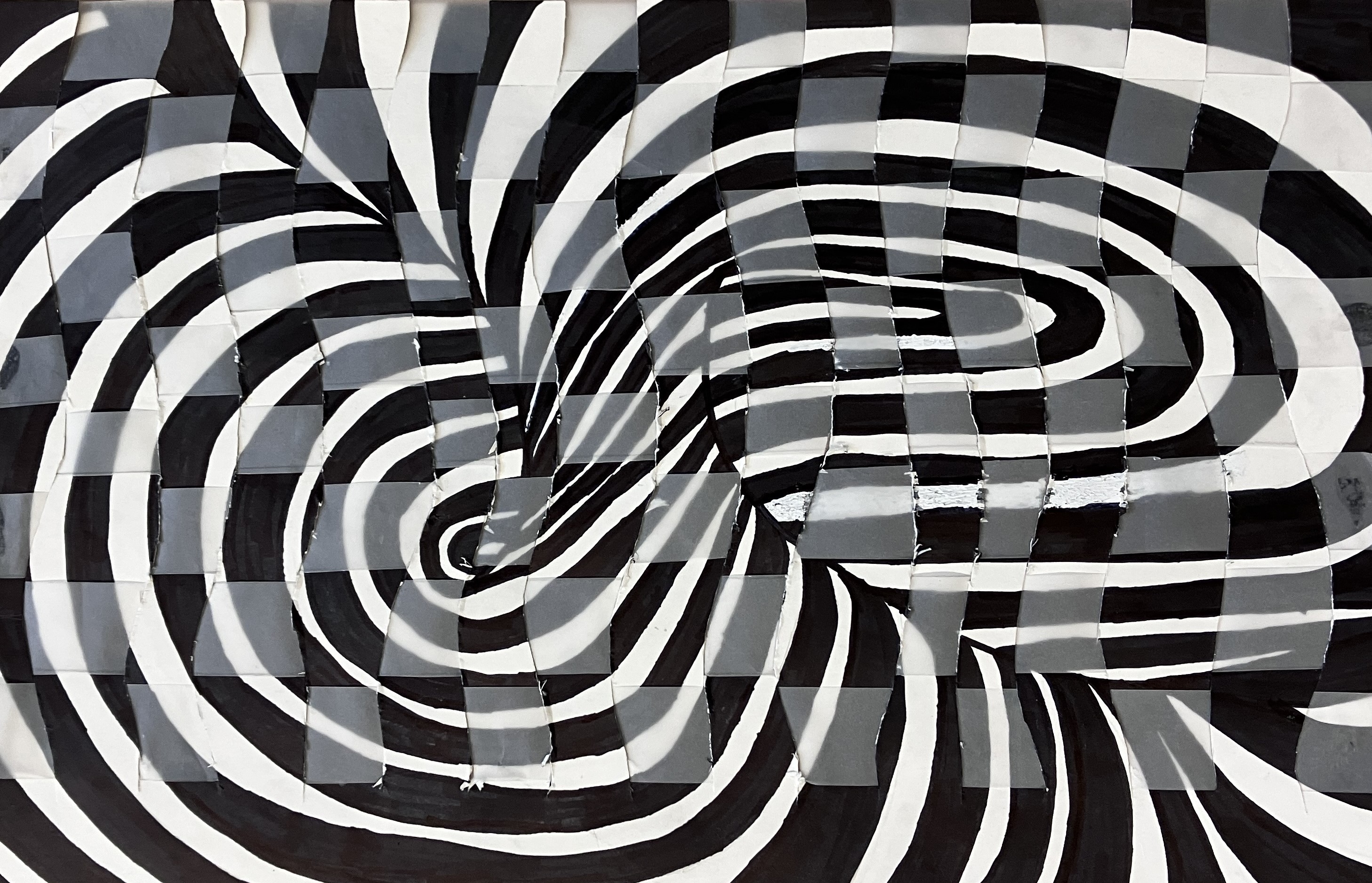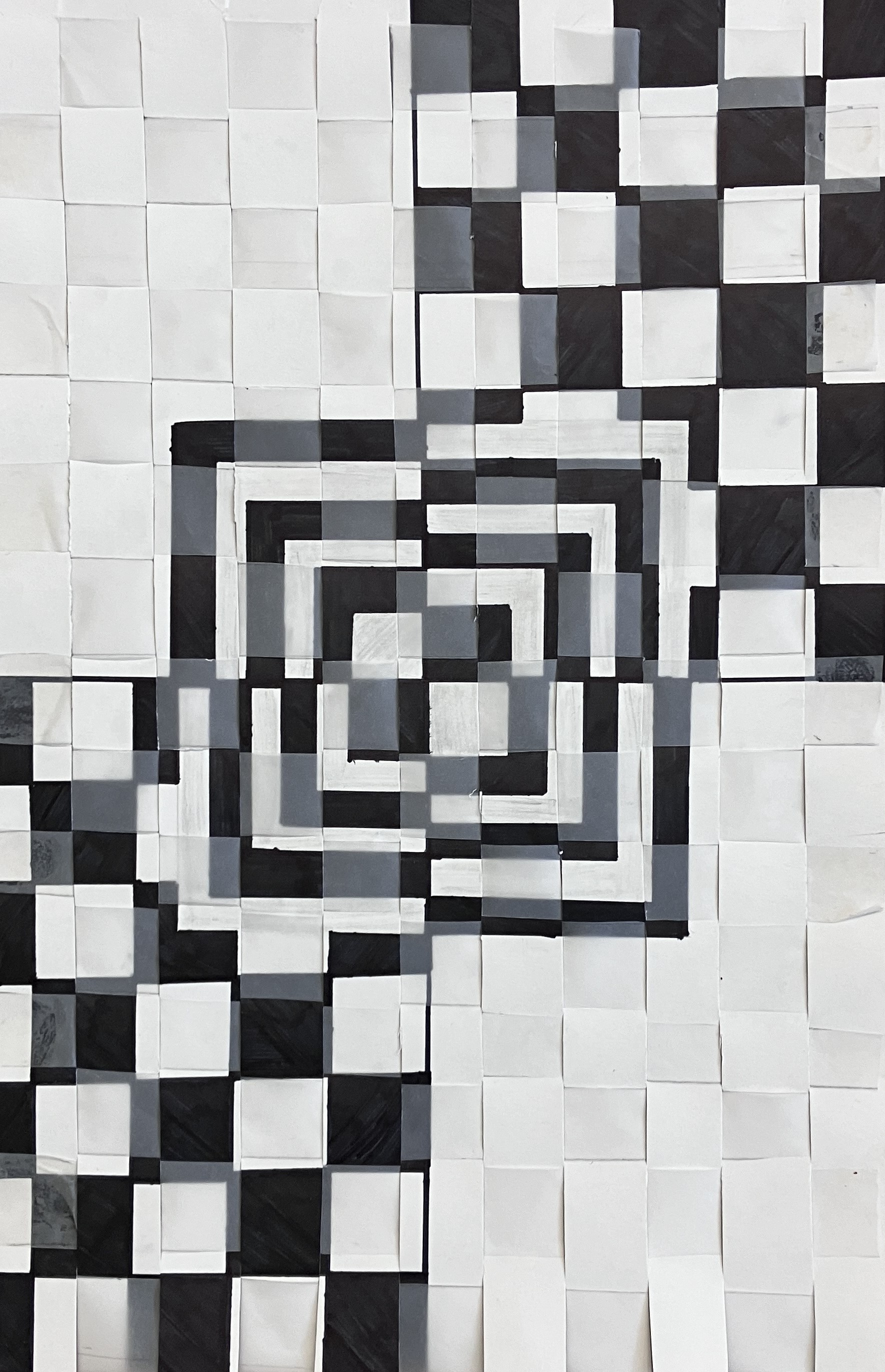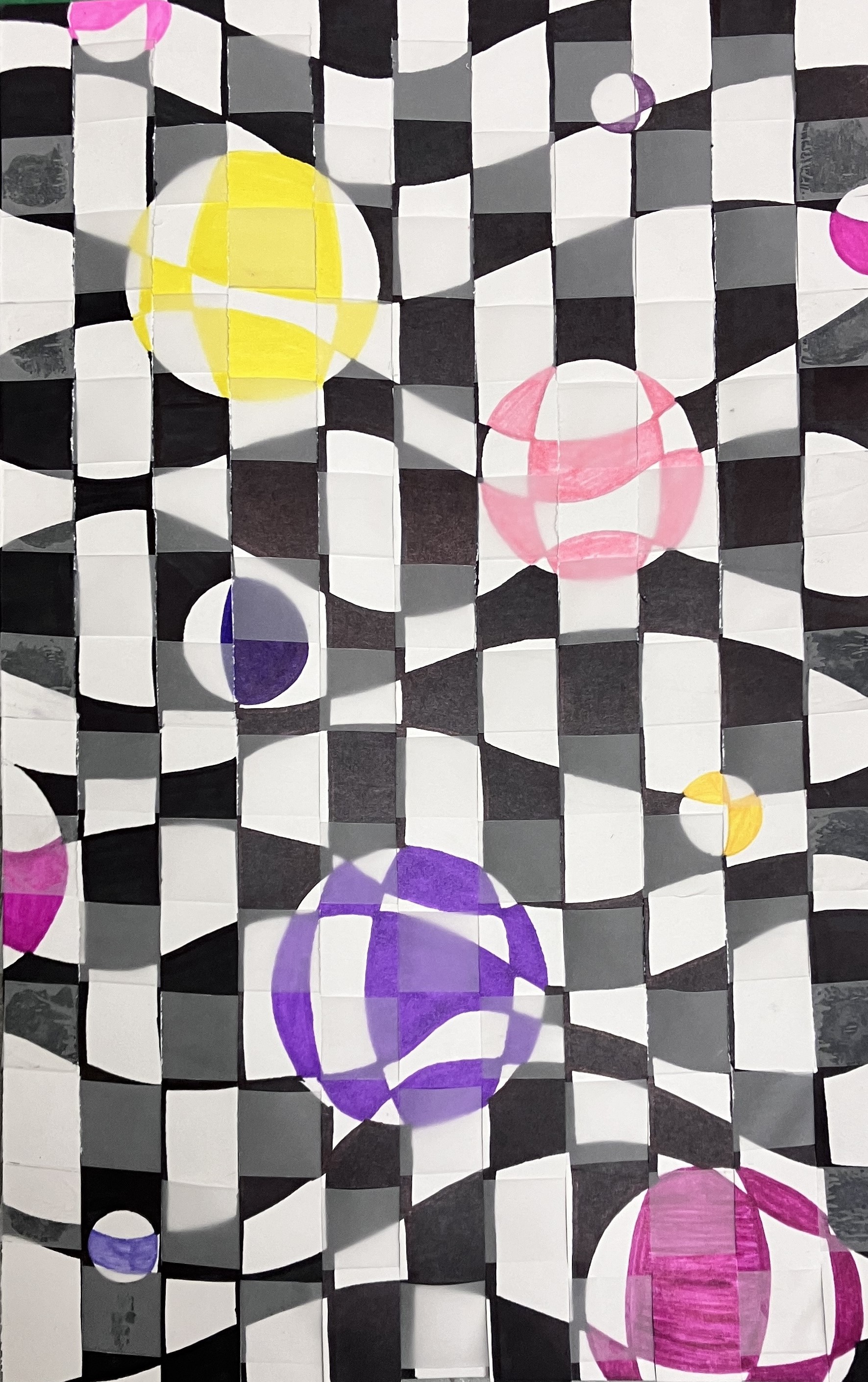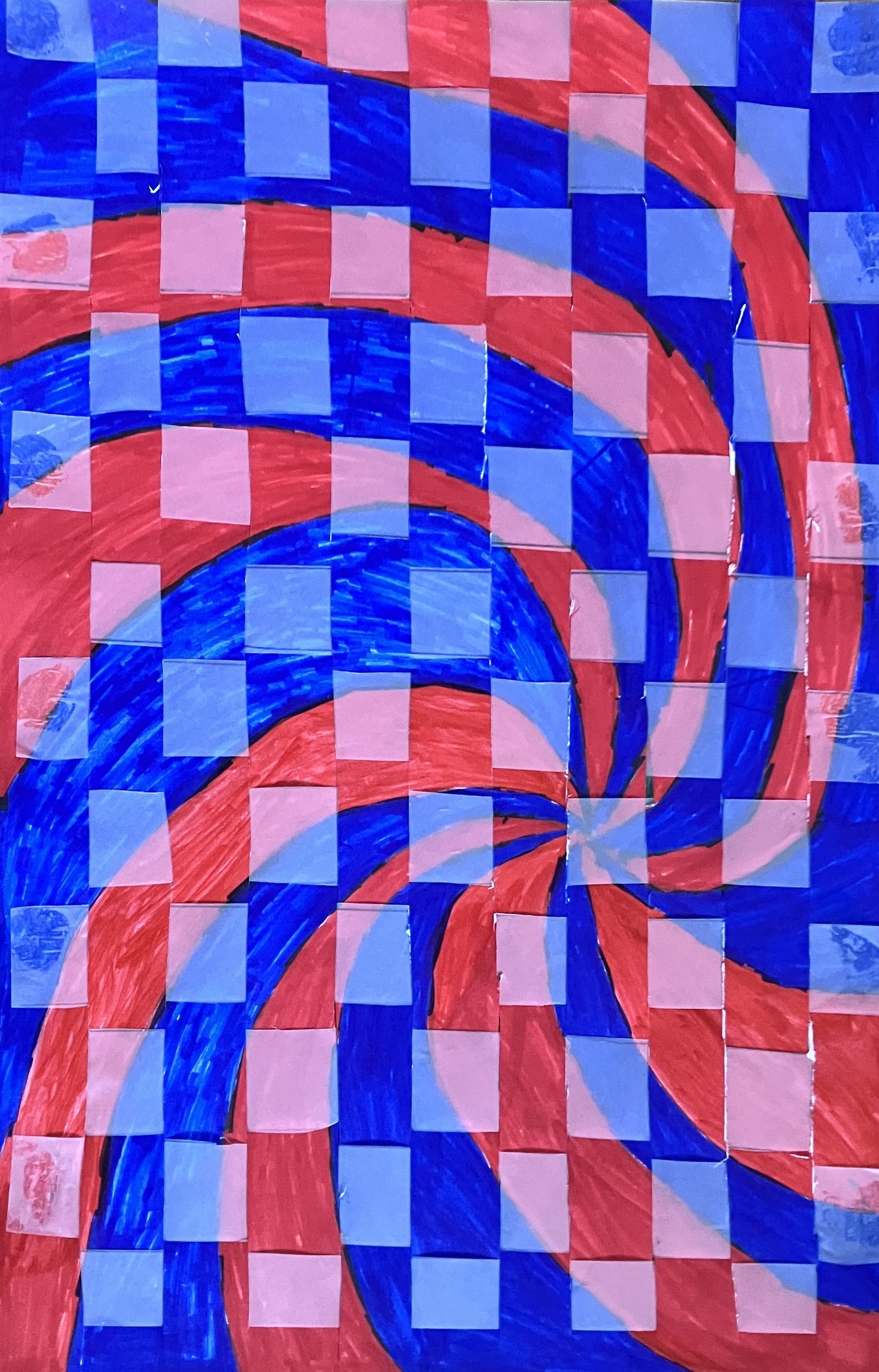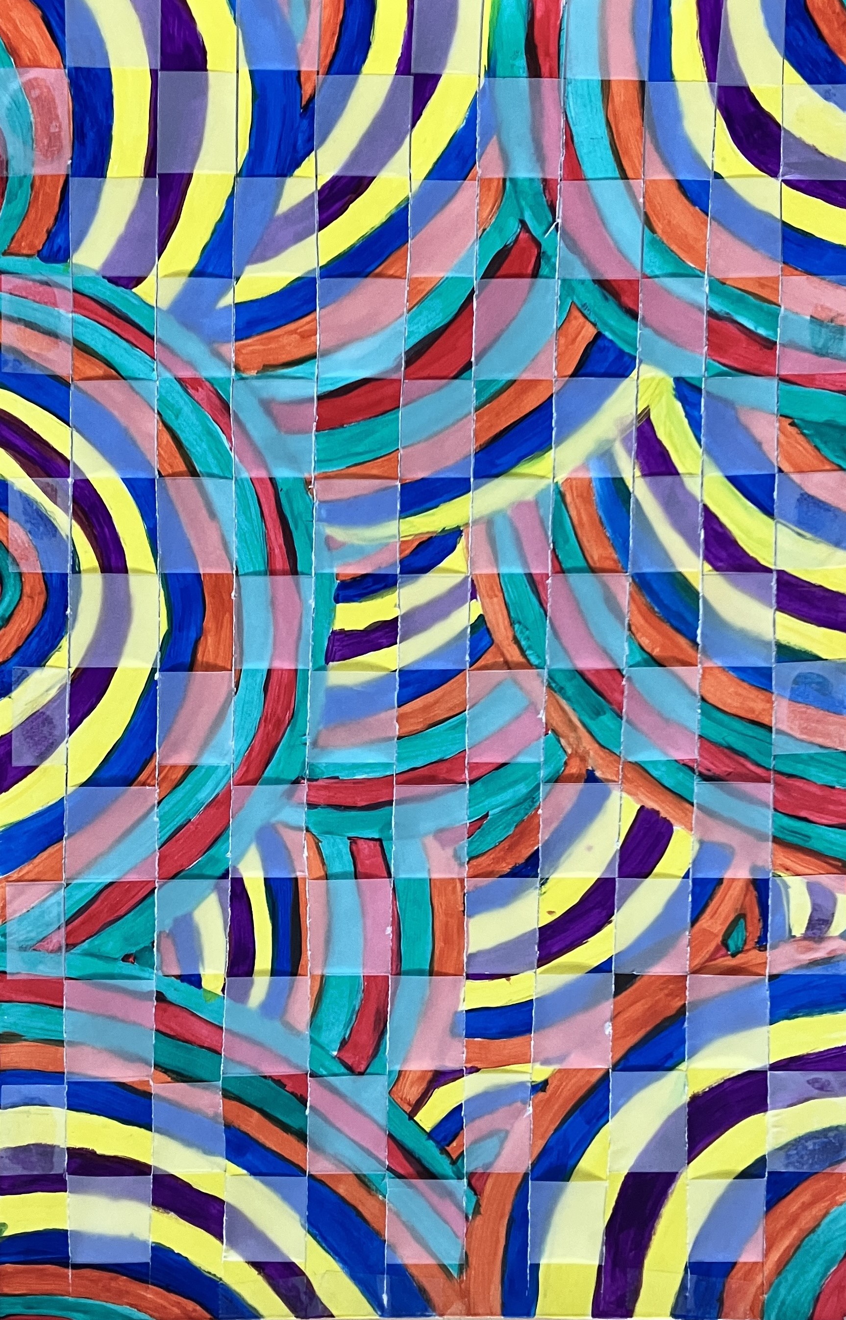 Then, students learned about weaving and how to create a paper weaving. Students planned a design for their weaving first, then sketched and cut their warp strips from their drawing. Playing with opacity, students wove vellum into their Op-Art drawings.