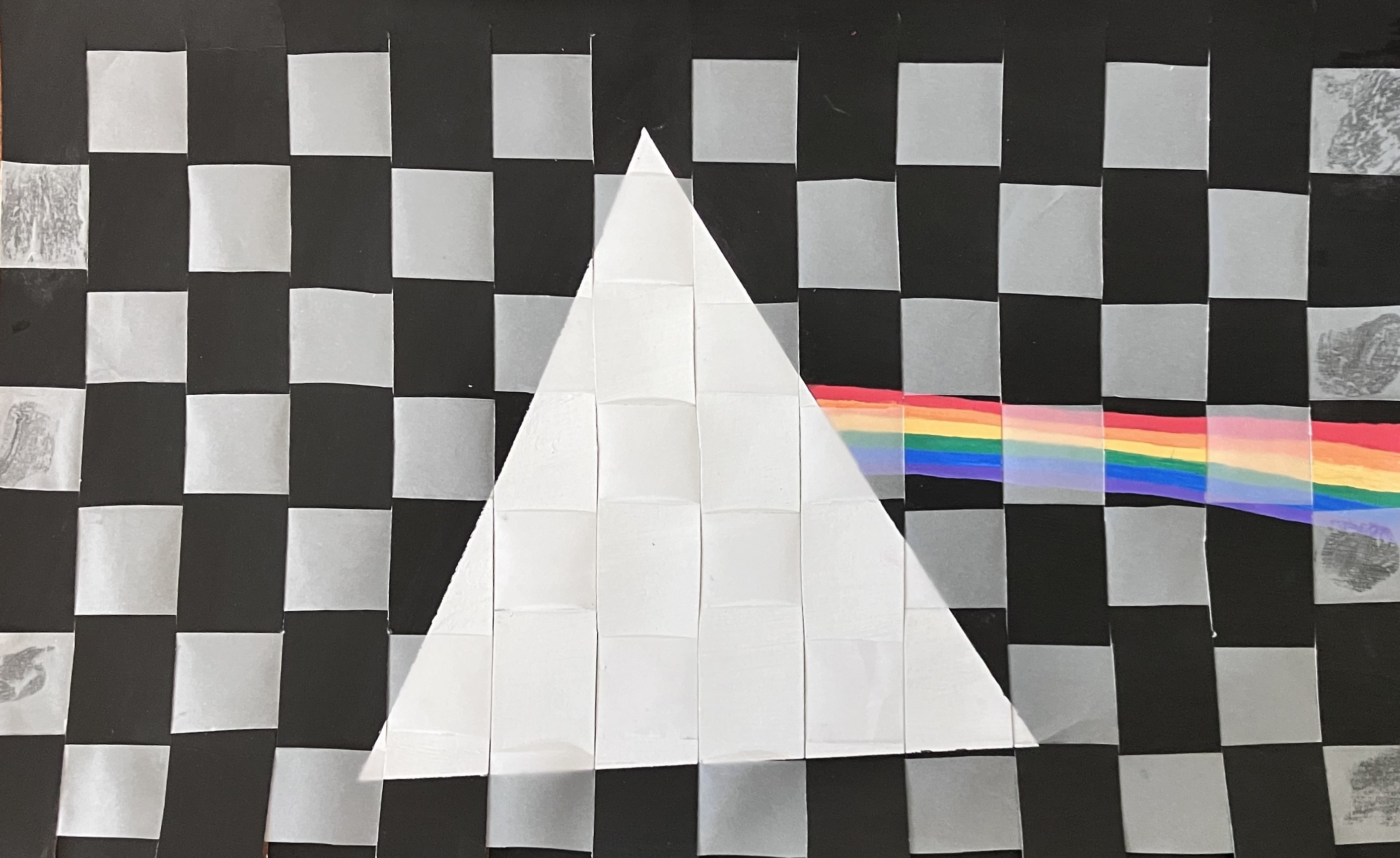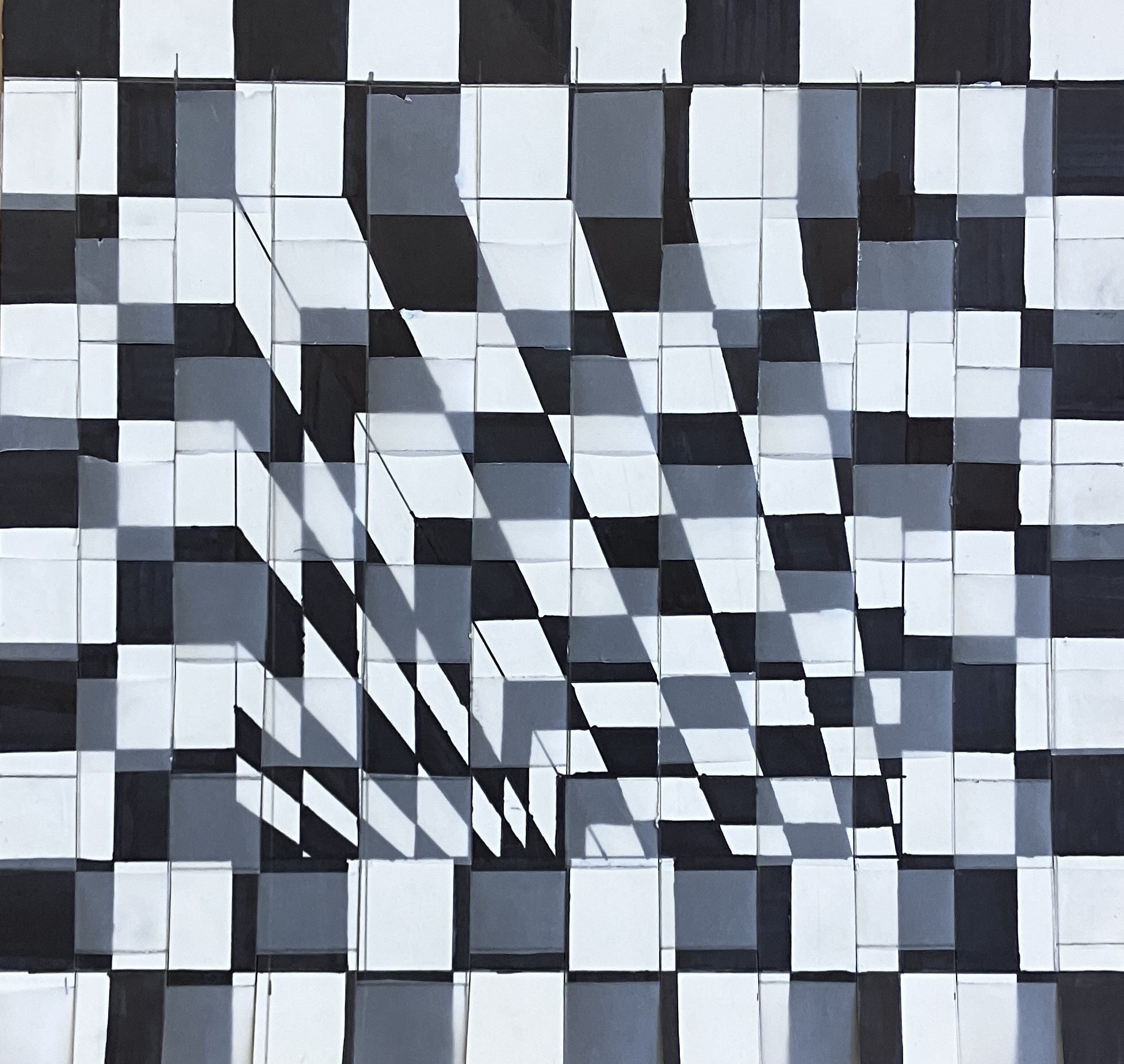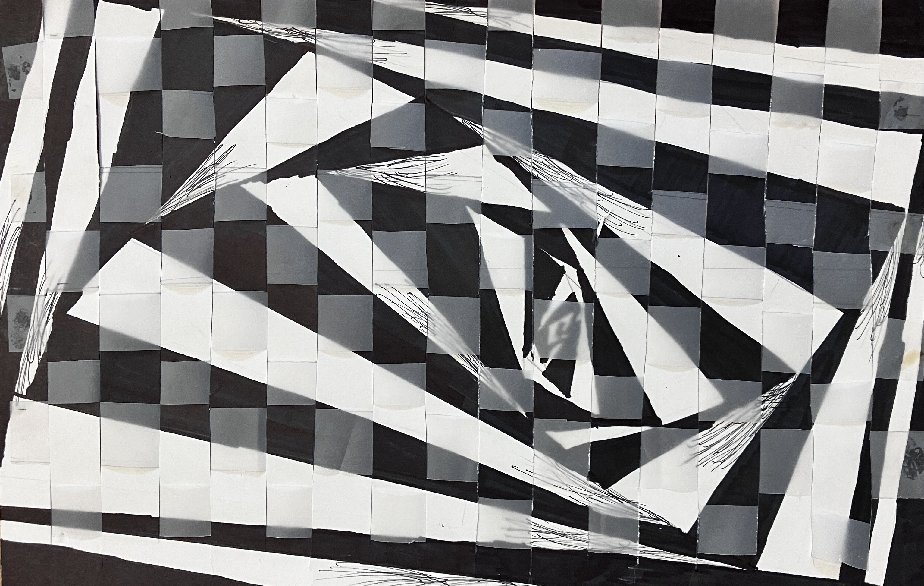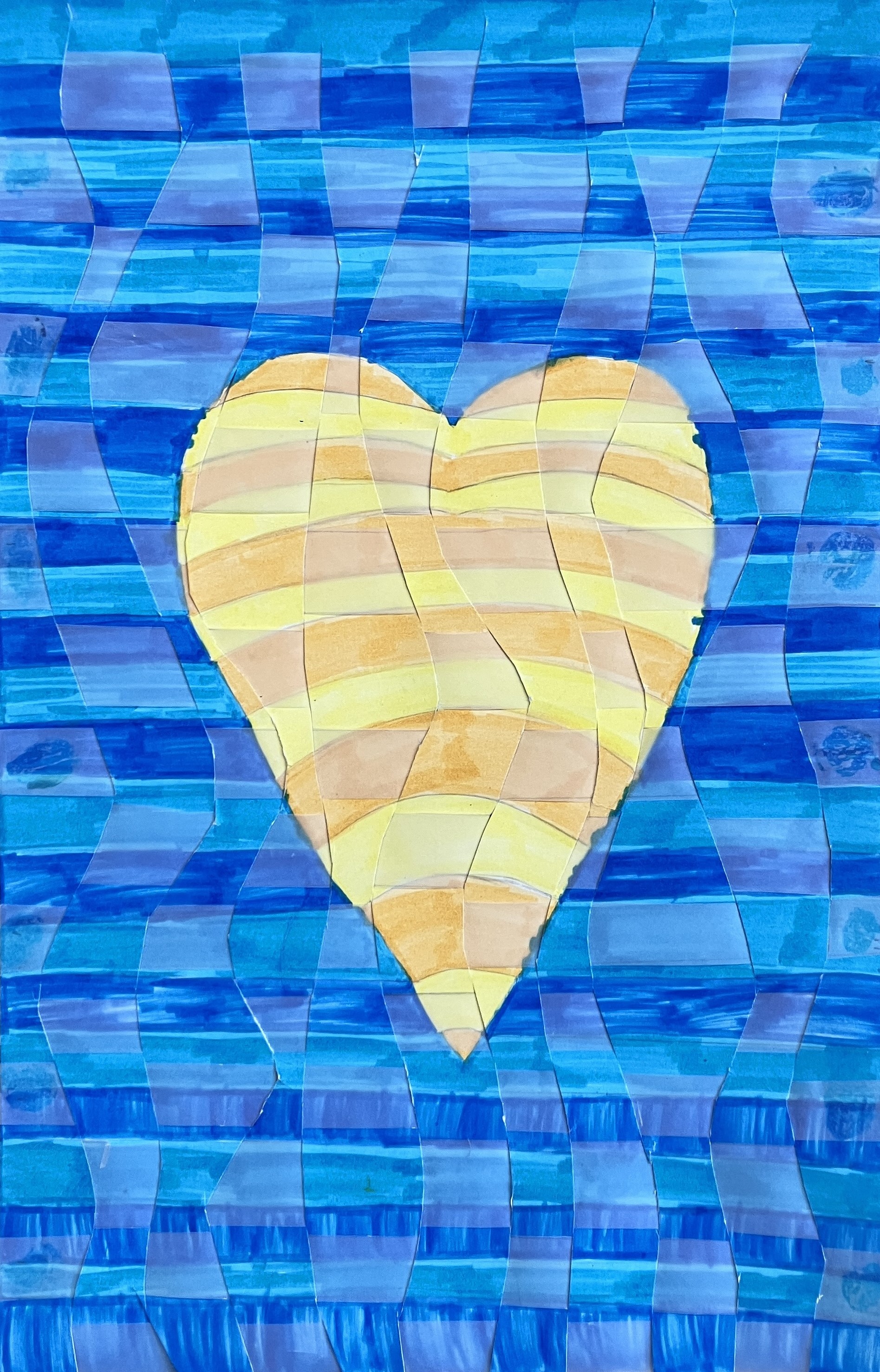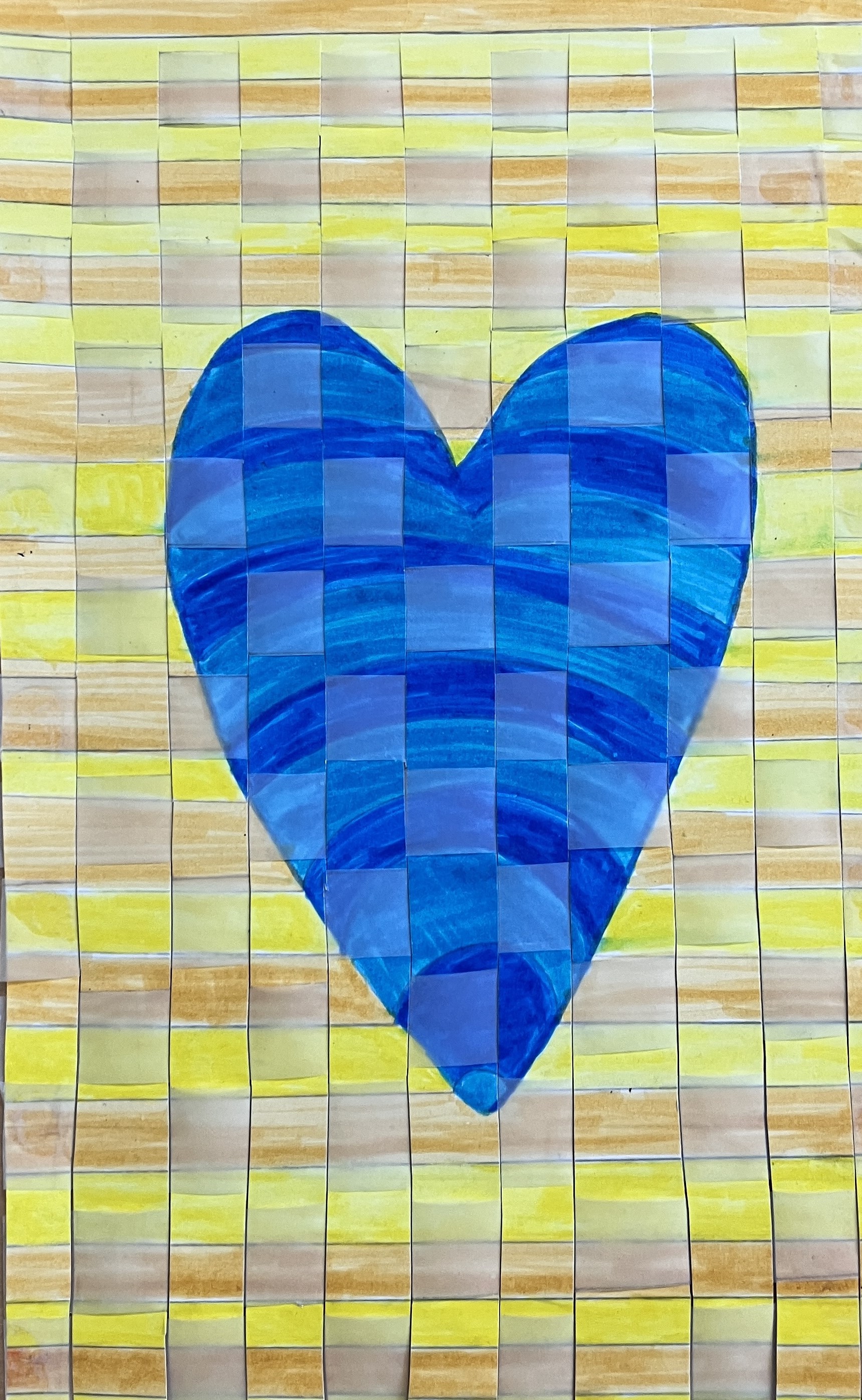Then, students learned about weaving and how to create a paper weaving. Students planned a design for their weaving first, then sketched and cut their warp strips from their drawing. Playing with opacity, students wove vellum into their Op-Art drawings.