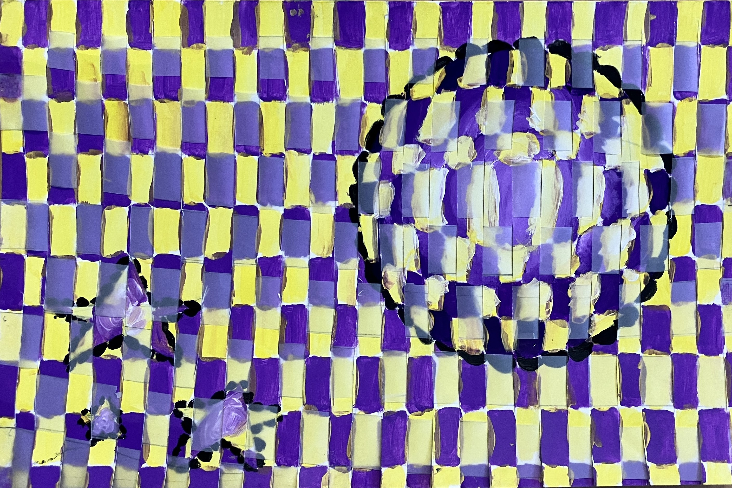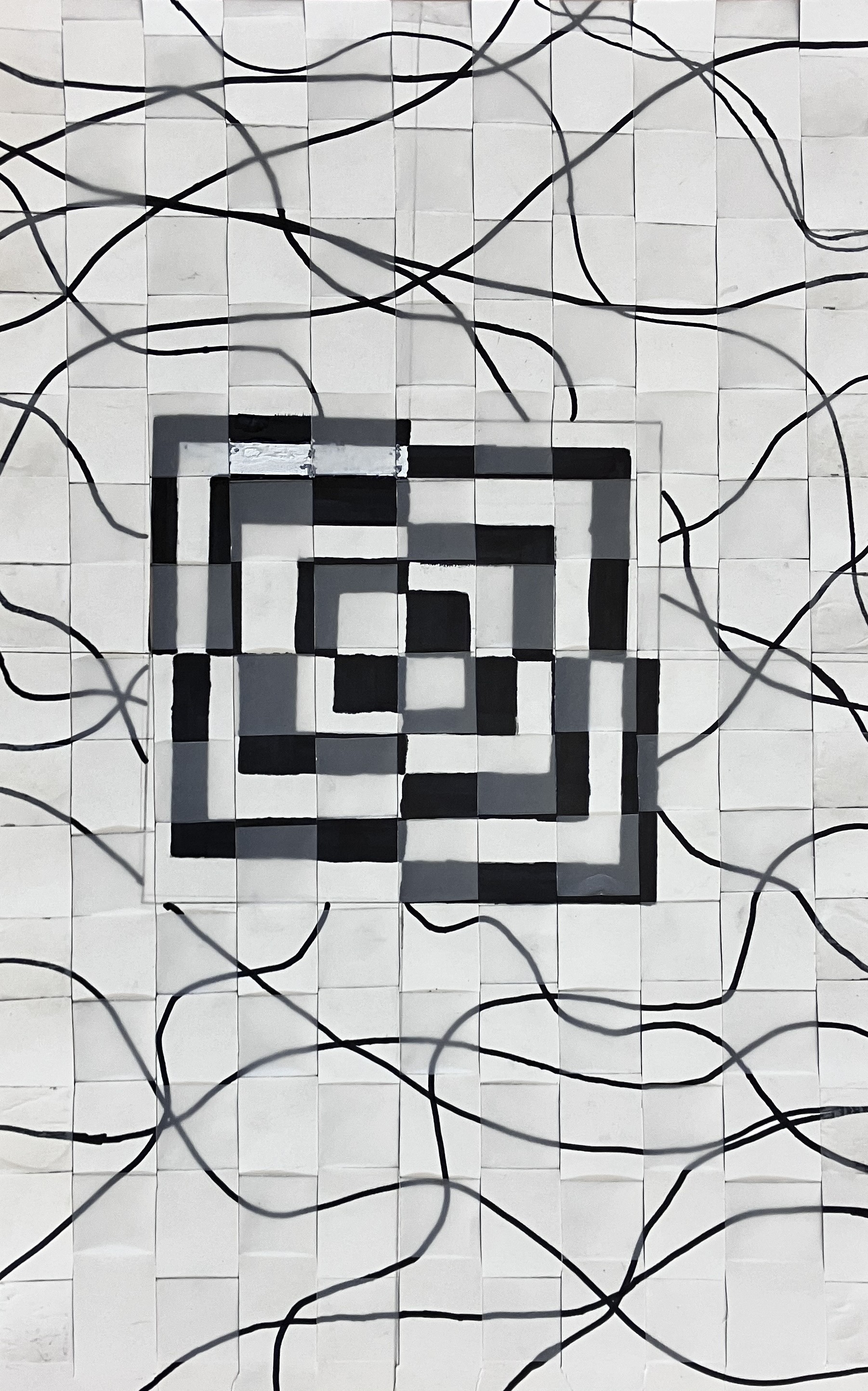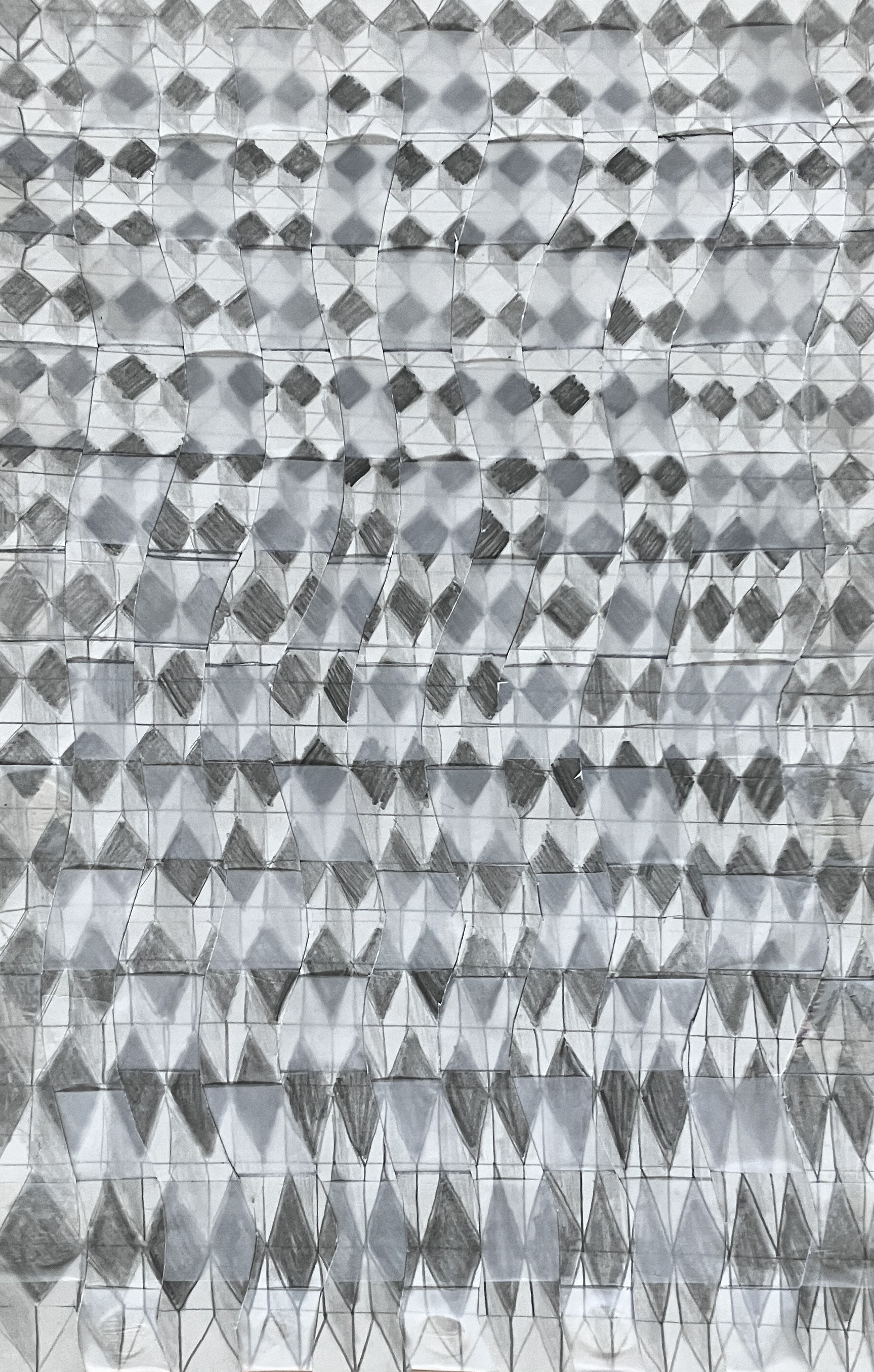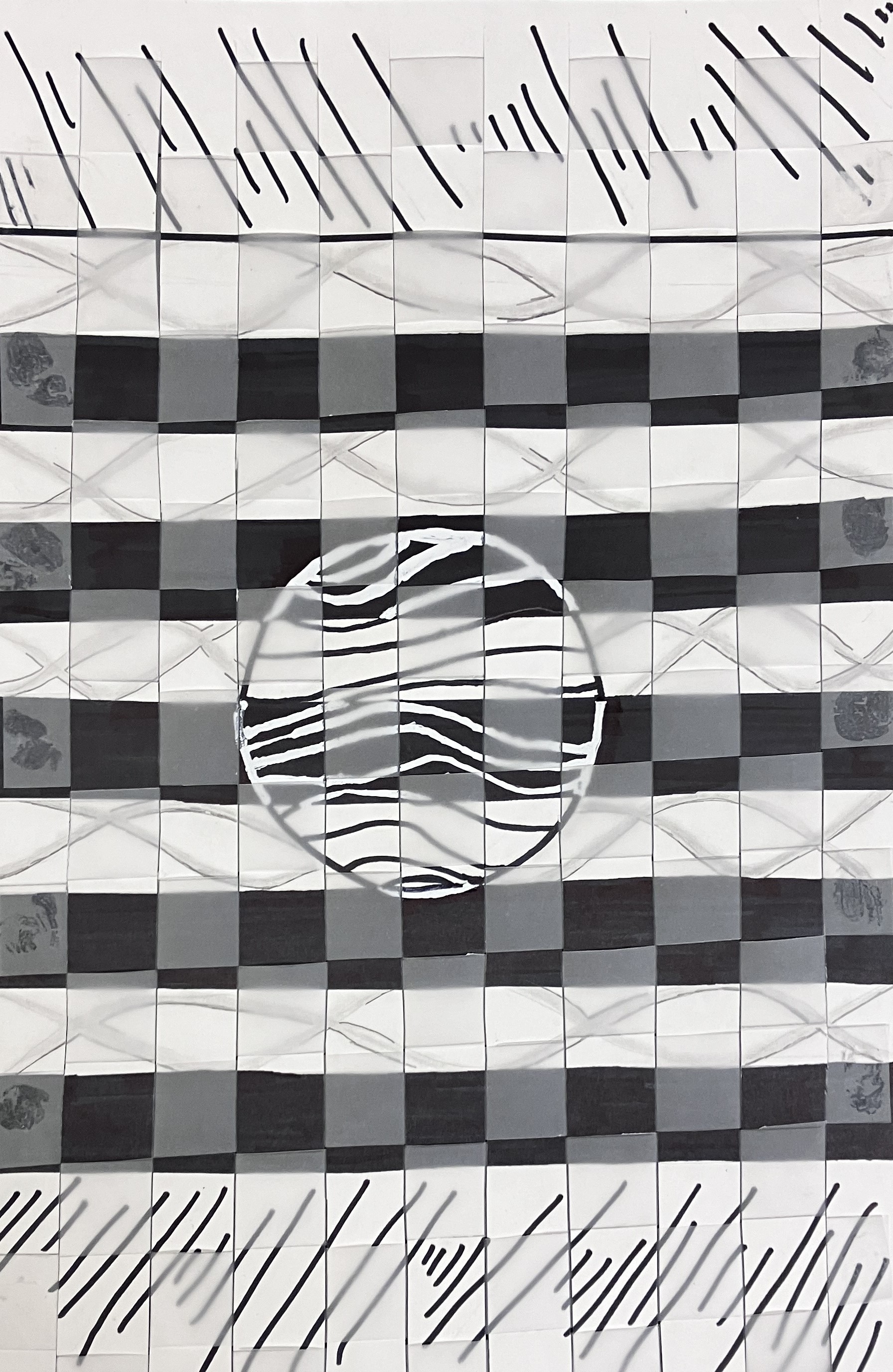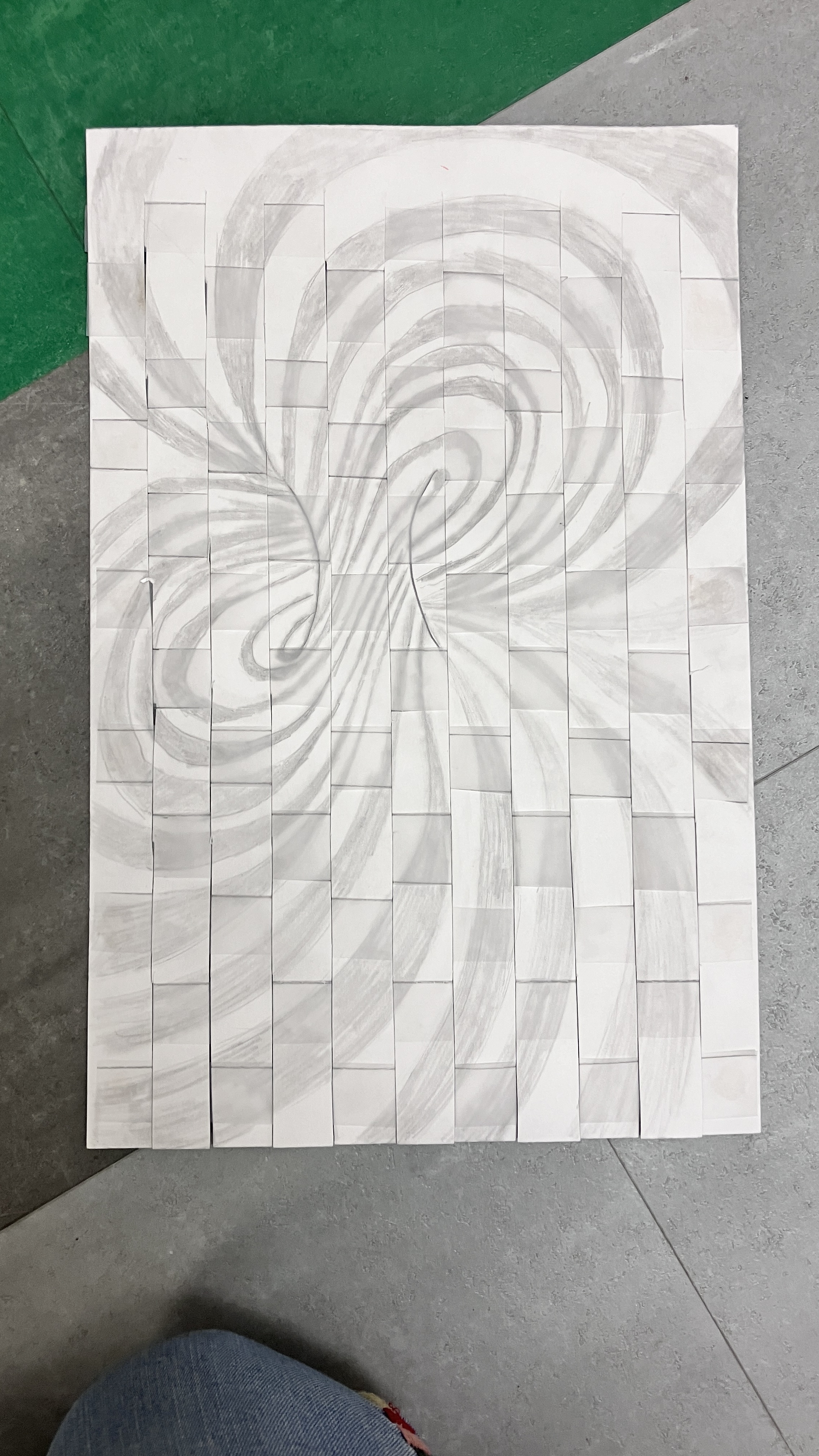 Then, students learned about weaving and how to create a paper weaving. Students planned a design for their weaving first, then sketched and cut their warp strips from their drawing. Playing with opacity, students wove vellum into their Op-Art drawings.