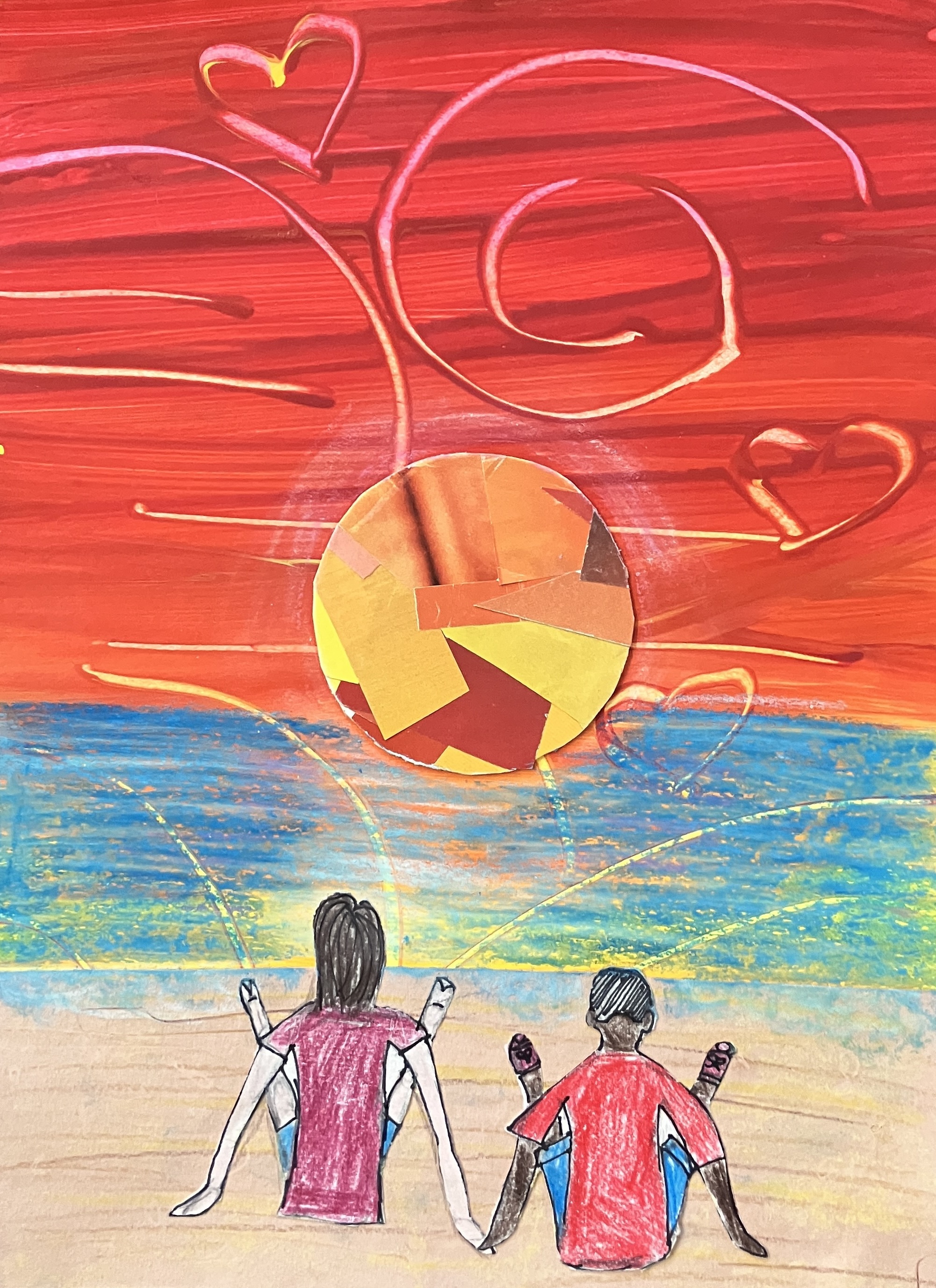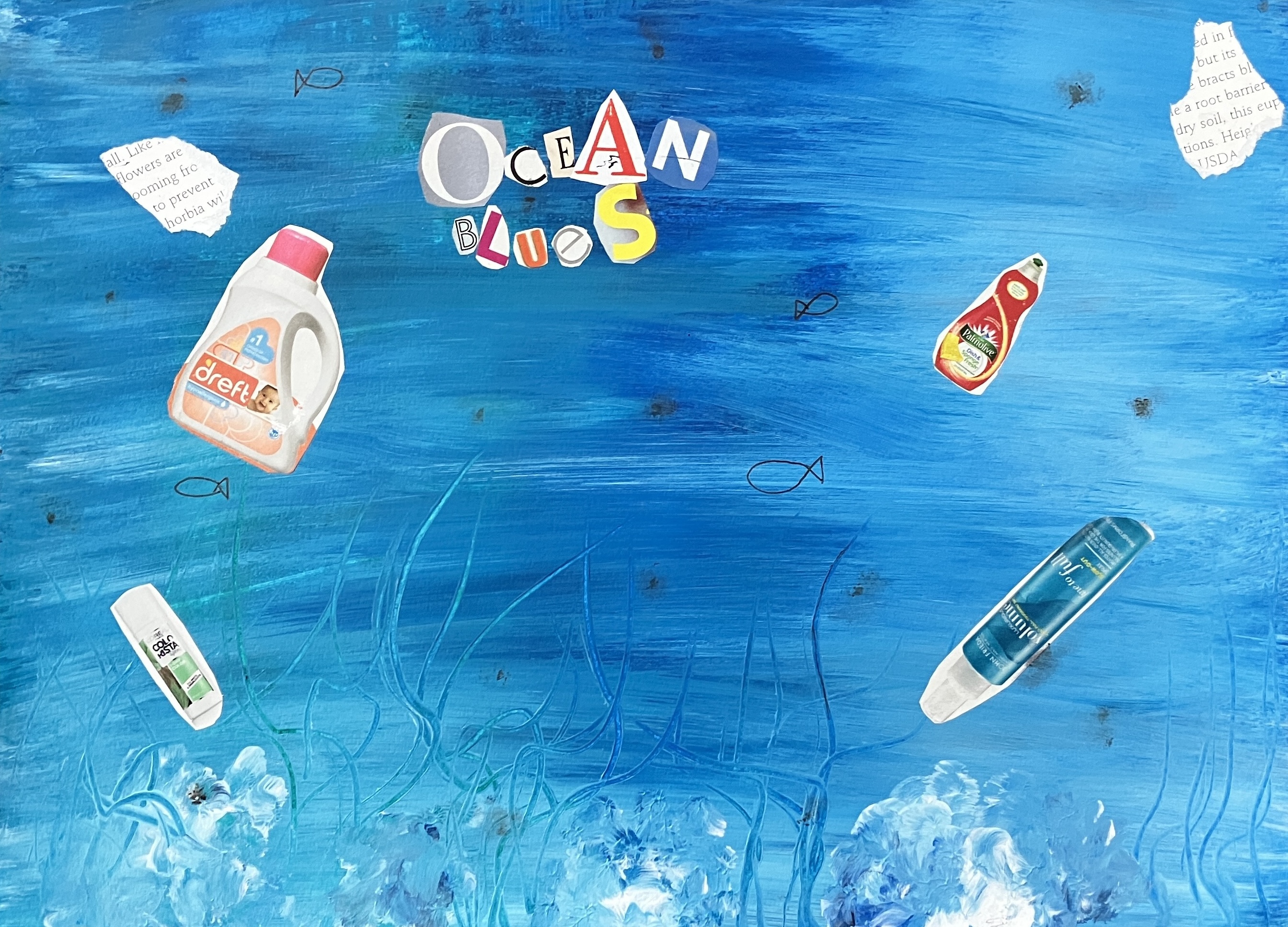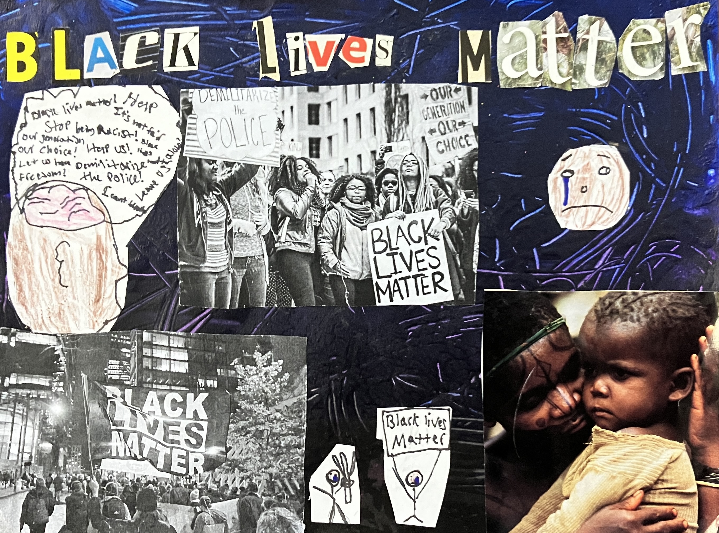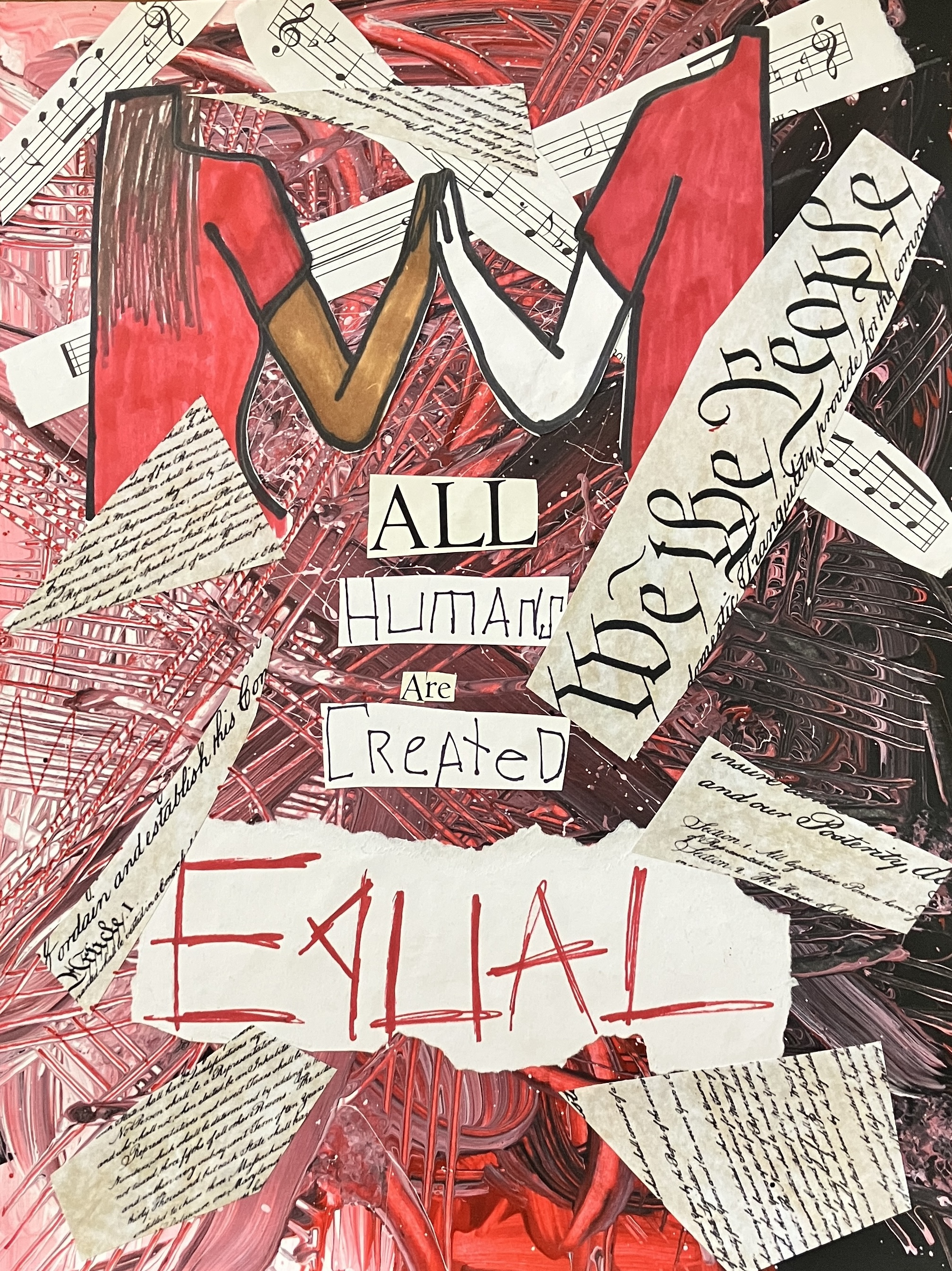 Students created “textured paintings” to use as a base for their project. Then, students mixed collage, drawing, and writing to create a visually interesting and compelling piece.