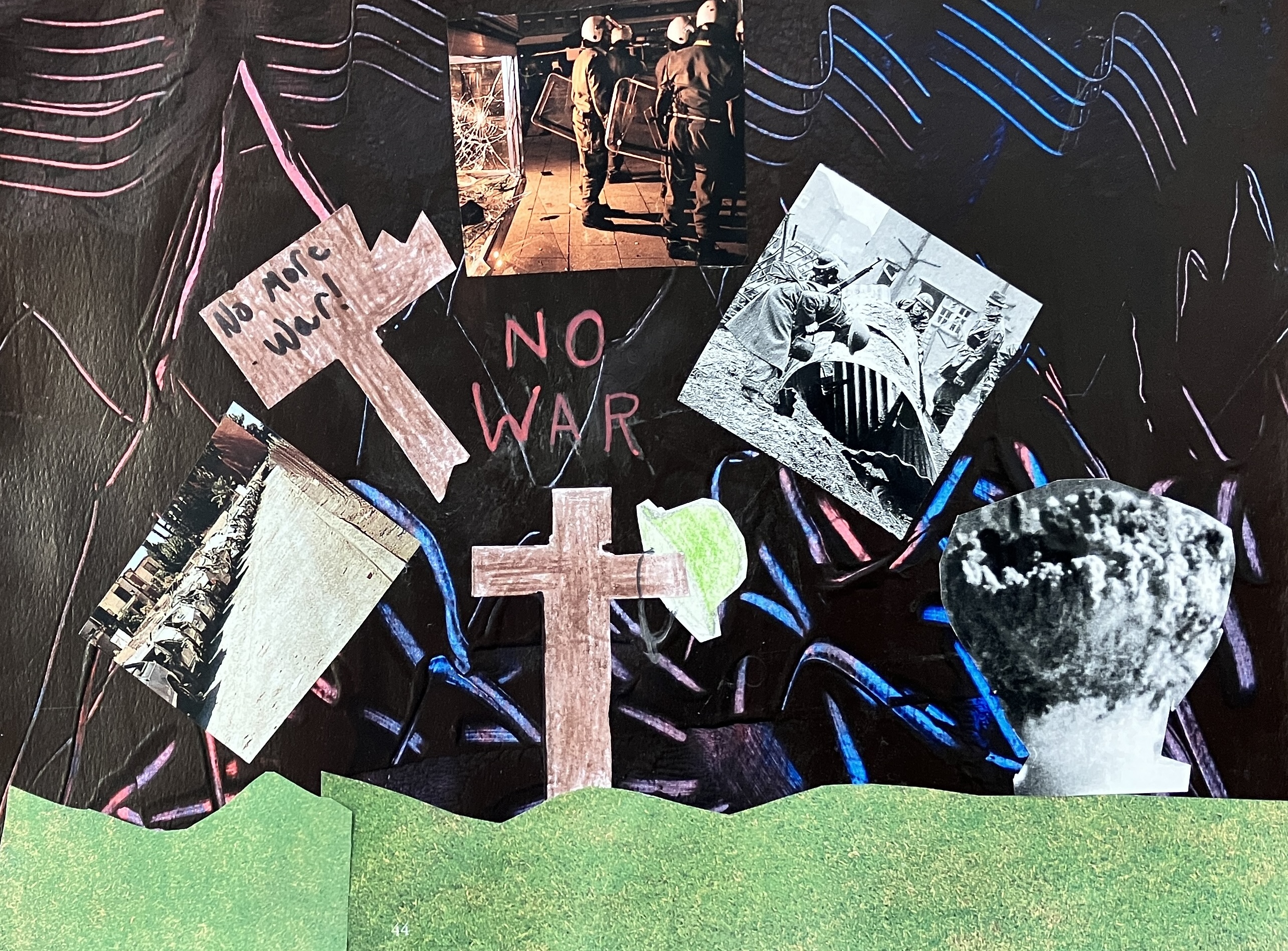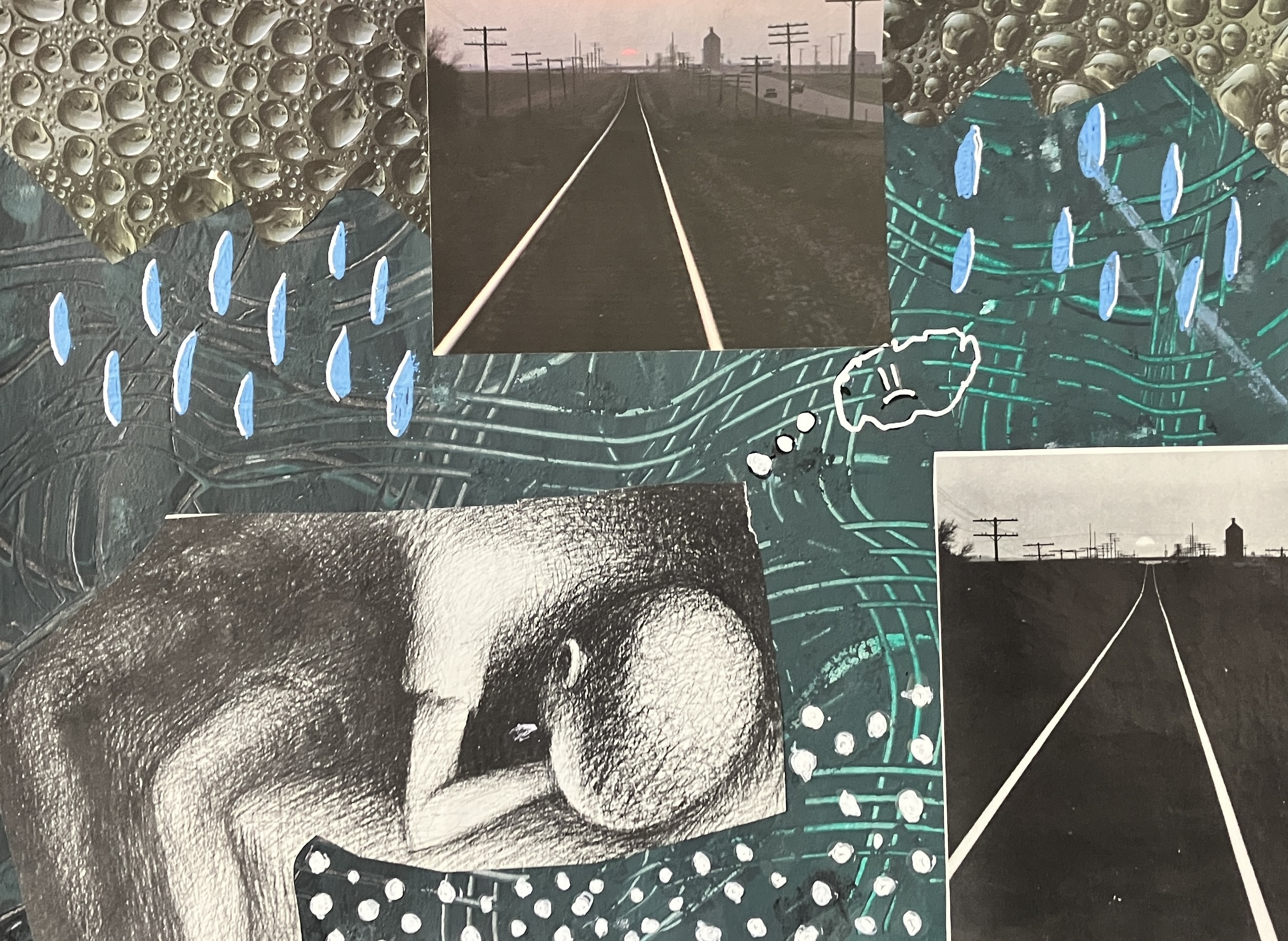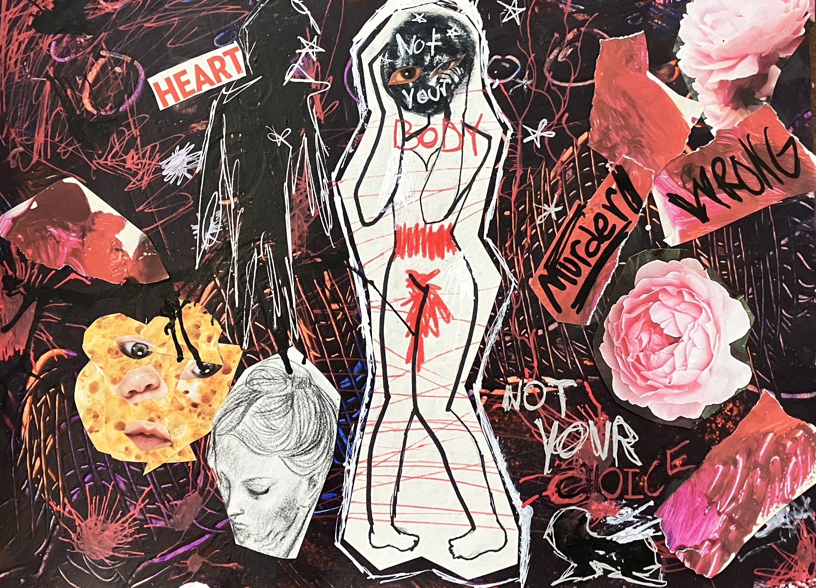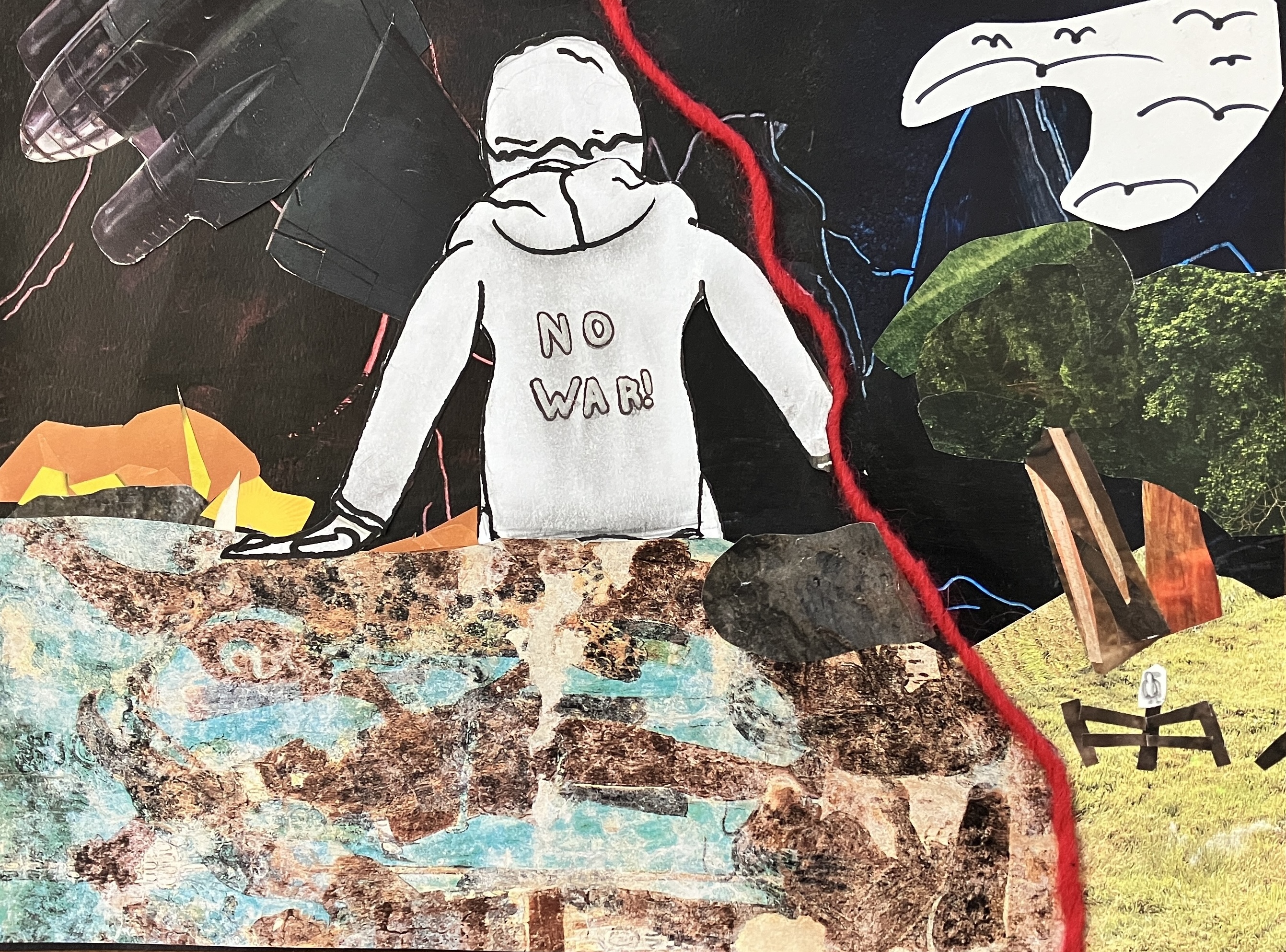 Students created “textured paintings” to use as a base for their project. Then, students mixed collage, drawing, and writing to create a visually interesting and compelling piece.