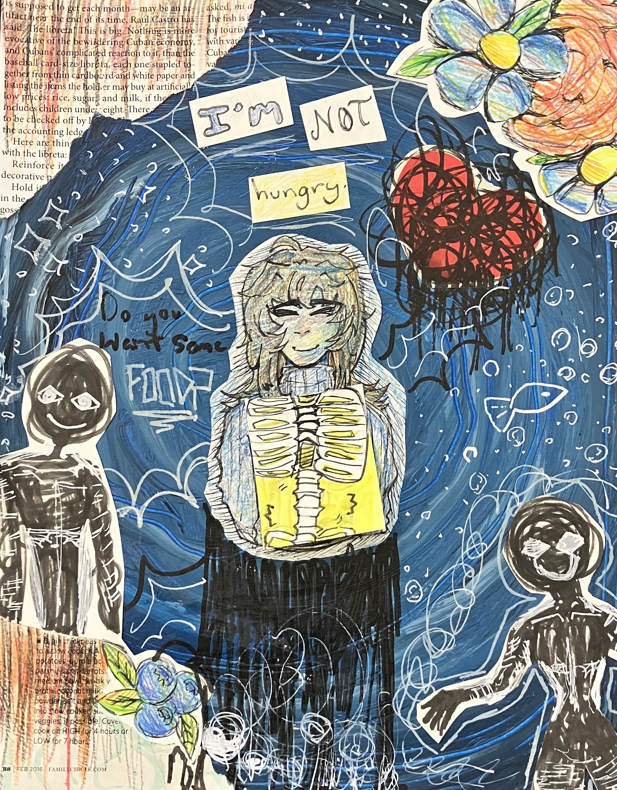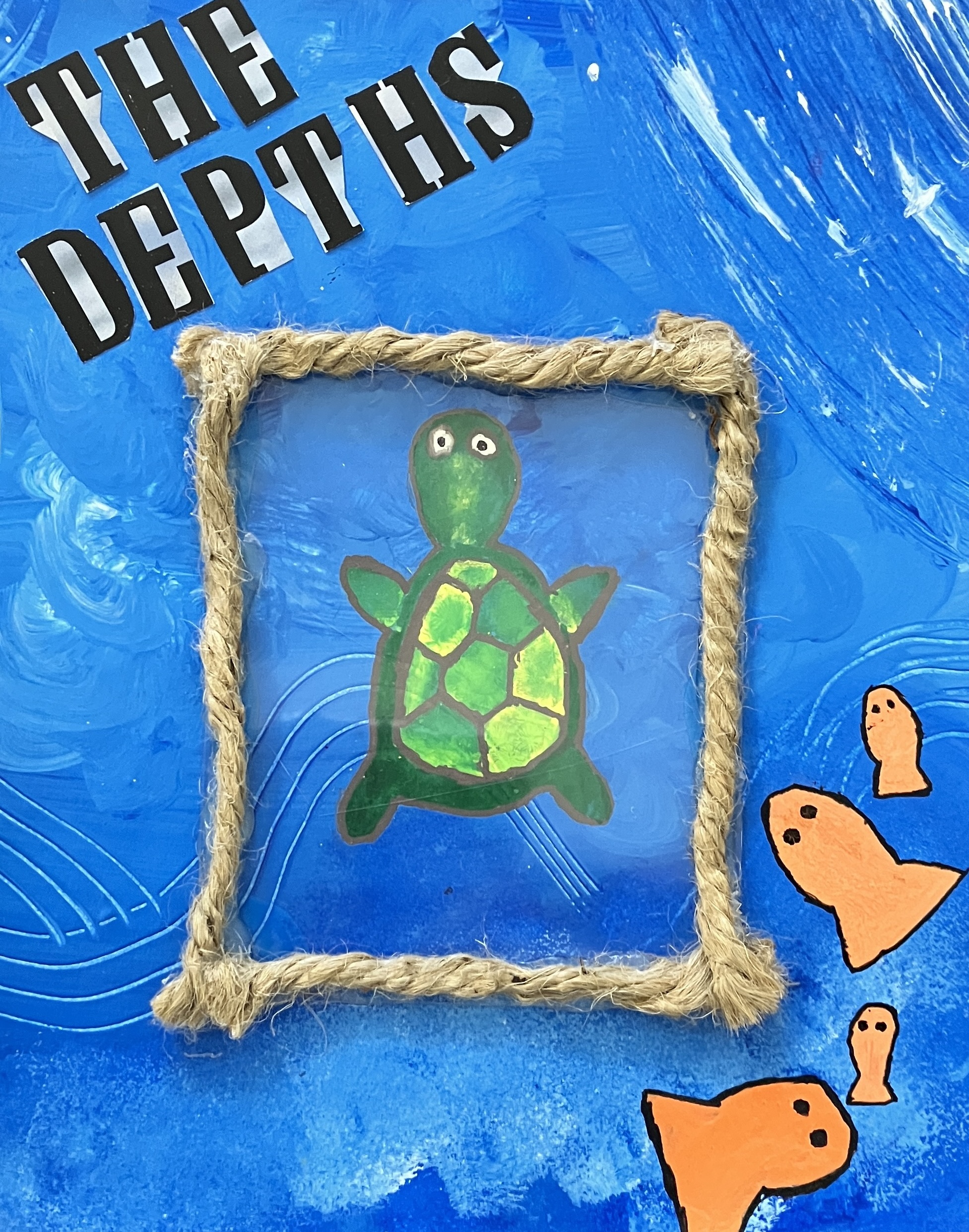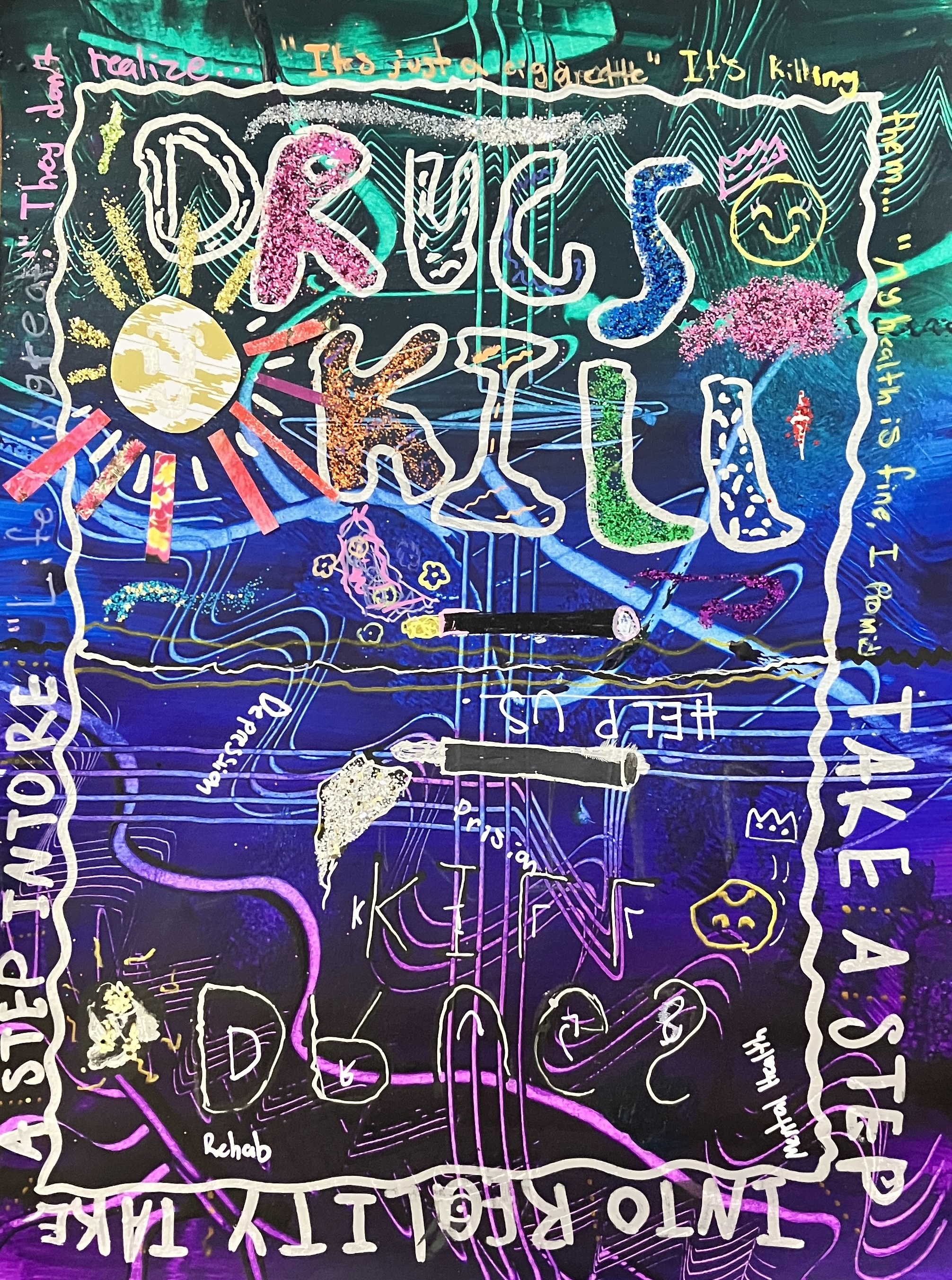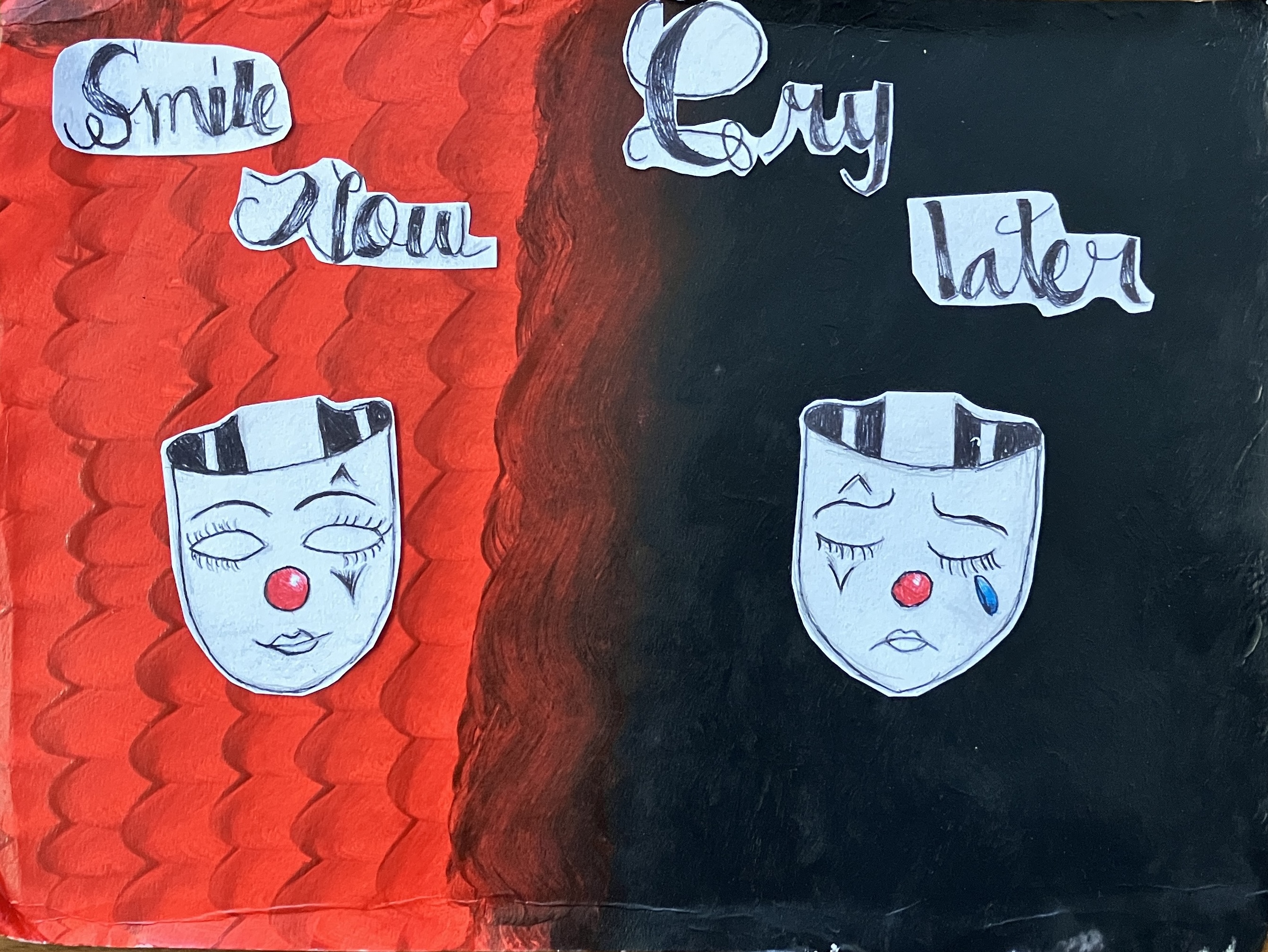 Students created “textured paintings” to use as a base for their project. Then, students mixed collage, drawing, and writing to create a visually interesting and compelling piece.