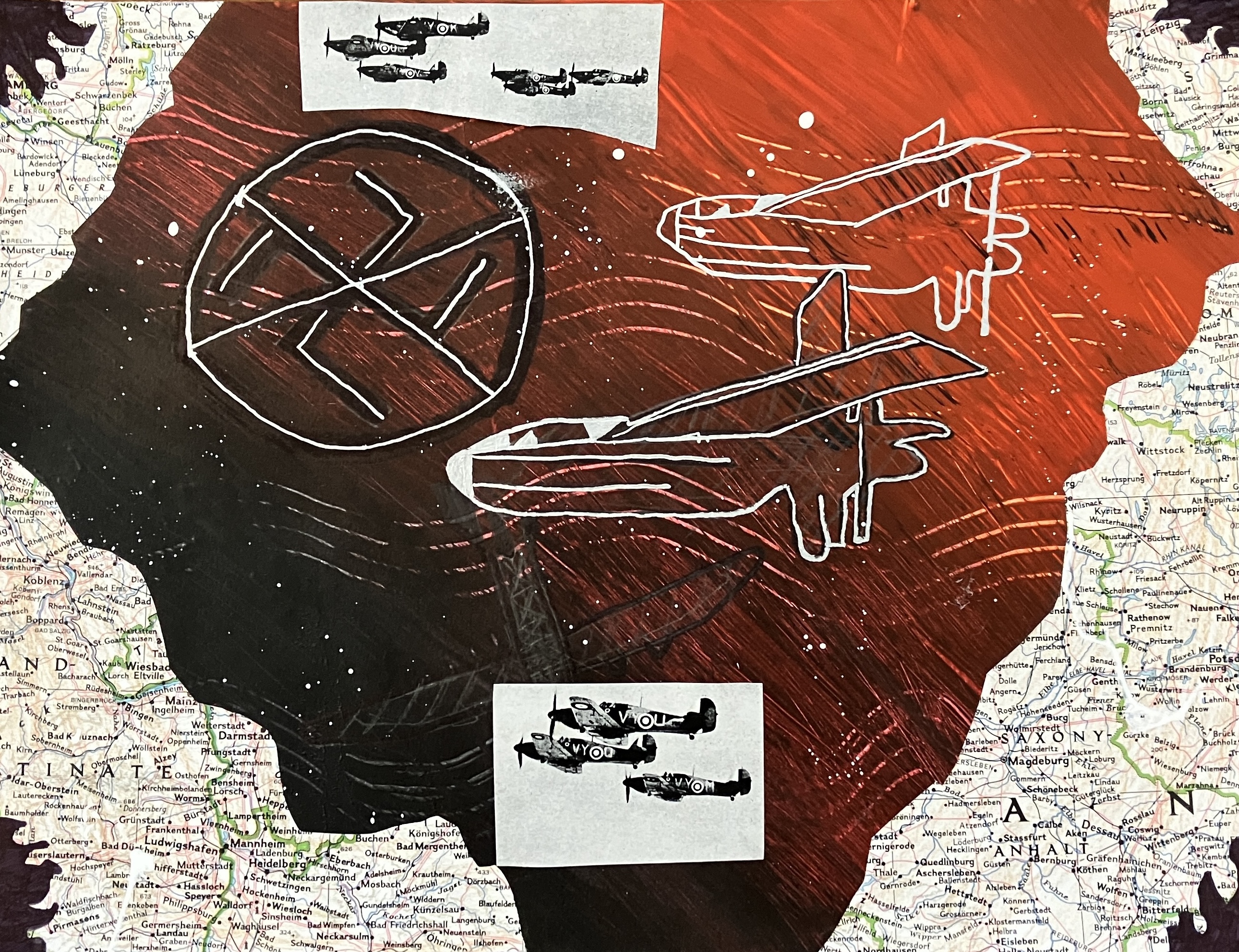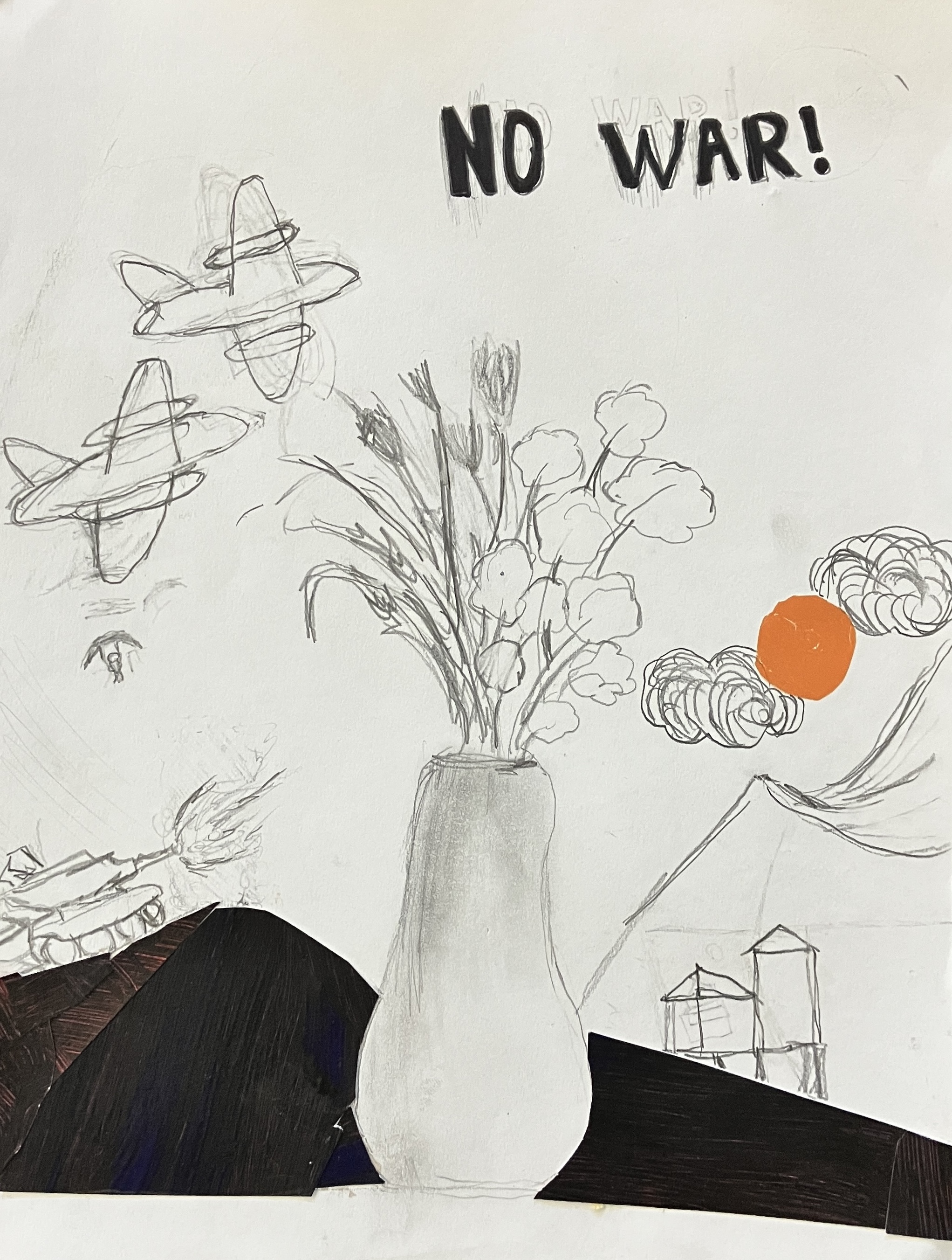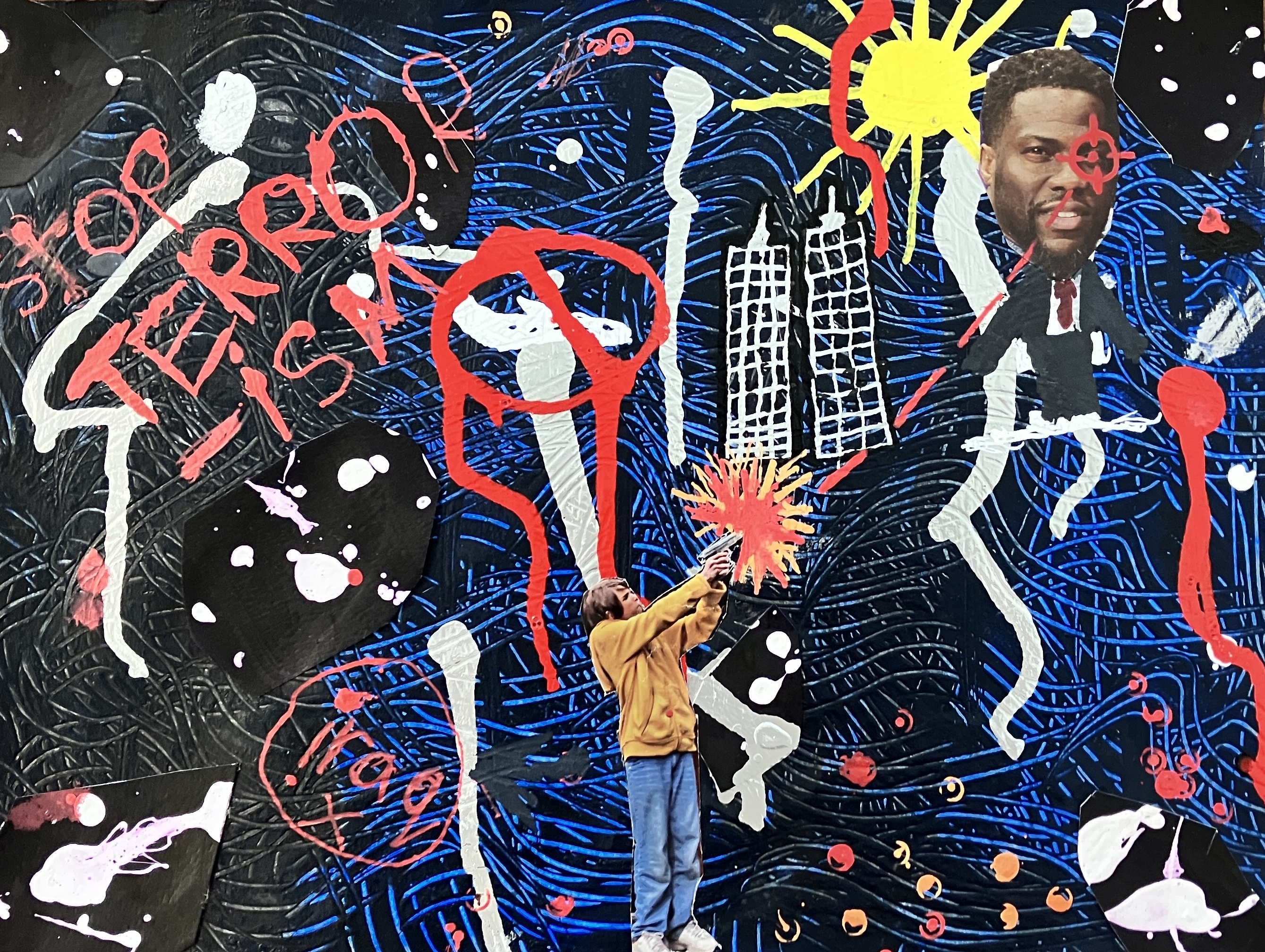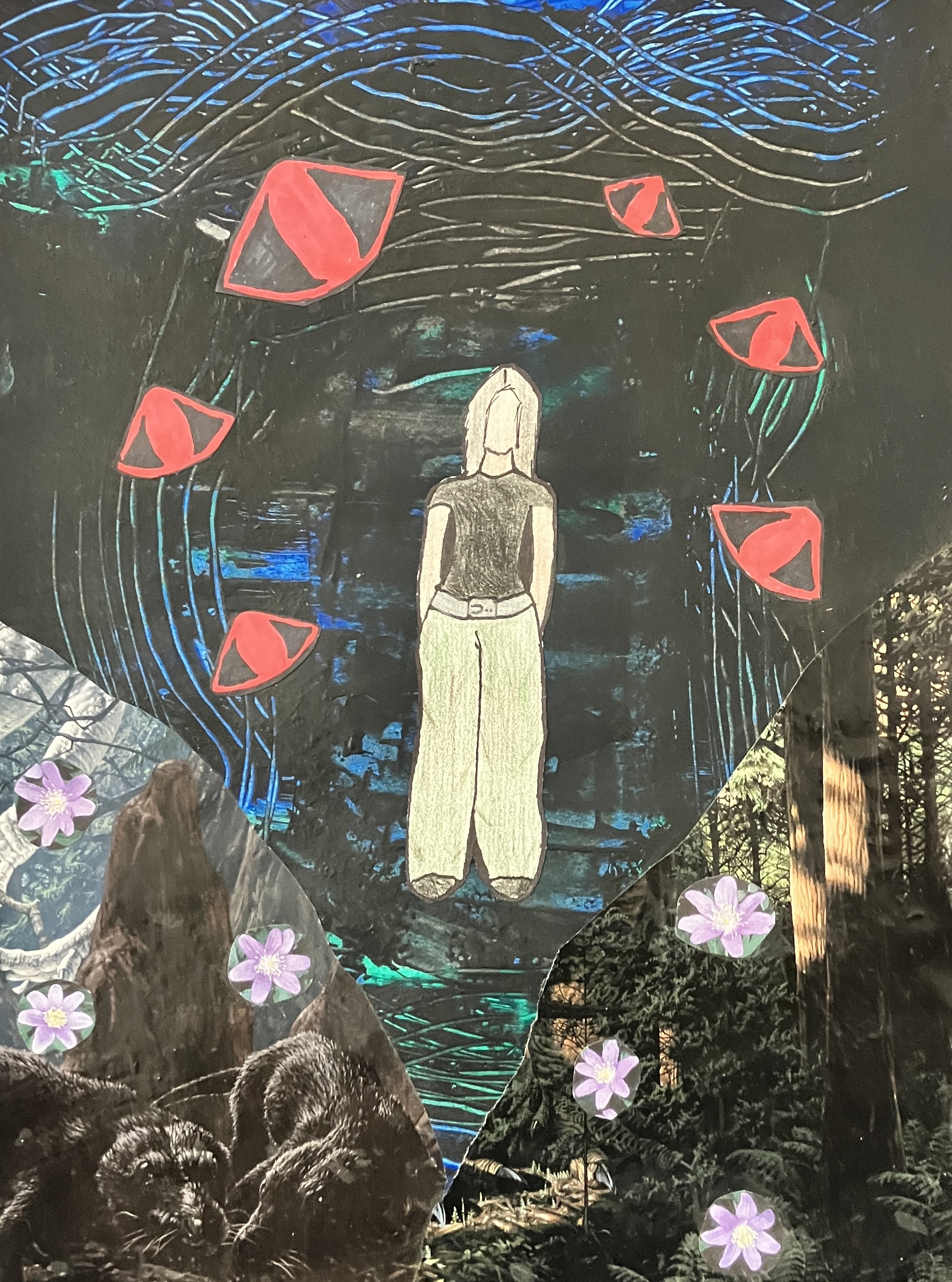 Students created “textured paintings” to use as a base for their project. Then, students mixed collage, drawing, and writing to create a visually interesting and compelling piece.