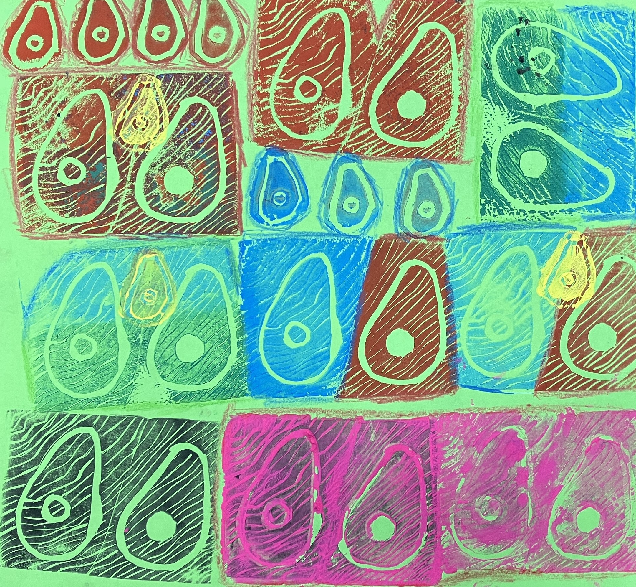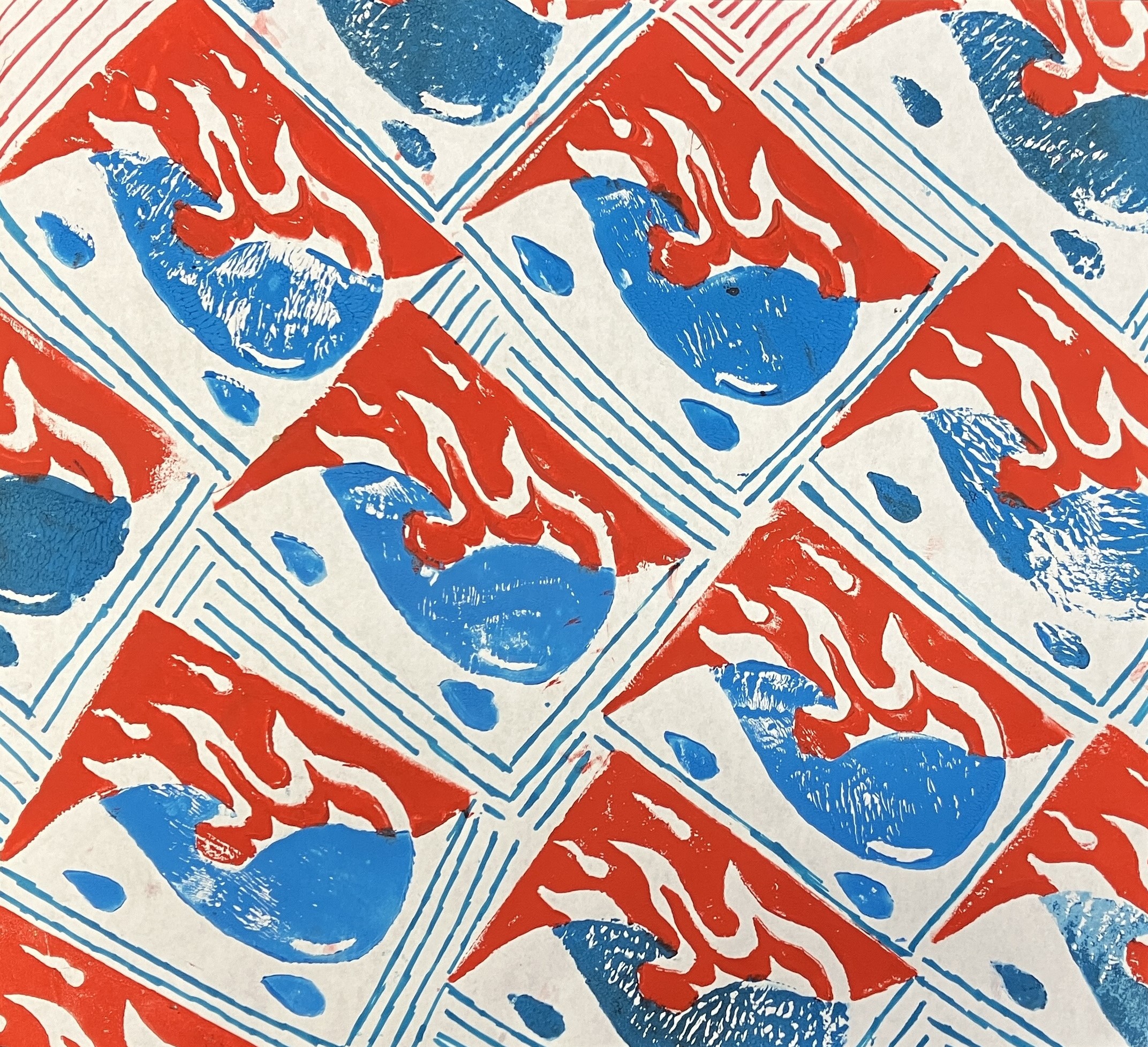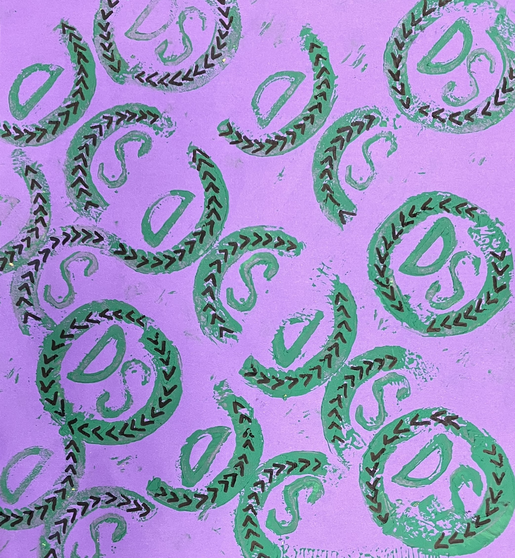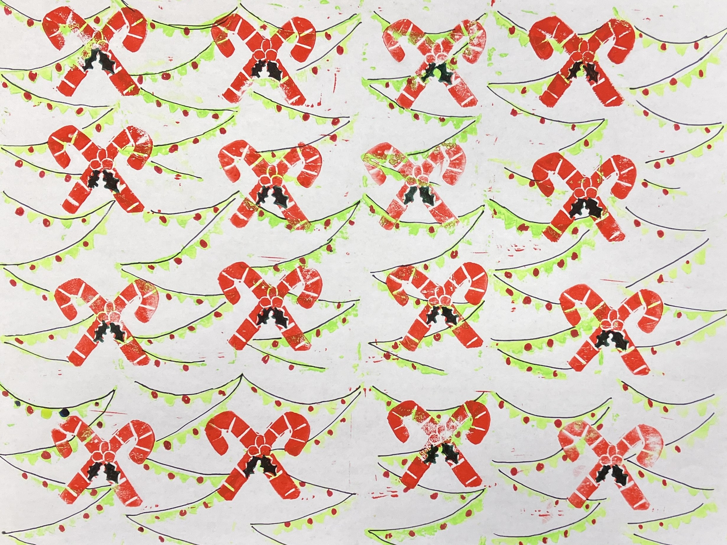 Students focused on pattern and repetition in this project by creating two linocut stamps.