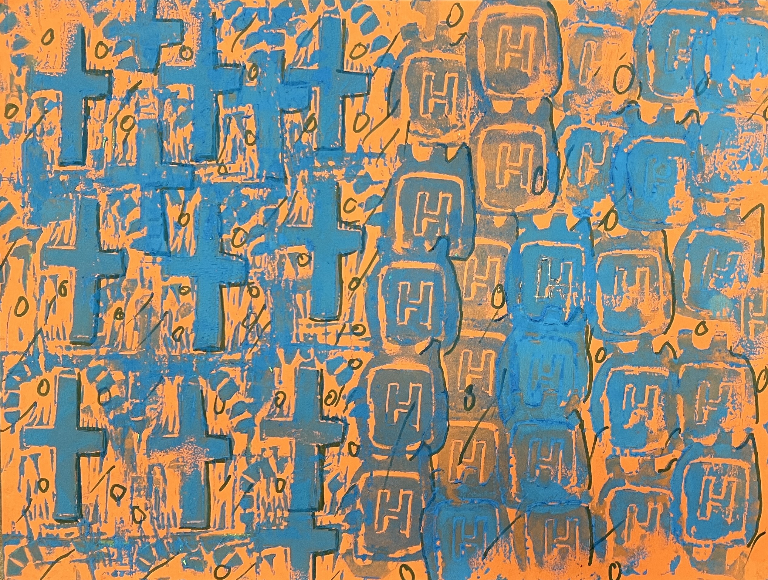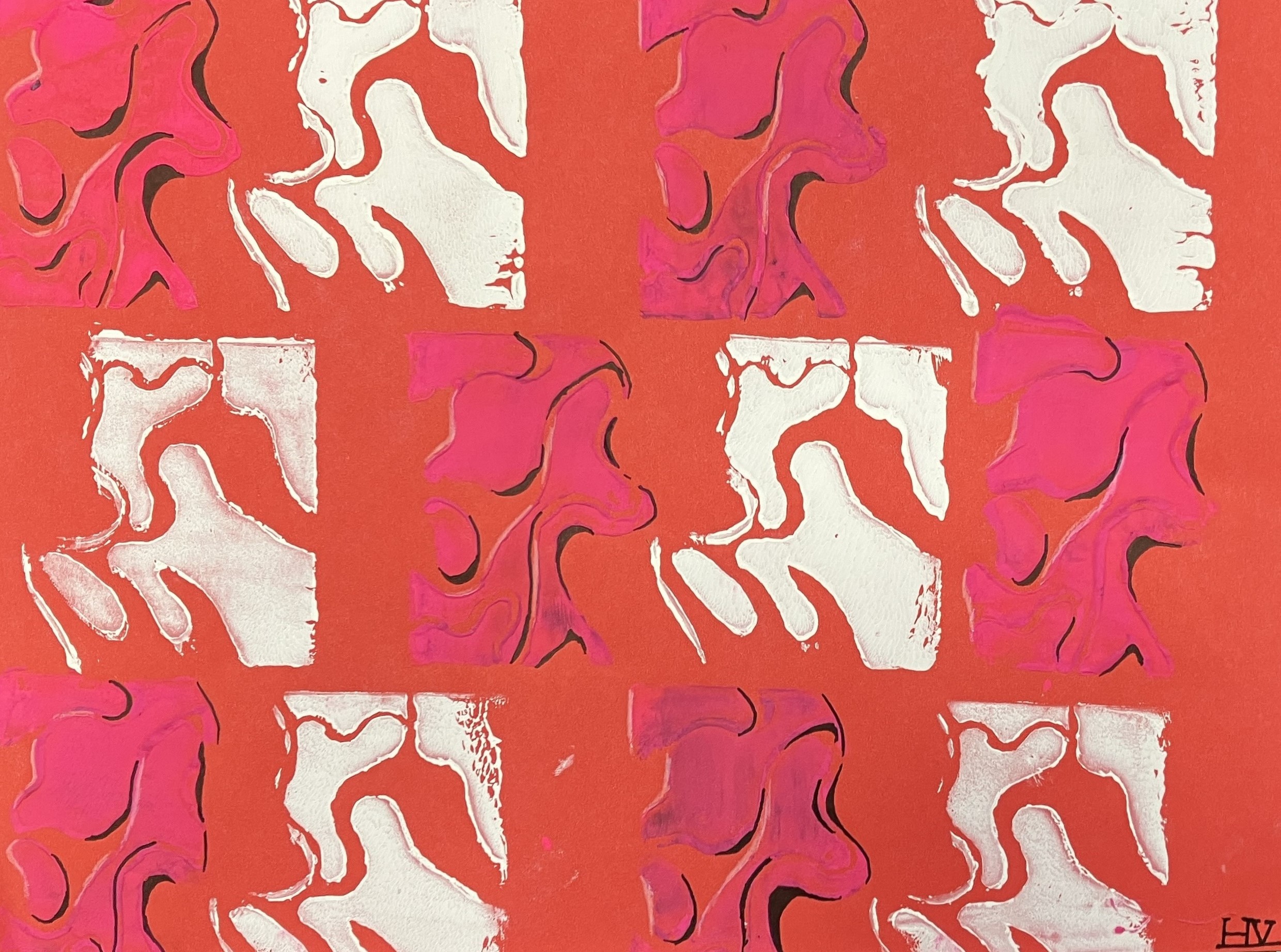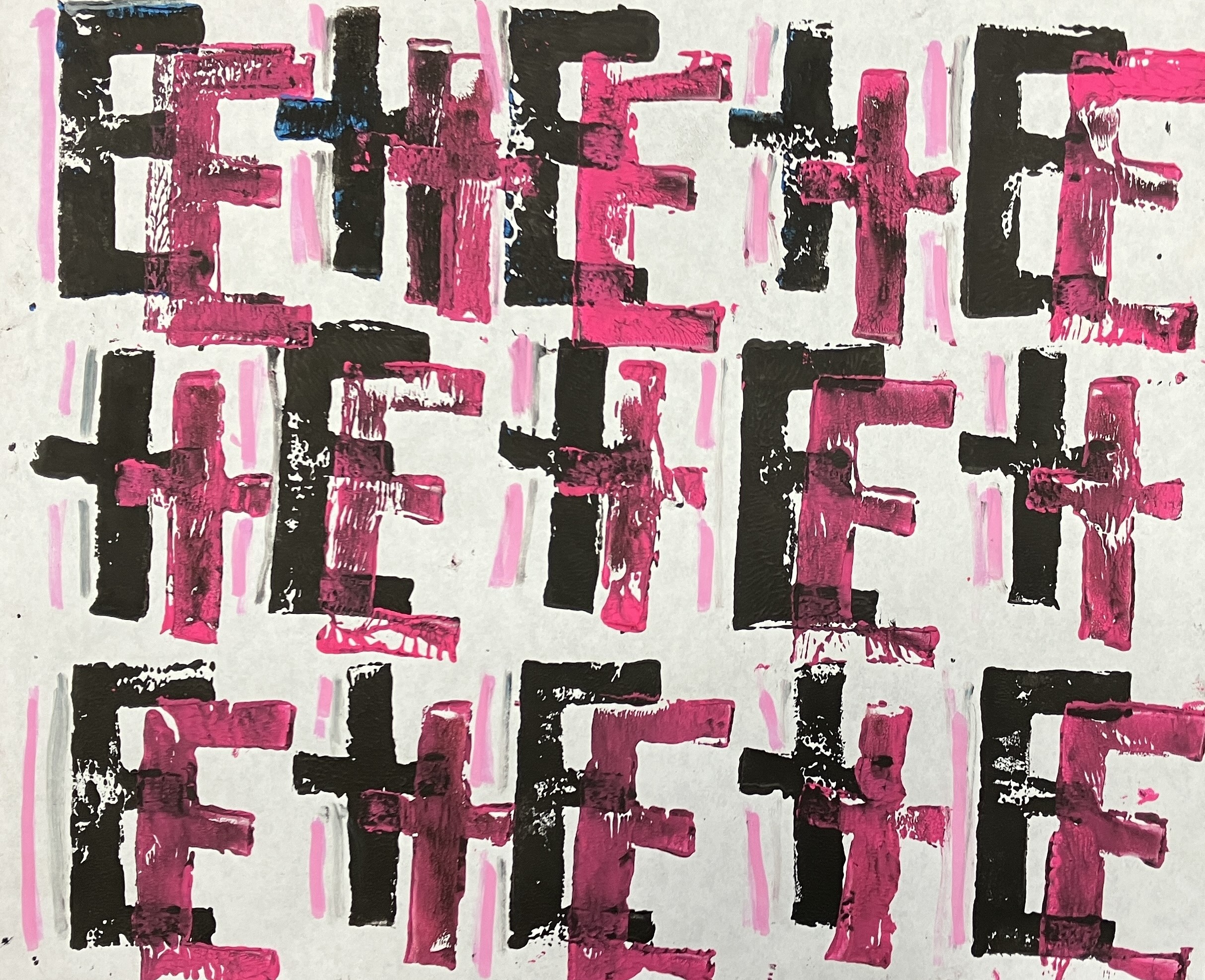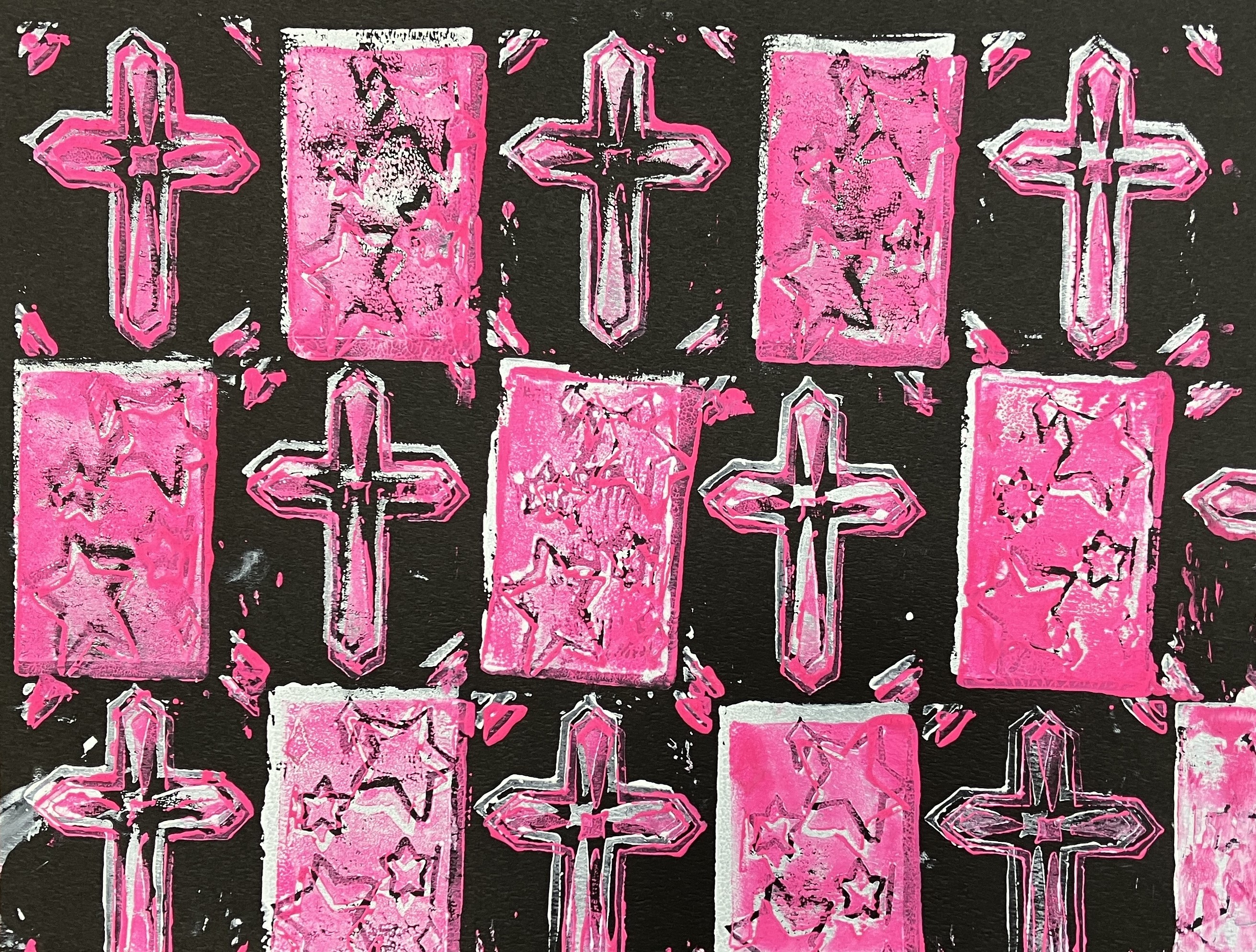 Students focused on pattern and repetition in this project by creating two linocut stamps.